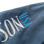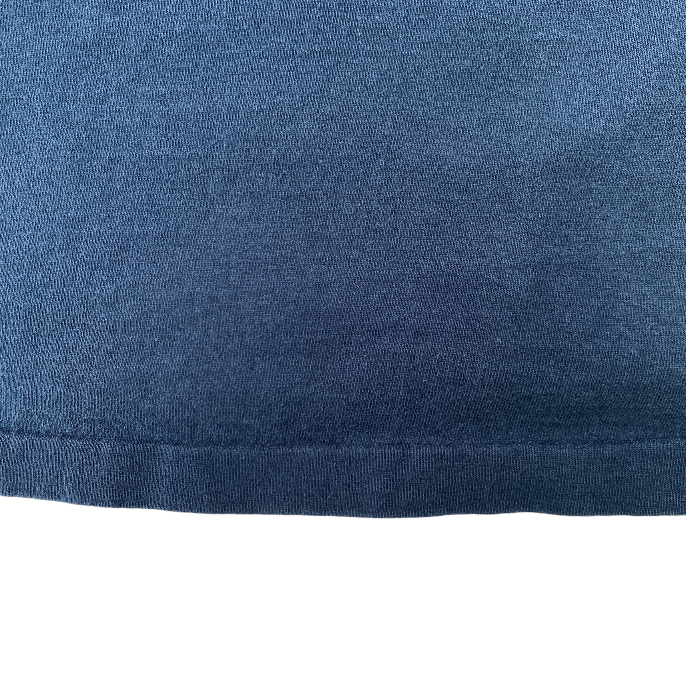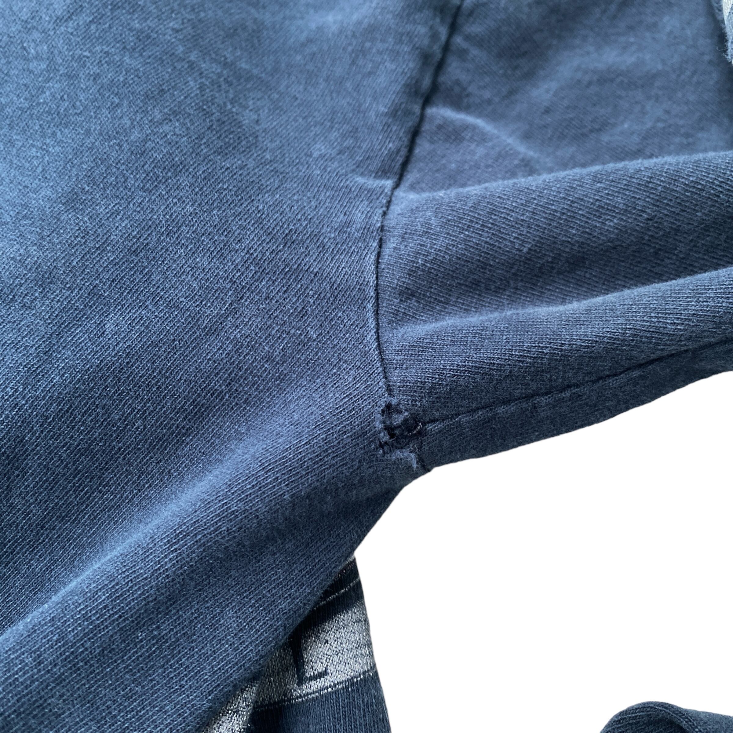 フェードしたネイビーボディ(画像にブレがありますが、全体画像が一番近いです)に、色目の統一感が素晴らしい両面両袖のフルデコレーションプリント、身幅ゆったり着丈長すぎずなボックスシルエットが非常に格好良い一着。