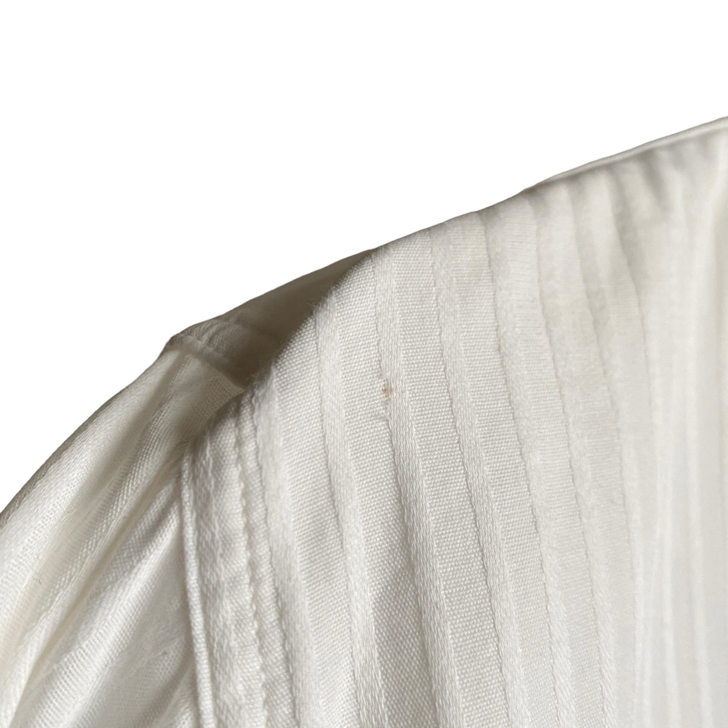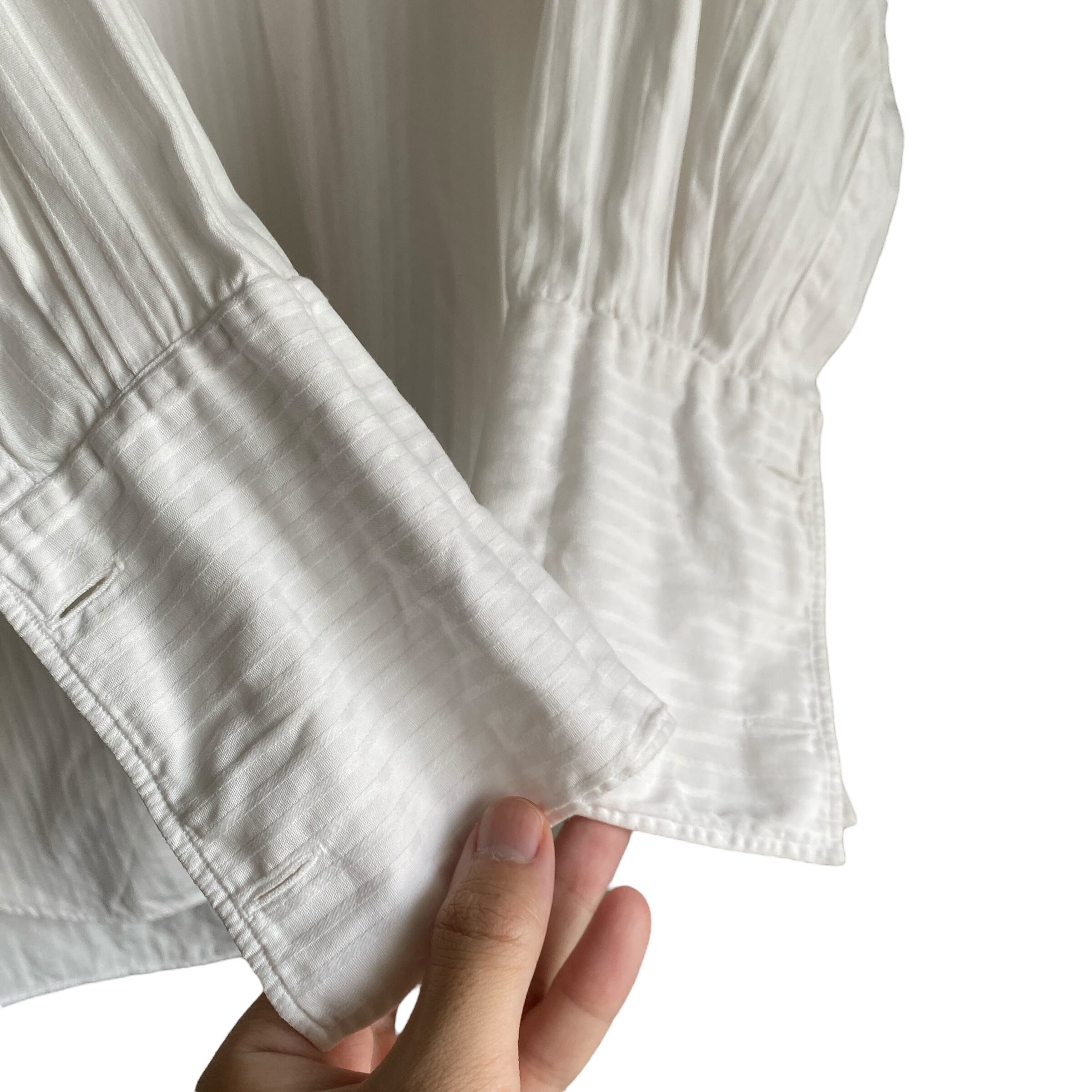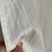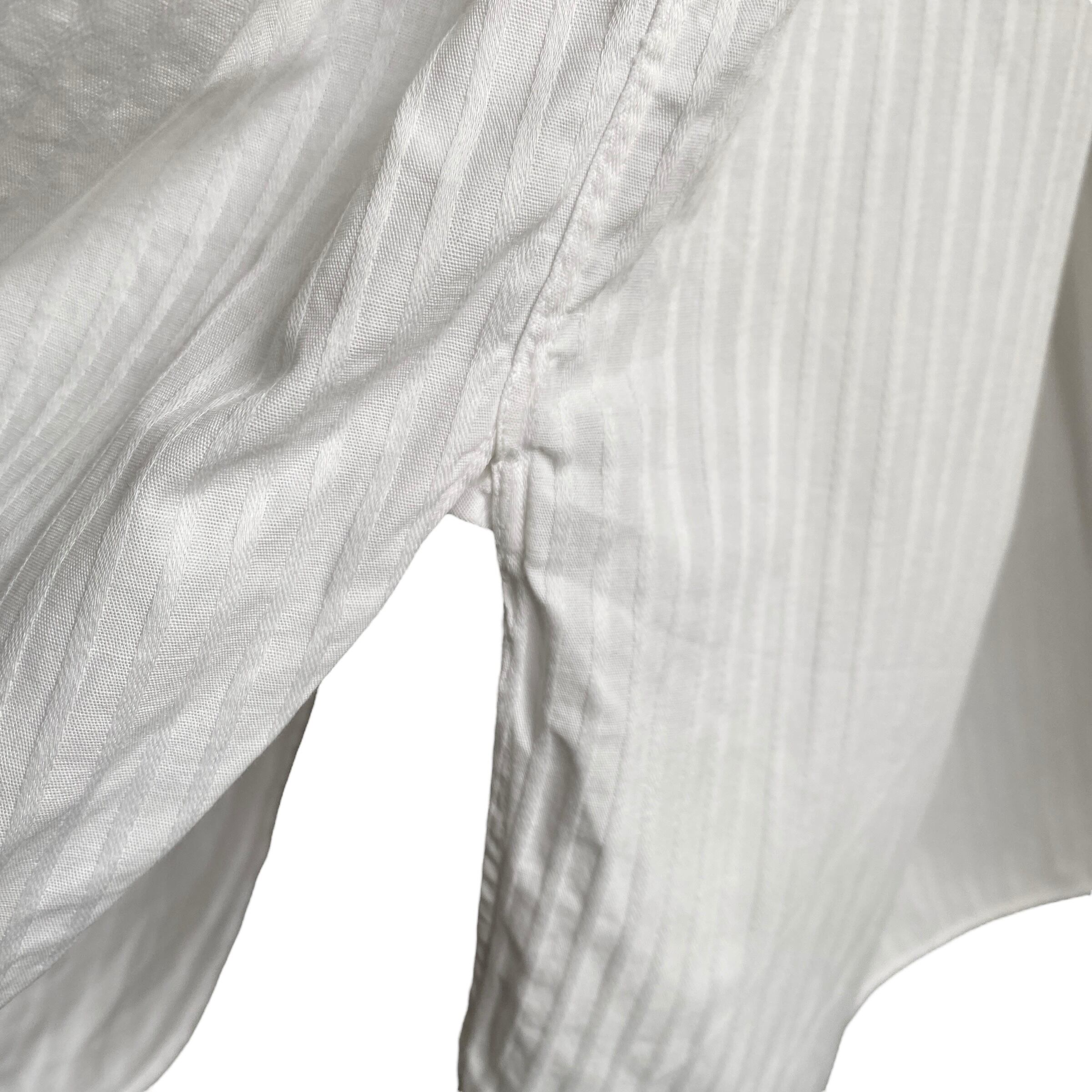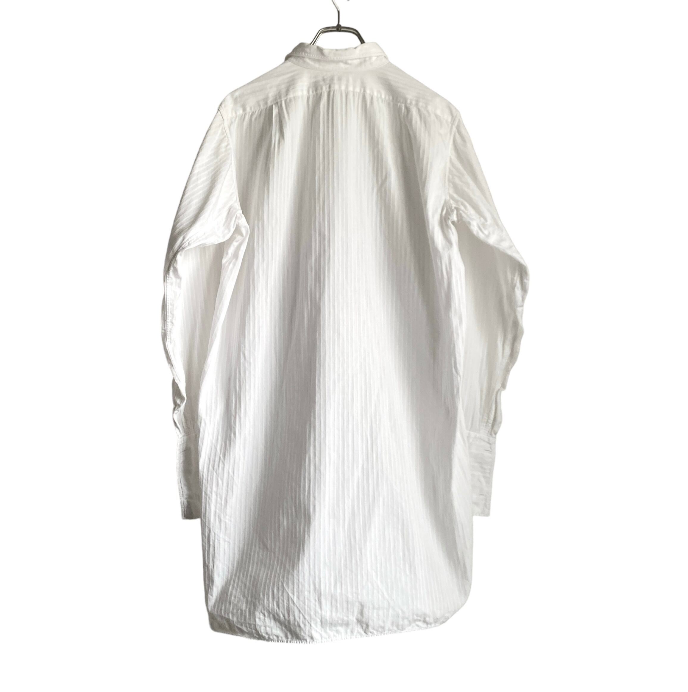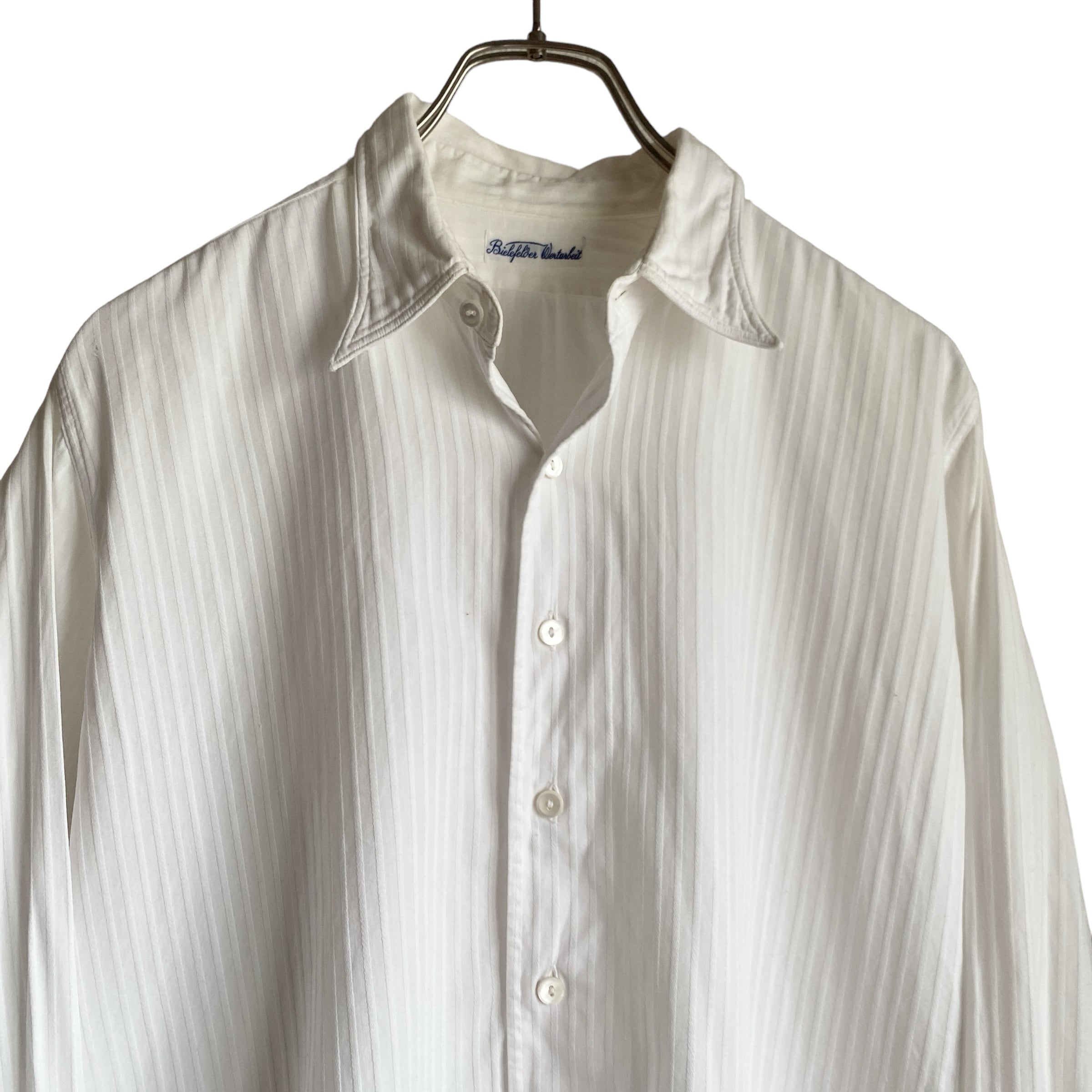 細かなピッチの縫製の美しさはさることながら、高密度ゆえ鈍い光沢感すら感じる織ストライプのコットンブロードクロスの質感、ドレス仕様ならではのやや厚みがあり丁寧に加工されたシェルボタン(この時代の普段着用はもっと荒いボタンです)など、全体的にvintageらしい見どころの詰まった素晴らしいお品です。