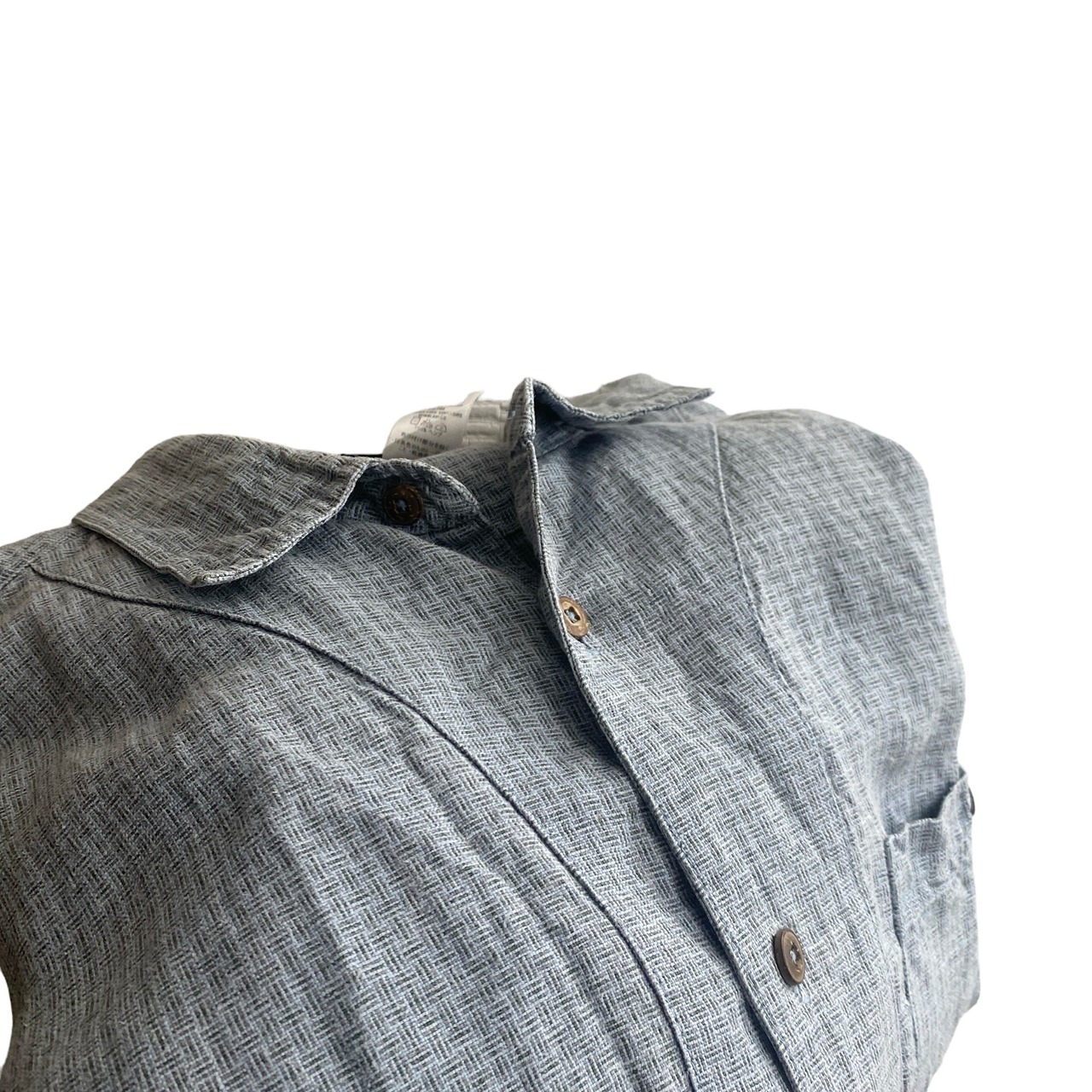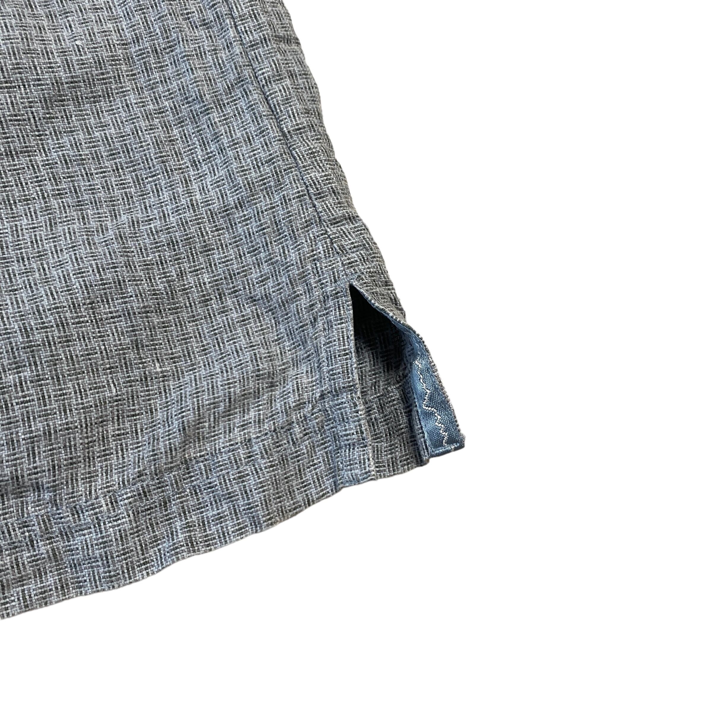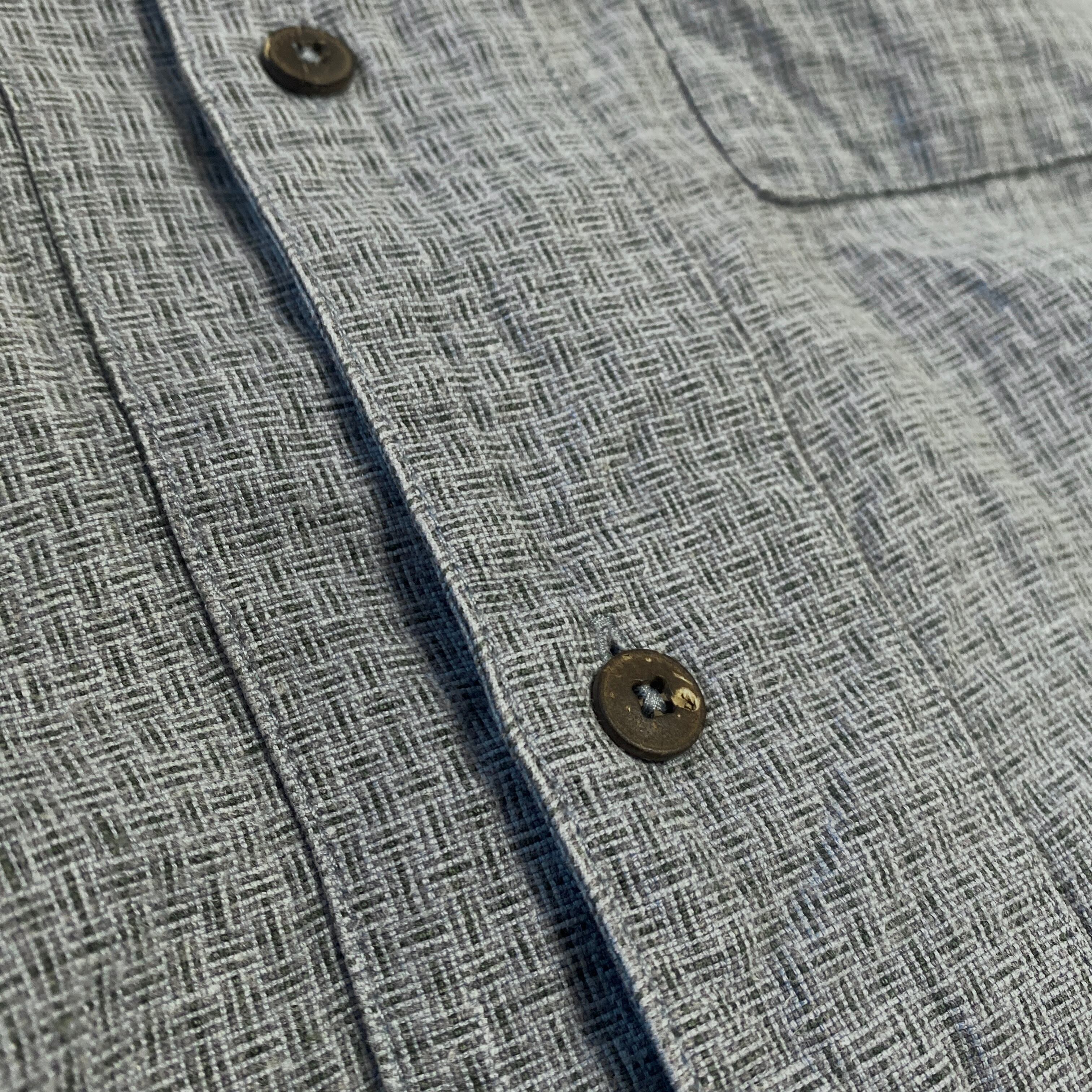 肉厚でプルップルのヘンプリネン生地に、格子柄のような若干のアクセントがついた、気持ち青みのあるグレーカラー(画像3が近いです)、ゆったりとしたボックスシルエットが非常に格好良い一着。