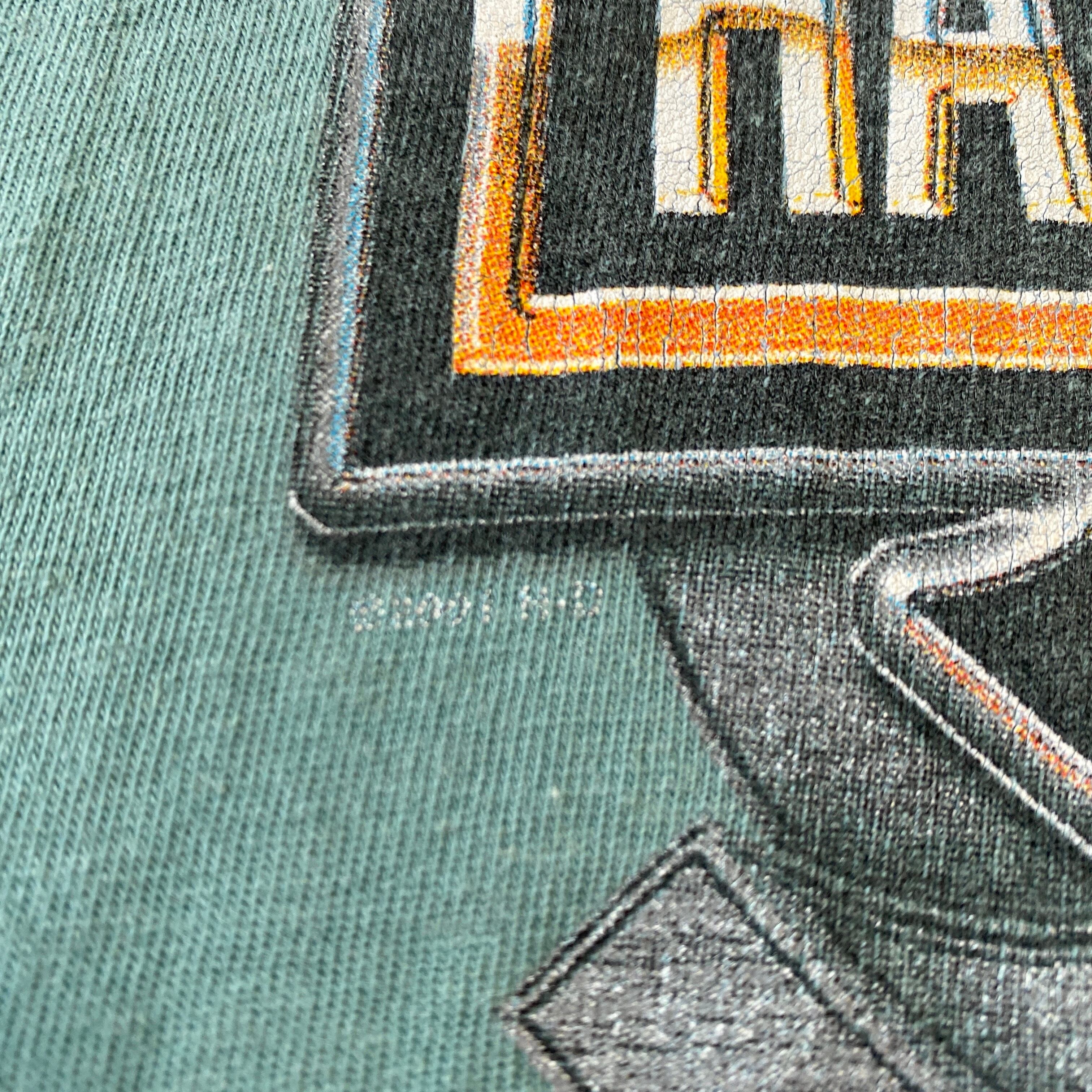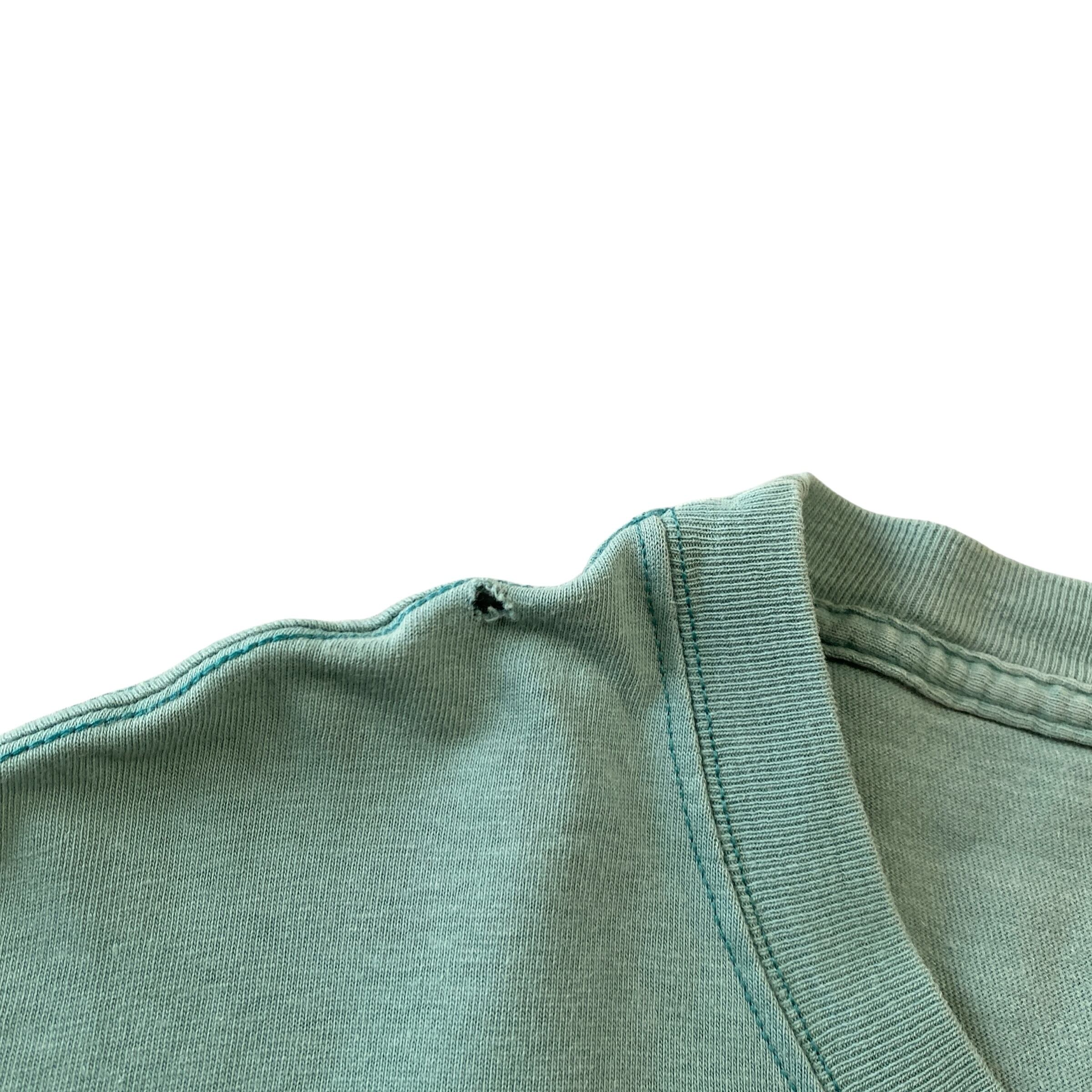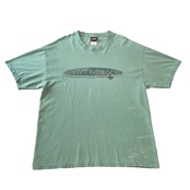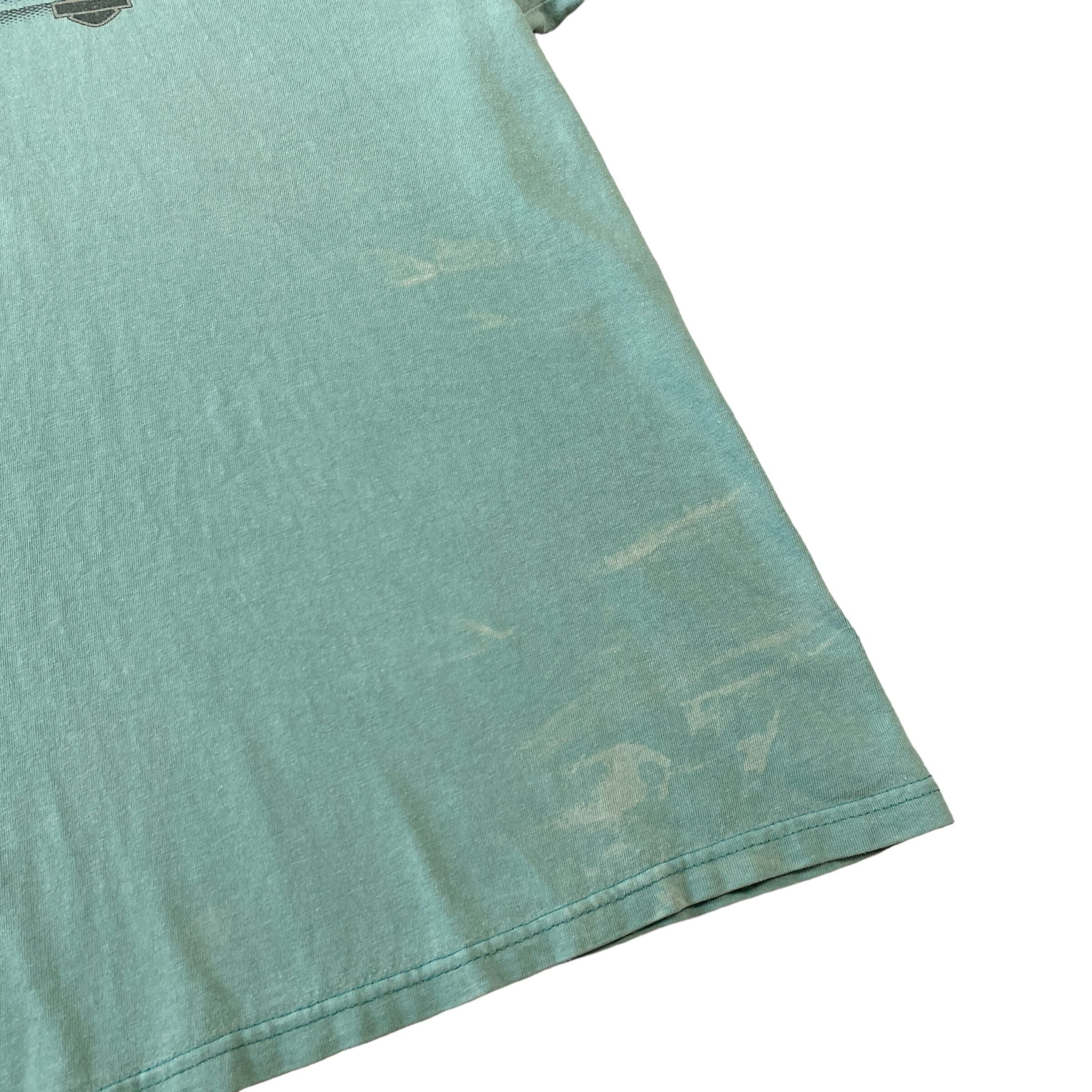 くすんだサーフグリーン系の色目が退色したボディ(画像にブレがありますが、全体画像が一番近いです)に、ロゴや文字のみのシンプルなプリント、身幅ゆったり着丈長すぎずなボックスシルエットが非常に格好良い一着。