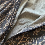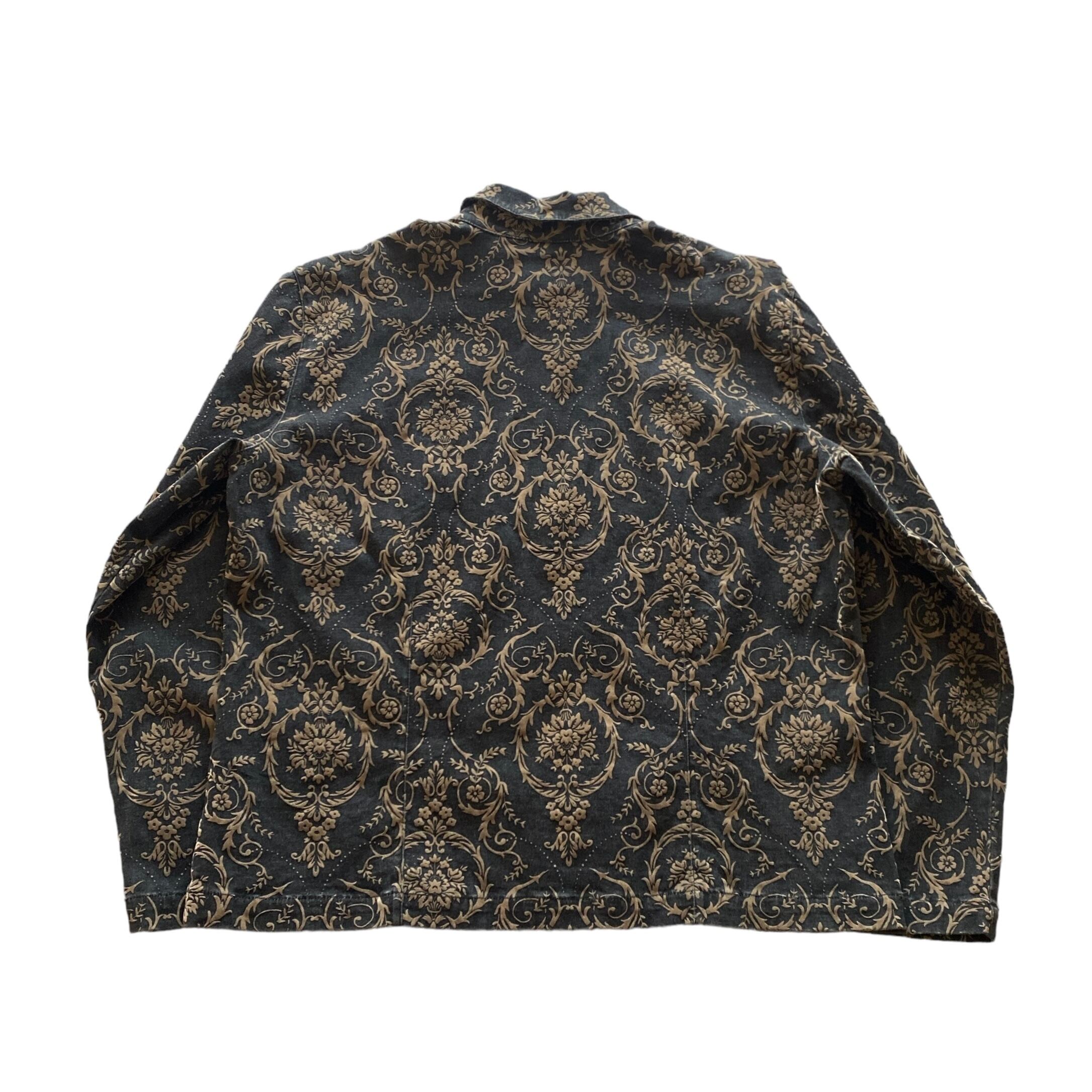 ほんのりフェードしたブラックのライトオンス目なストレッチデニム地に、フロッキーの総柄ボタニカルプリント、短丈ボックス目なシルエットが非常に格好良い一着。