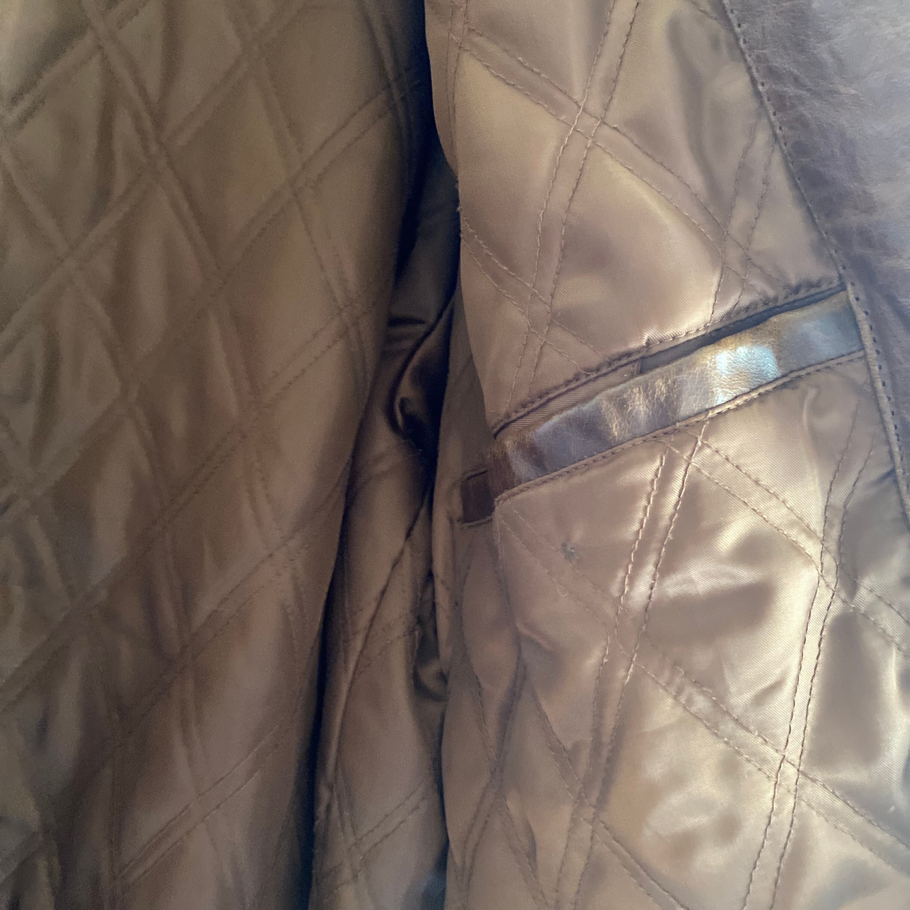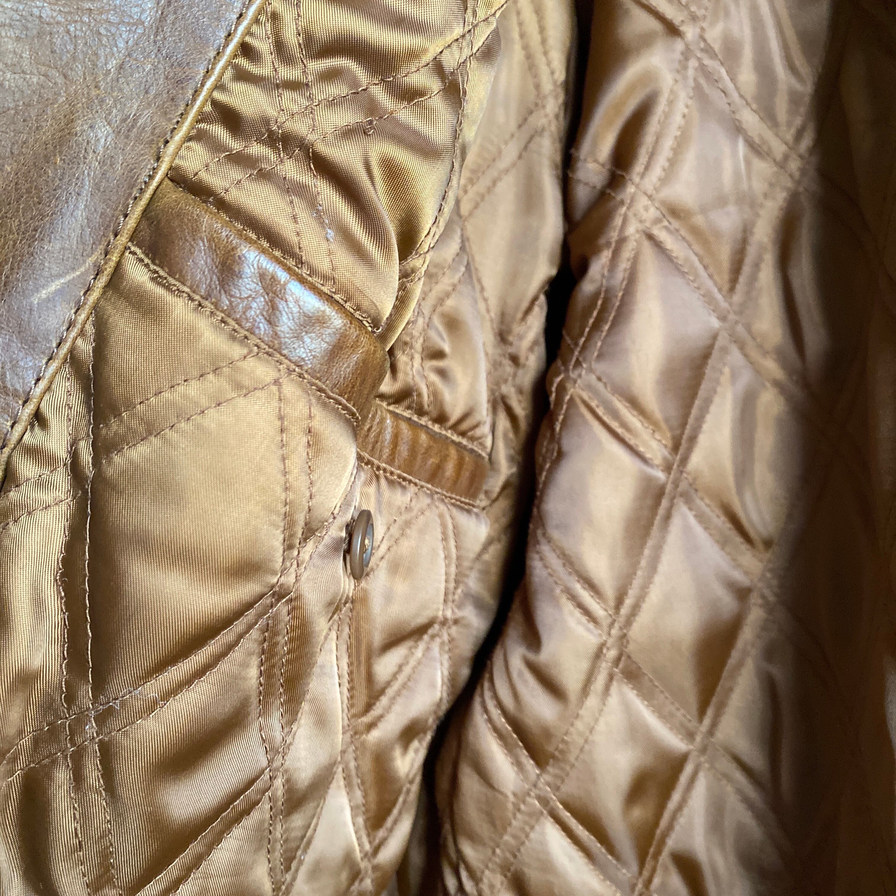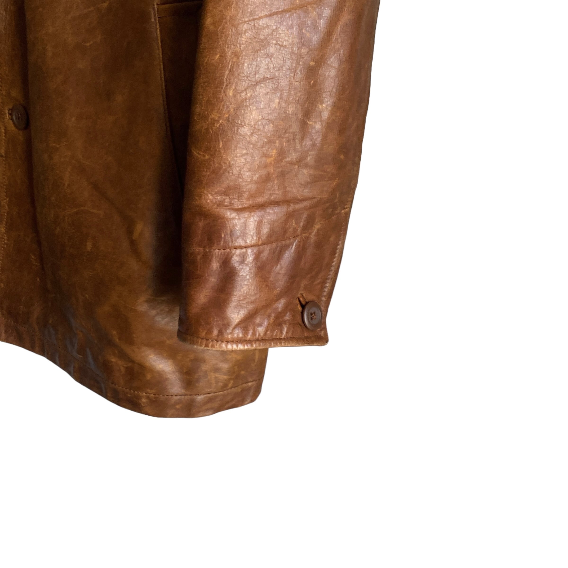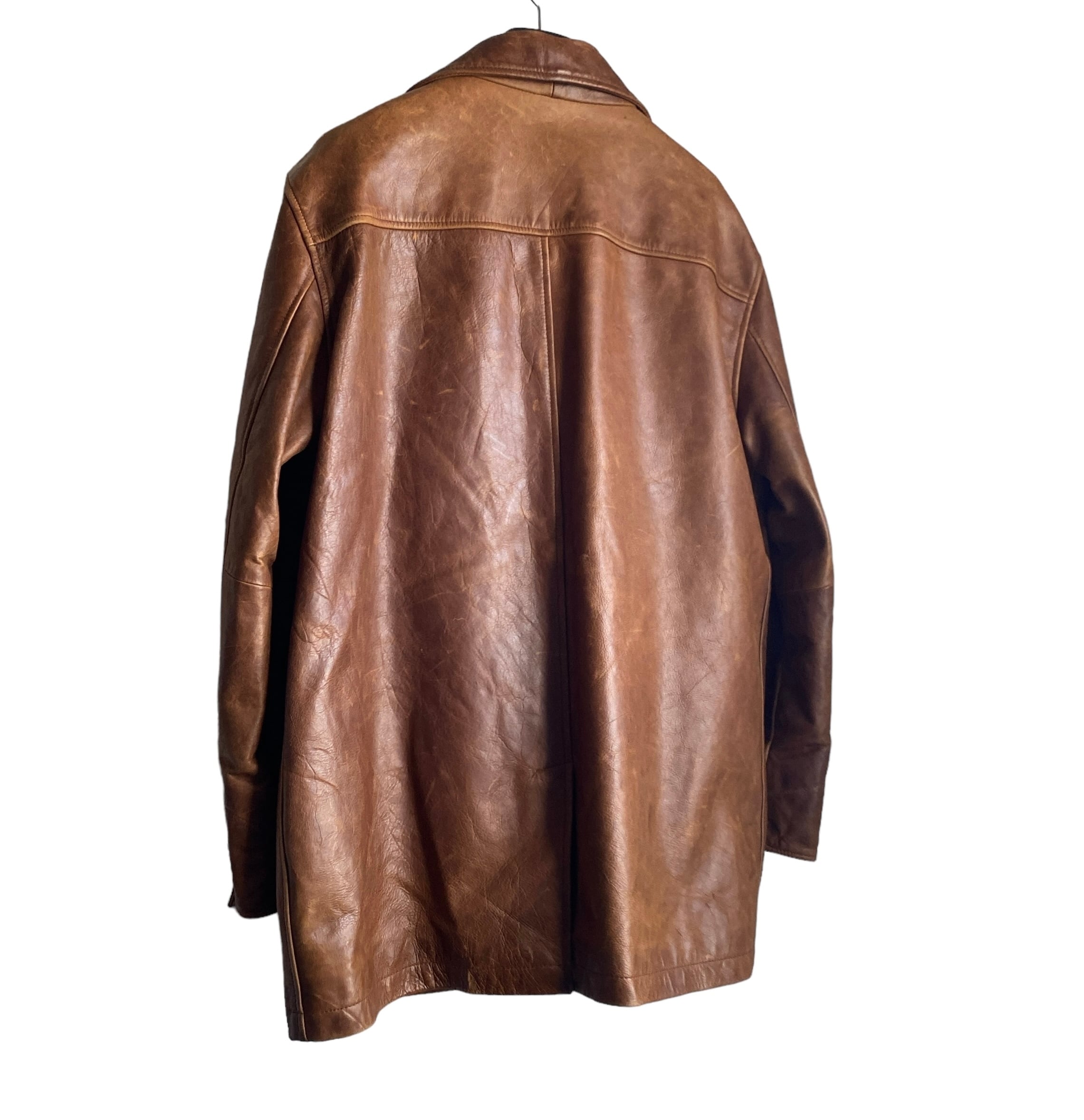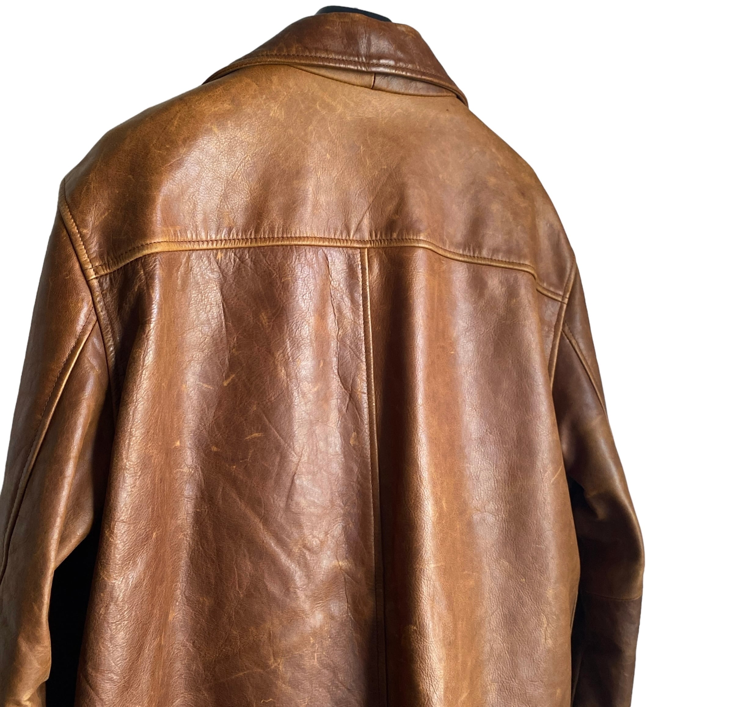 肉厚で上質なレザー(おそらくカウ)に、経年でほんのりムラ感の出たブラウンカラーが非常に格好良い一着。