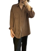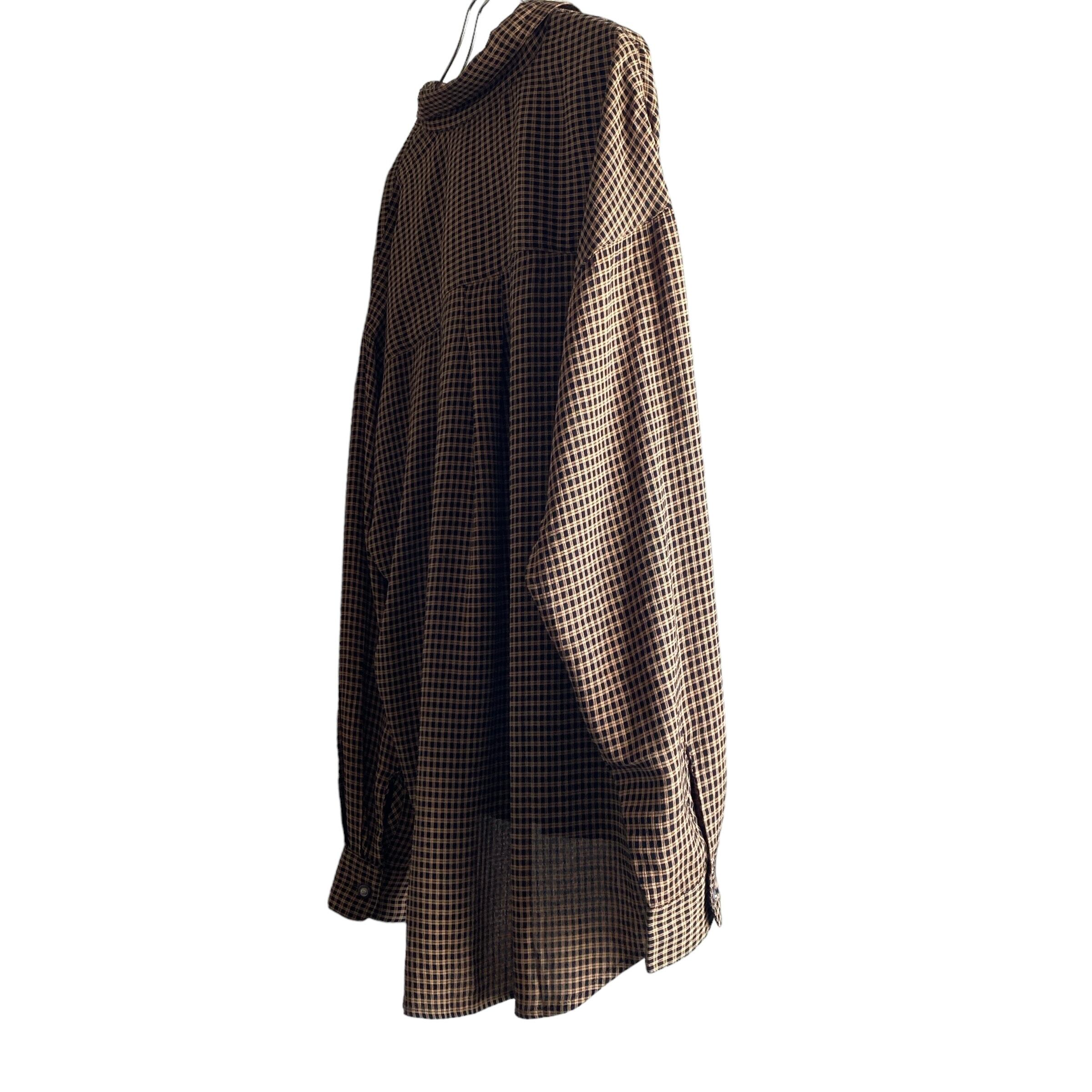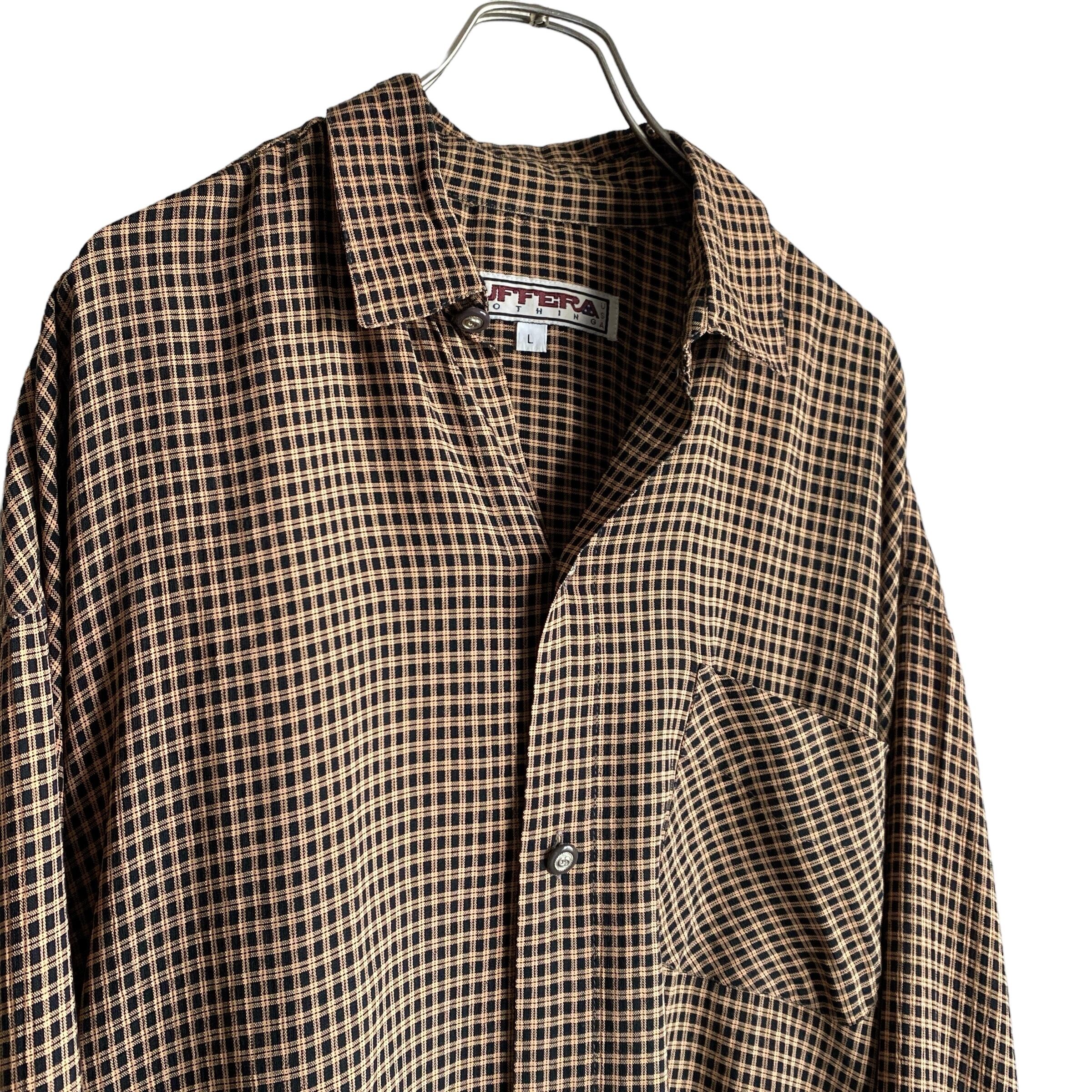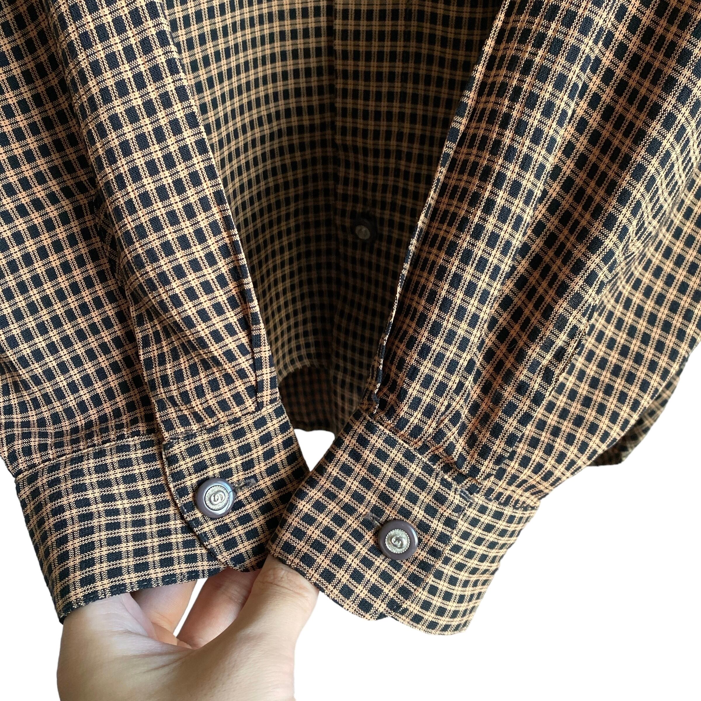 ややシャリ感がありつつとろみのある上質なアセテートレーヨン生地に(品質タグが飛んでいますが、経験上間違いありません)、ブラウン系×ブラックの綺麗な配色のチェック、ガバッと大きめなシルエットが非常に格好良い一着。