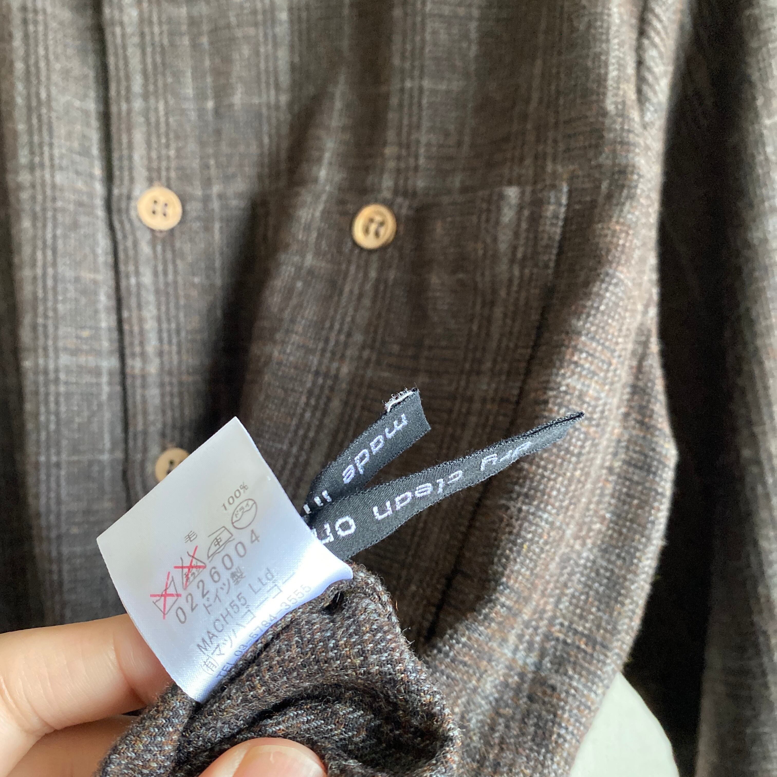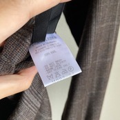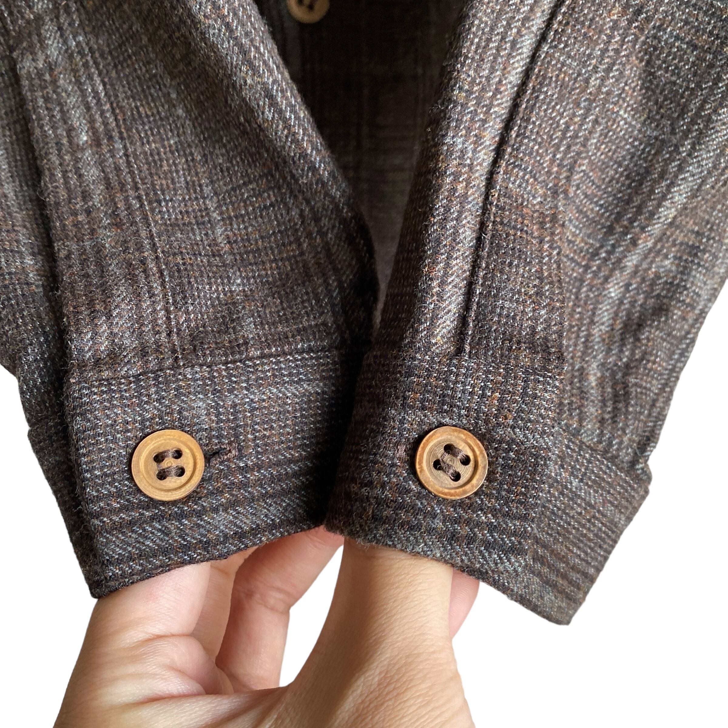 柔らかくコシのある上質なウール素材に、ダークブラウンをベースとした奥行きのあるカラーリング、温かみのあるウッドの削り出しボタンが非常に格好良い一着。