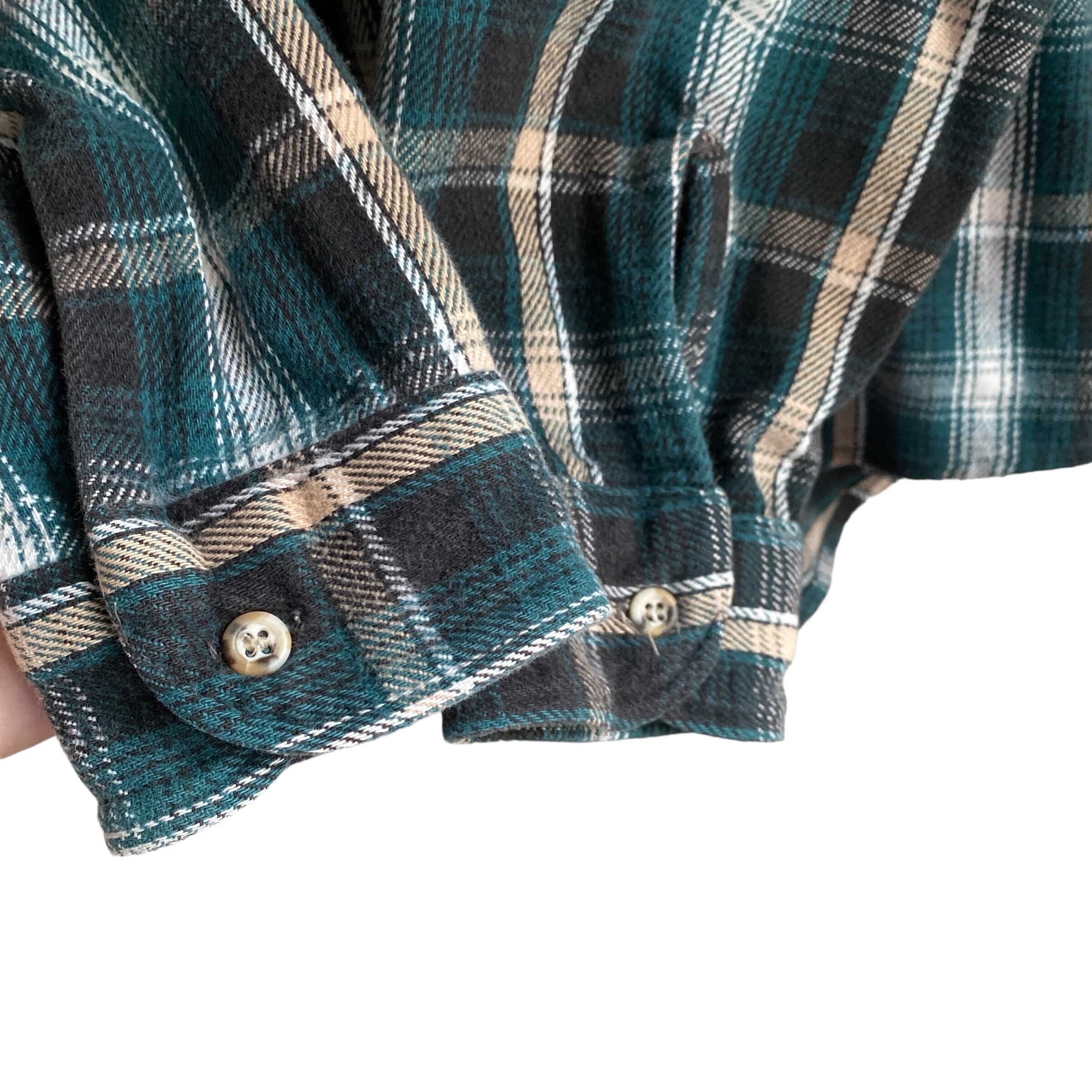 肉厚でモチっとしたコットンネル素材に、グリーン×ブラック×ベージュ×ホワイトの綺麗な色目のオンブレチェックが非常に格好良い一着。
