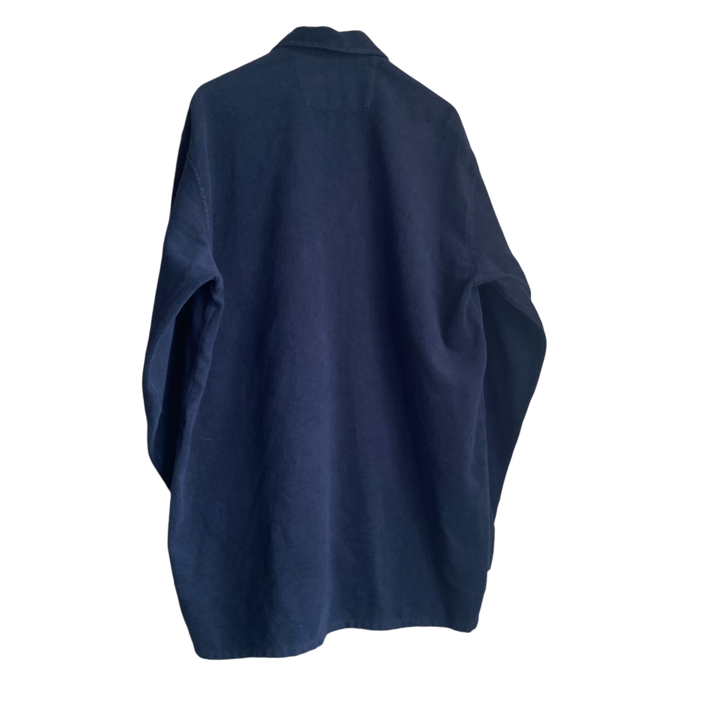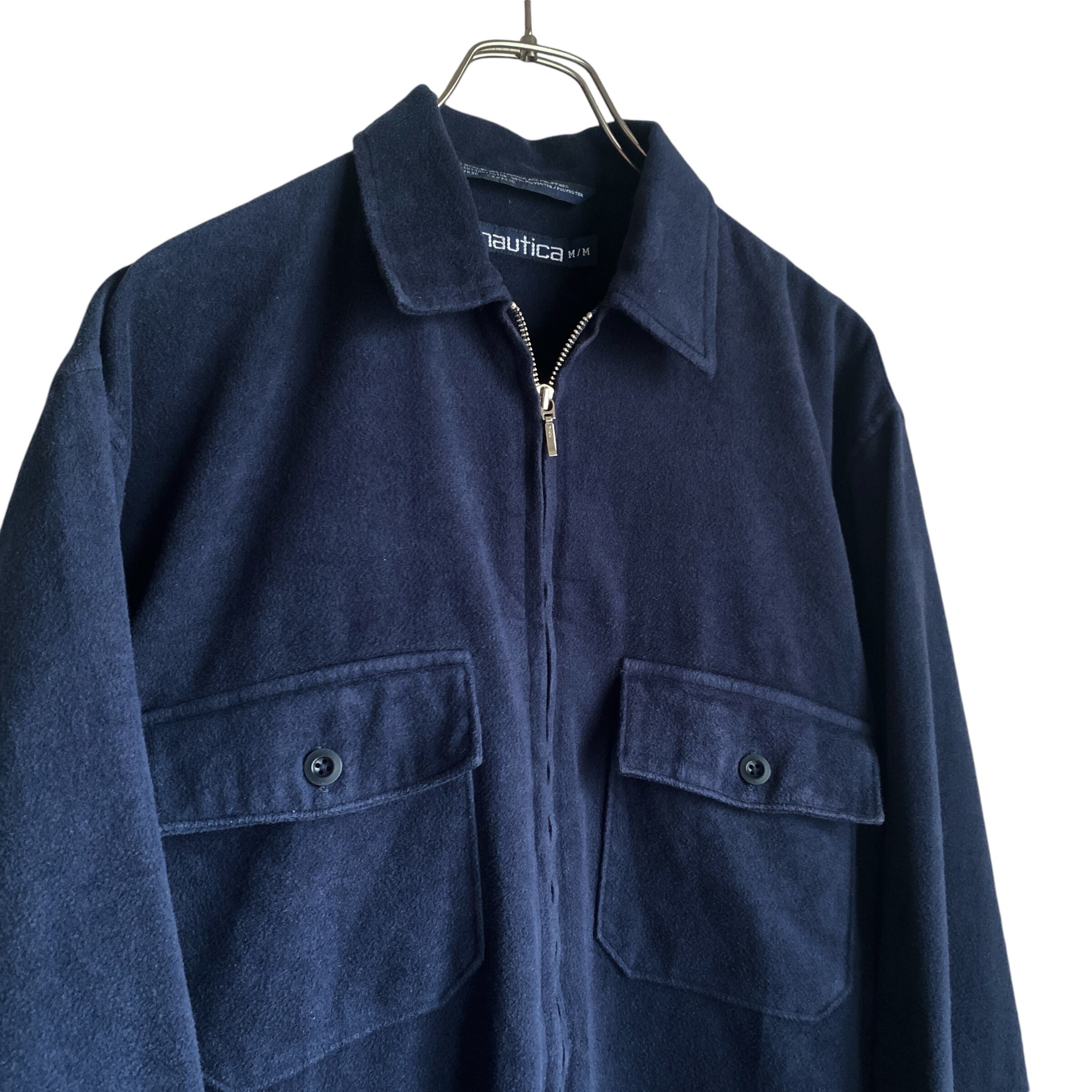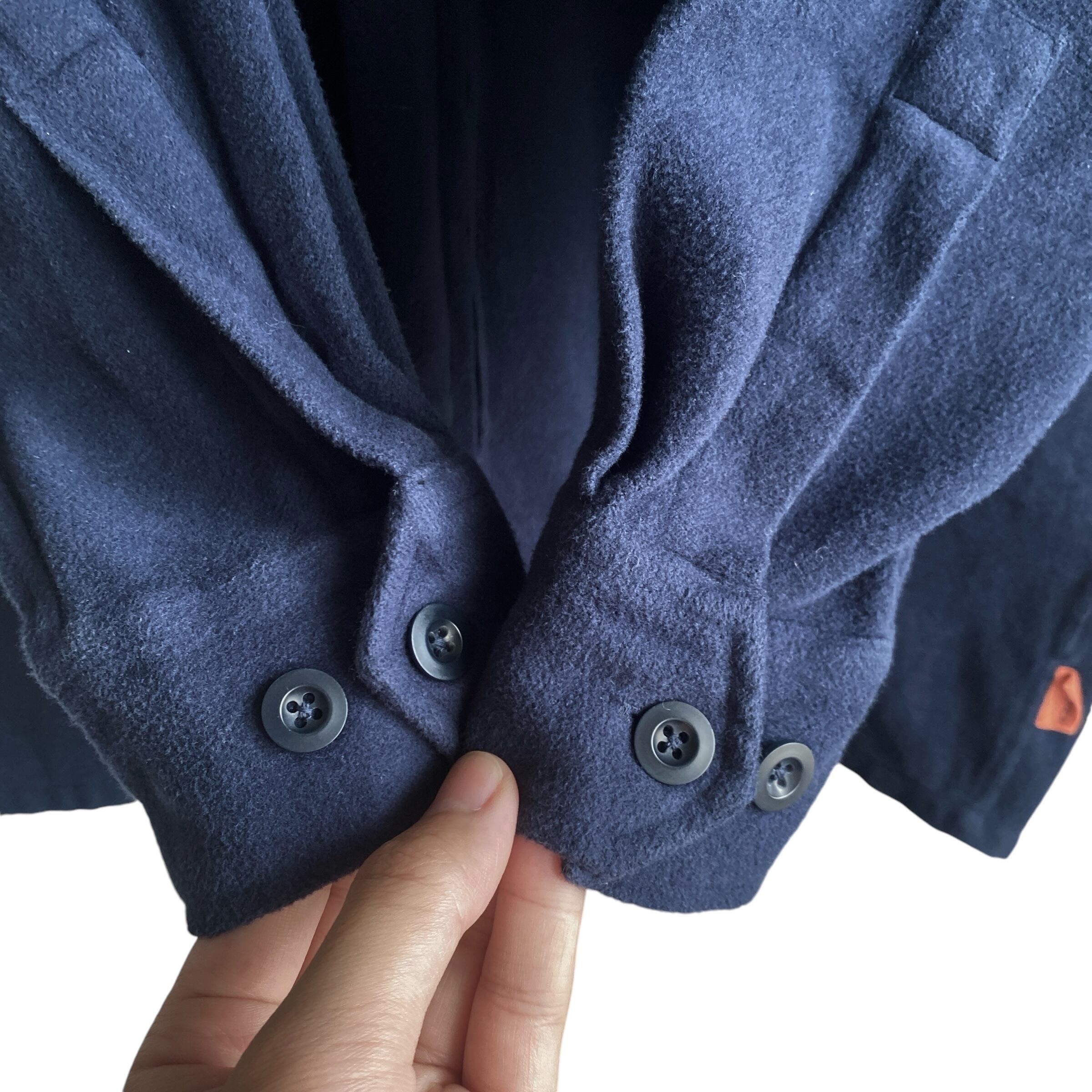 フリースとシャモアの間のような少し硬めで起毛感のある上質な生地感に、ダークネイビーの上品な色目が非常に格好良い一着。