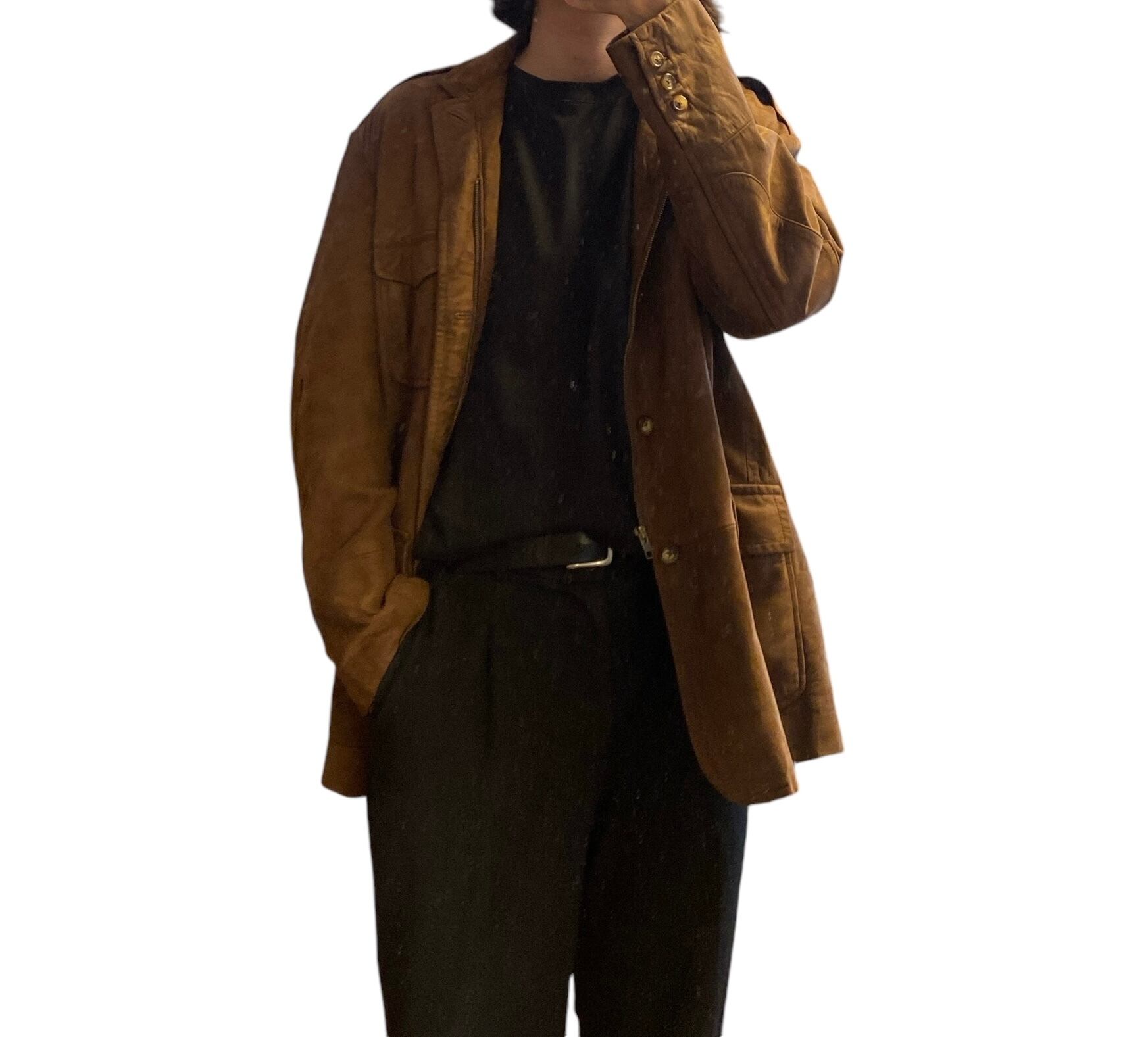 肉厚で非常に柔らかい上質なレザー素材に、ミリタリージャケットのような無骨なディテールが非常に格好良い一着。