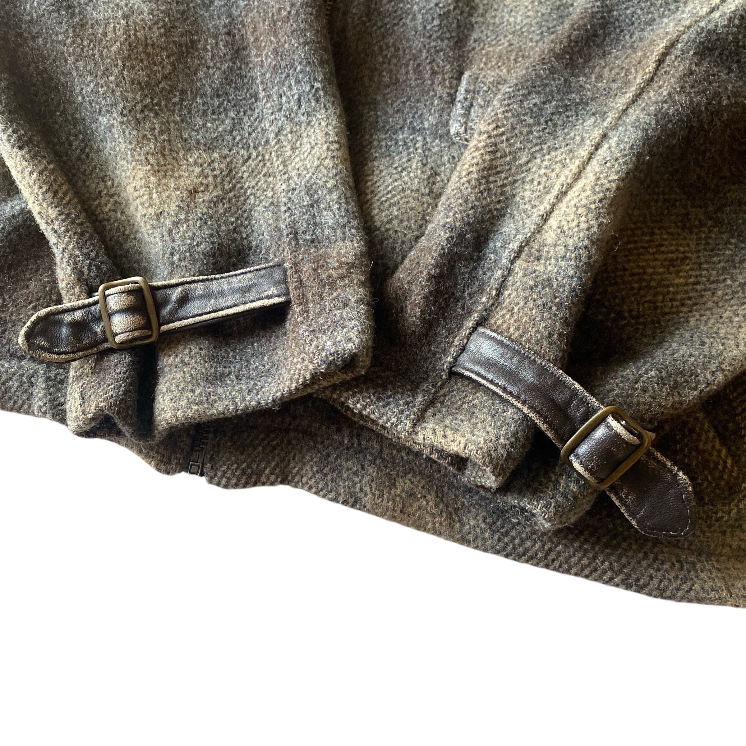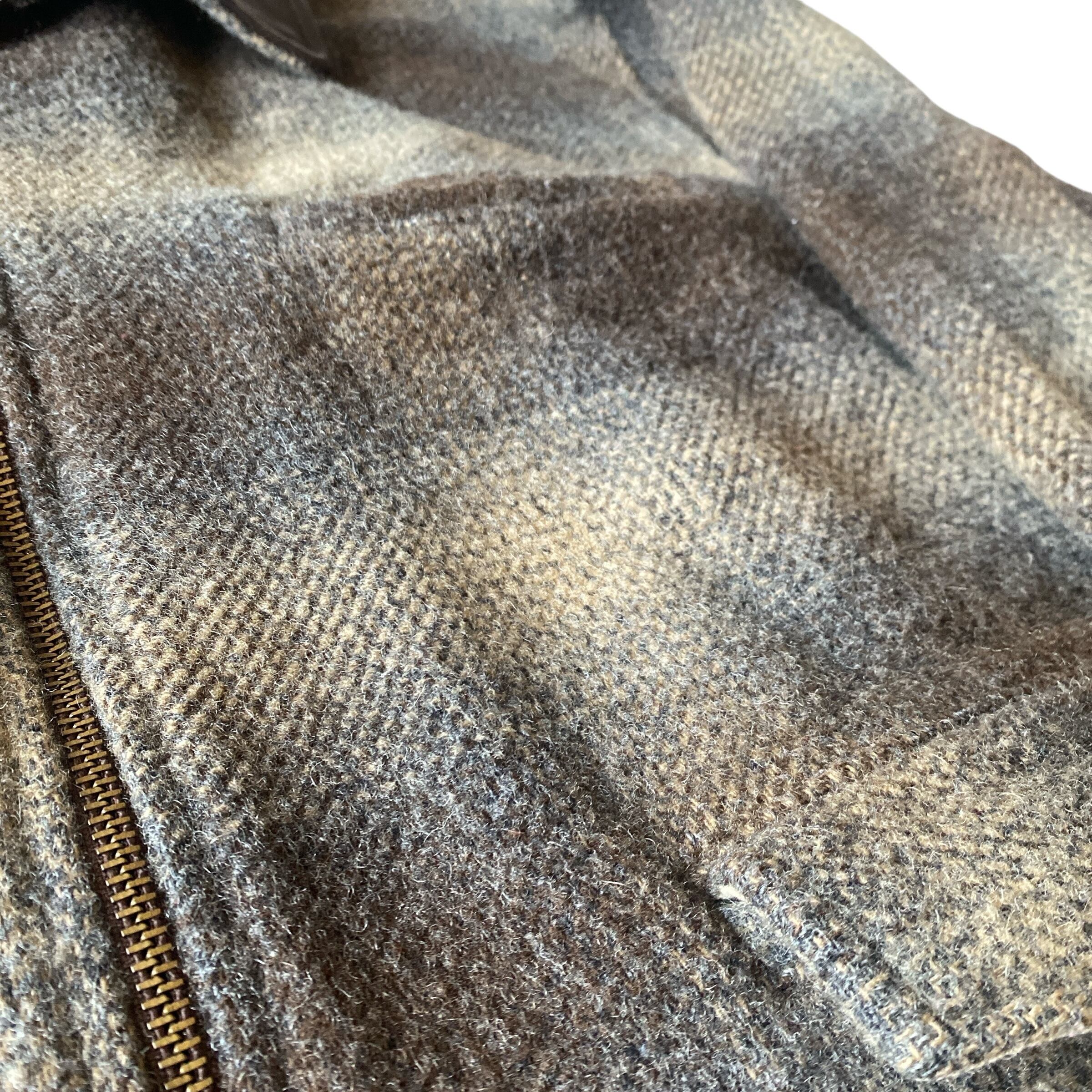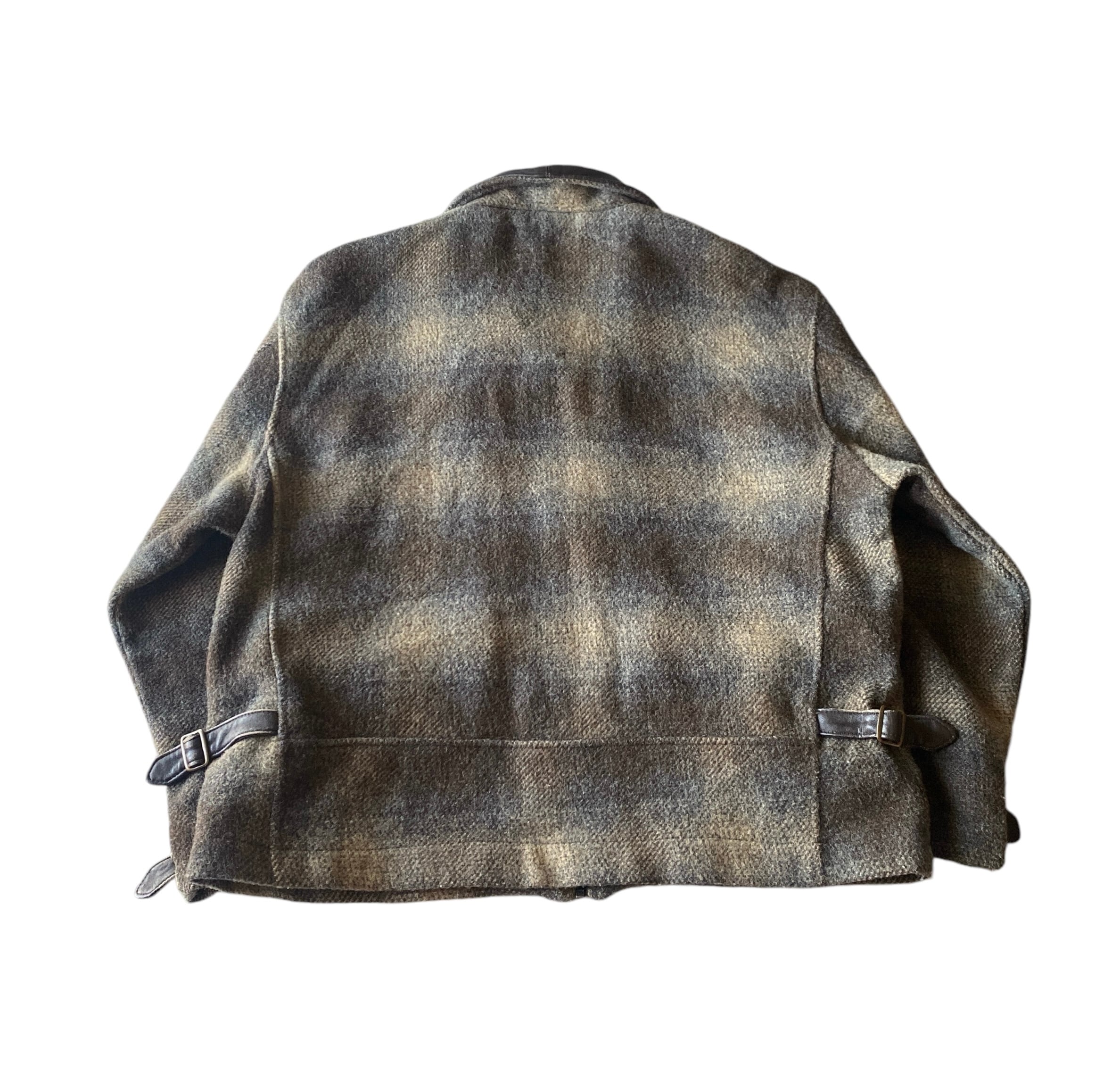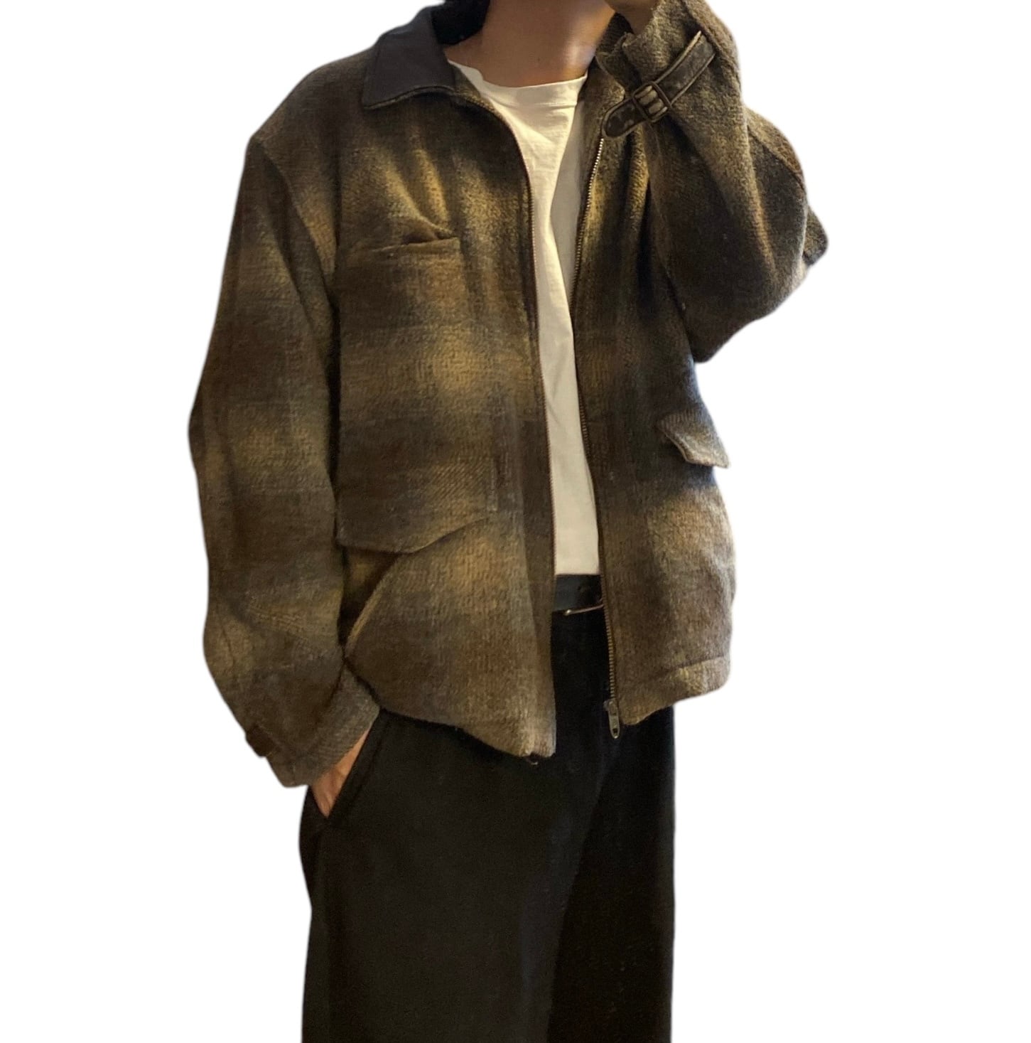 肉厚でモチっとしたウール生地に、レザーのトリム、真鍮のロケットtalonジッパー、ブラウンベースの上品なオンブレチェックパターンが非常に格好良い一着。