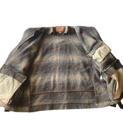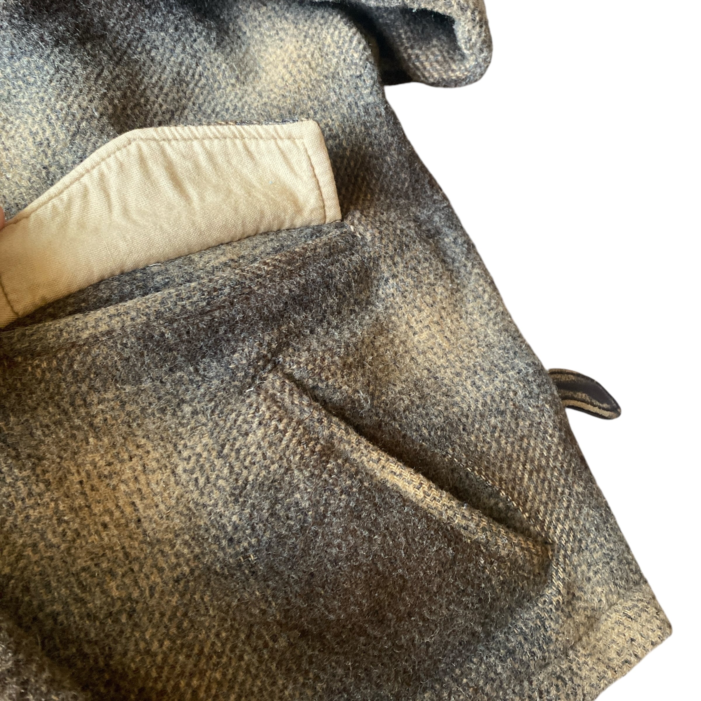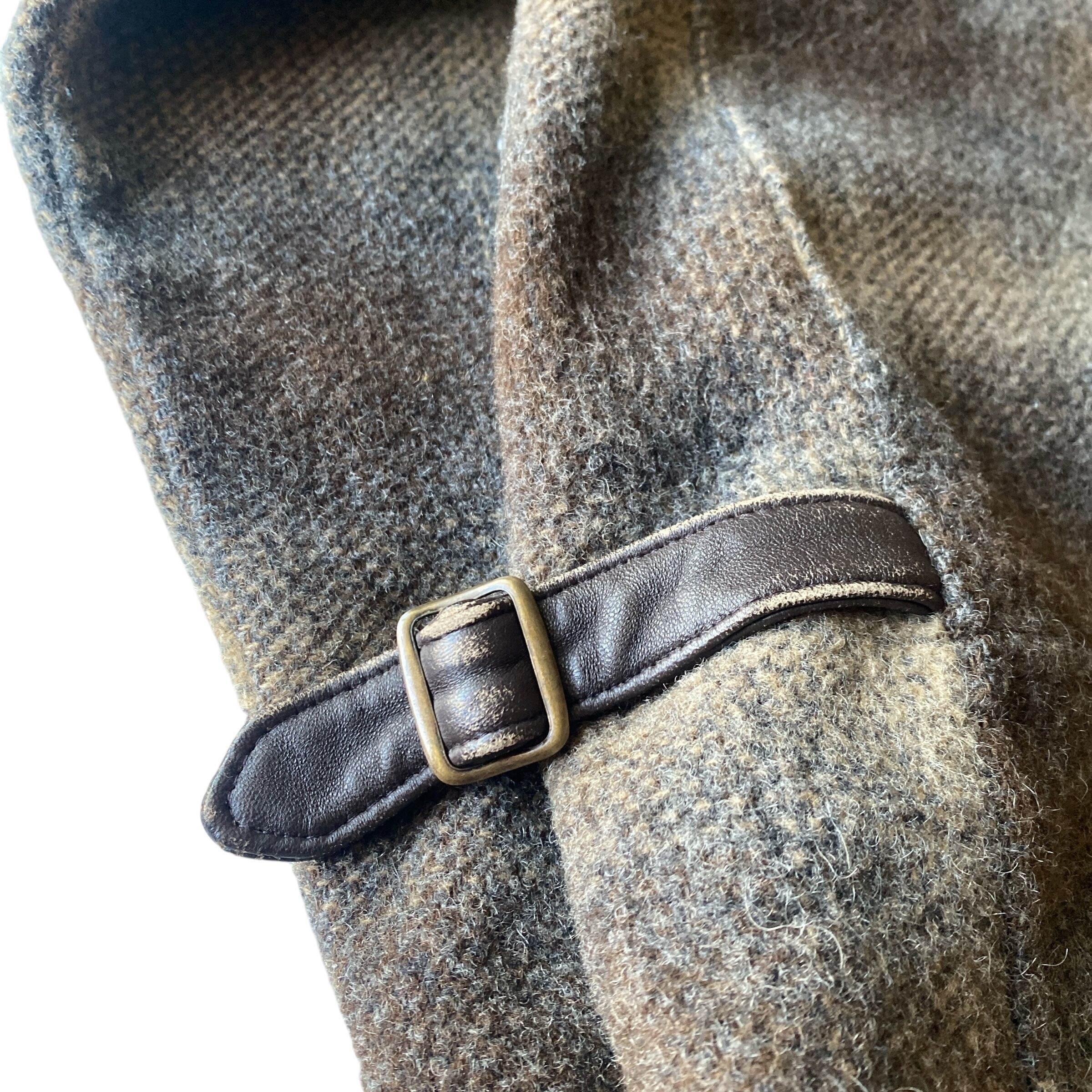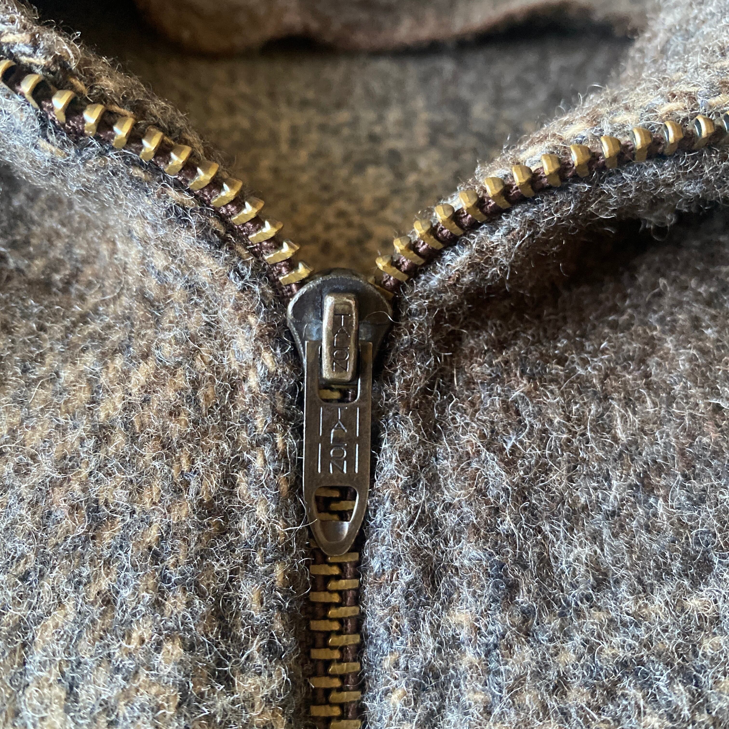 肉厚でモチっとしたウール生地に、レザーのトリム、真鍮のロケットtalonジッパー、ブラウンベースの上品なオンブレチェックパターンが非常に格好良い一着。
