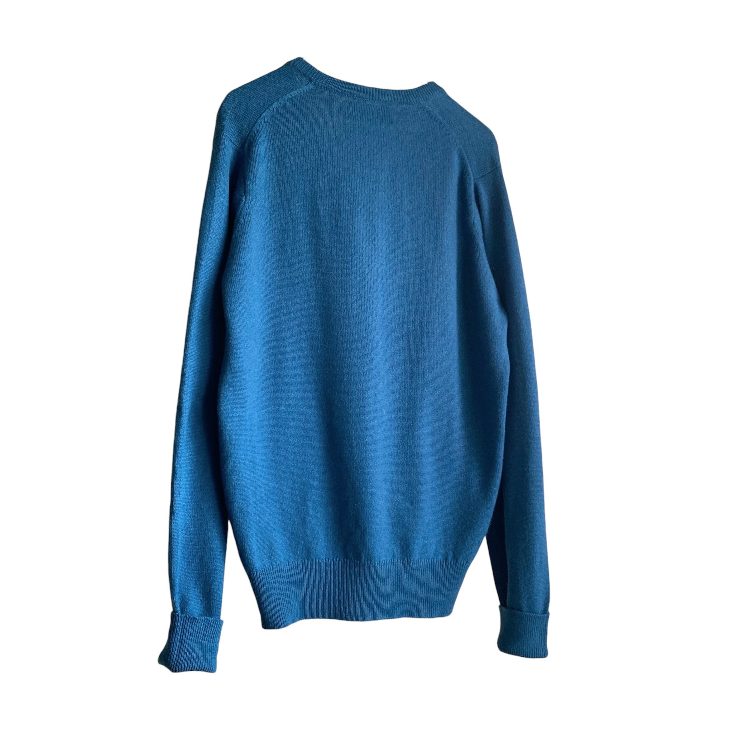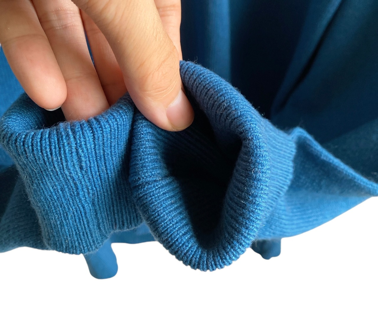 3plyの太めの糸が使用された、目の詰まった硬さのある(とはいえもちろんしなやかです)肉厚な質感に、上品なくすみブルーカラー(ある程度寄せていますが、もう少し綺麗な色目です)が素晴らしい一着。