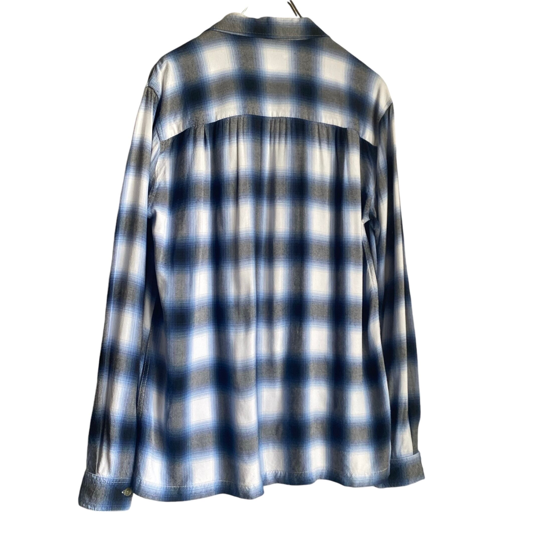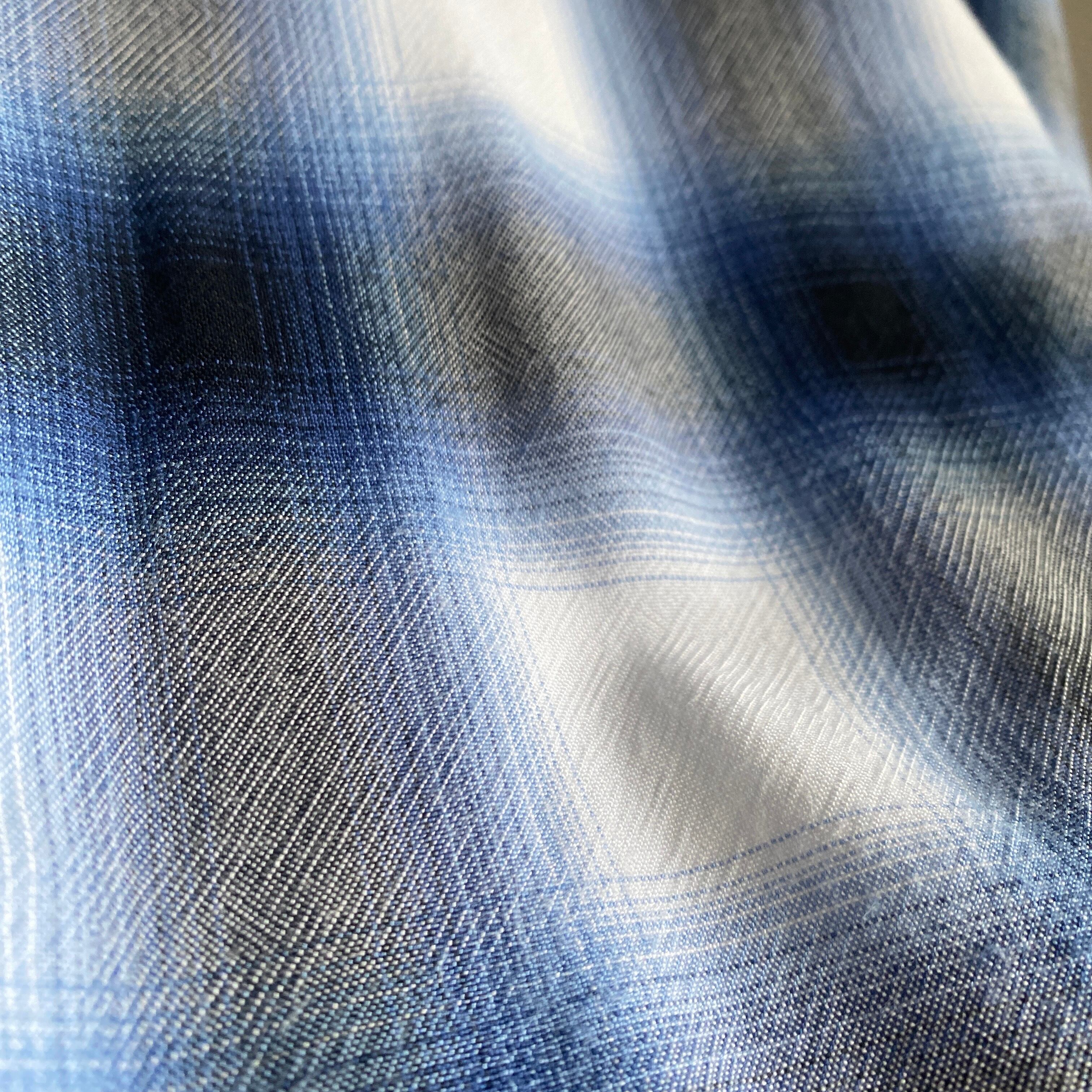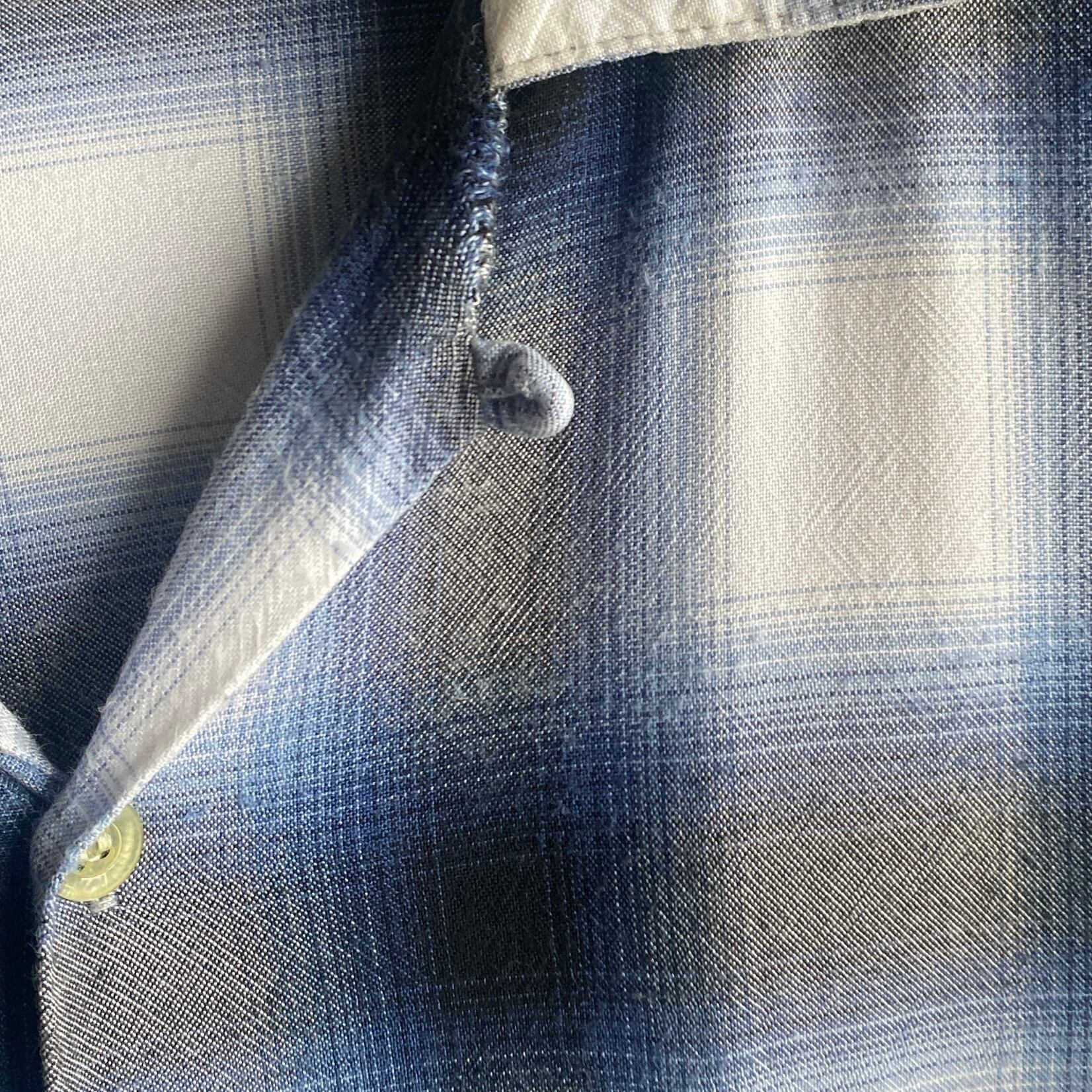 ヴィンテージのオンブレチェックの中でも非常に人気の高い、ブルー×ホワイト×ブラックのチェックパターン、柔らかくとろみがあり、織柄のようにも見える雰囲気の良い生地感、縮みが少なくバランスの良いサイズ感など、条件が揃った非常に素晴らしい一着。