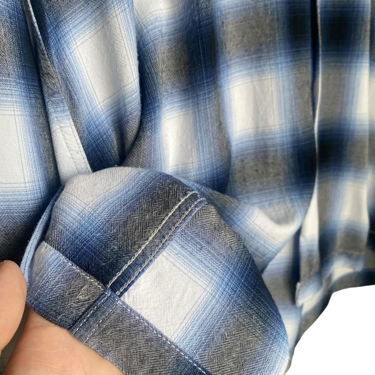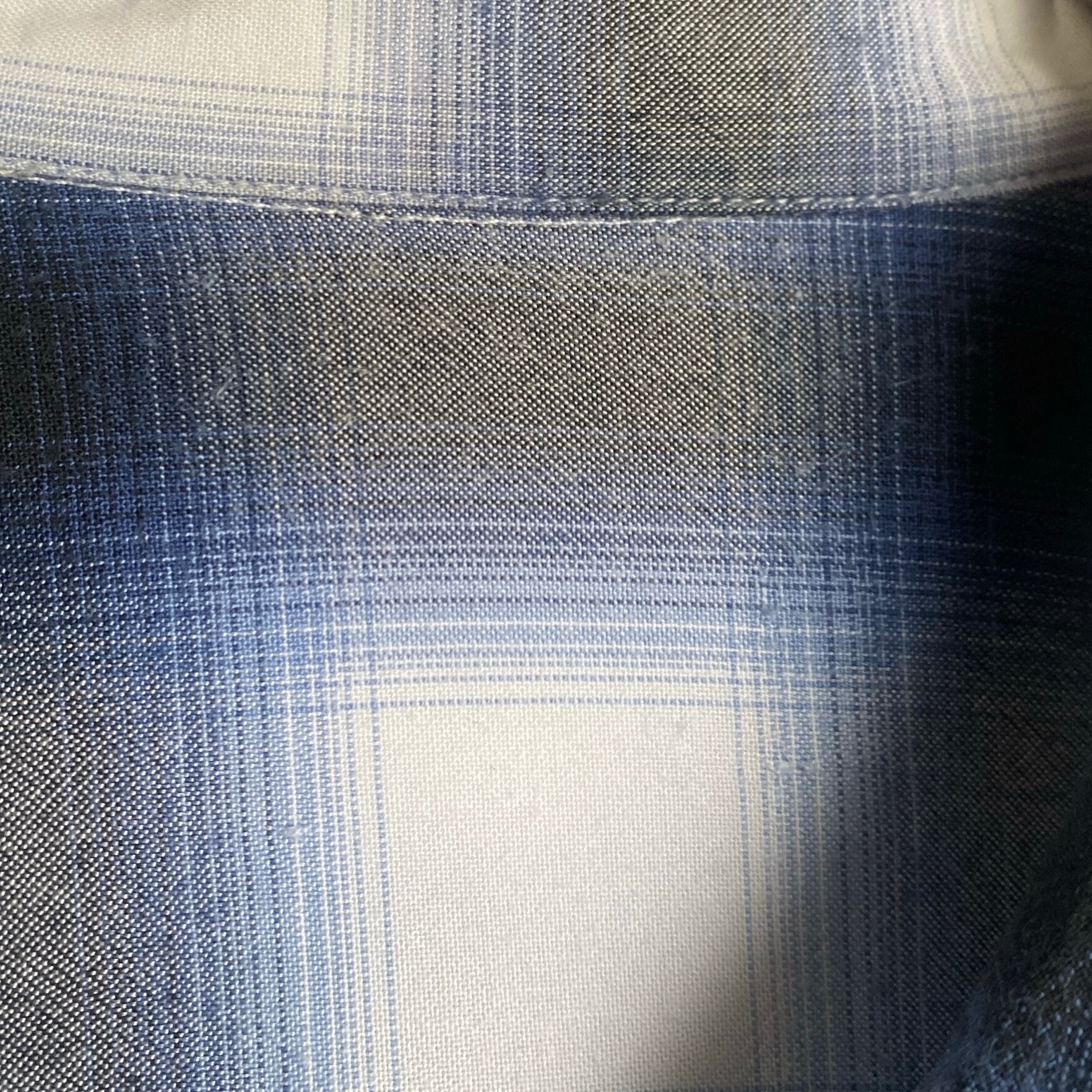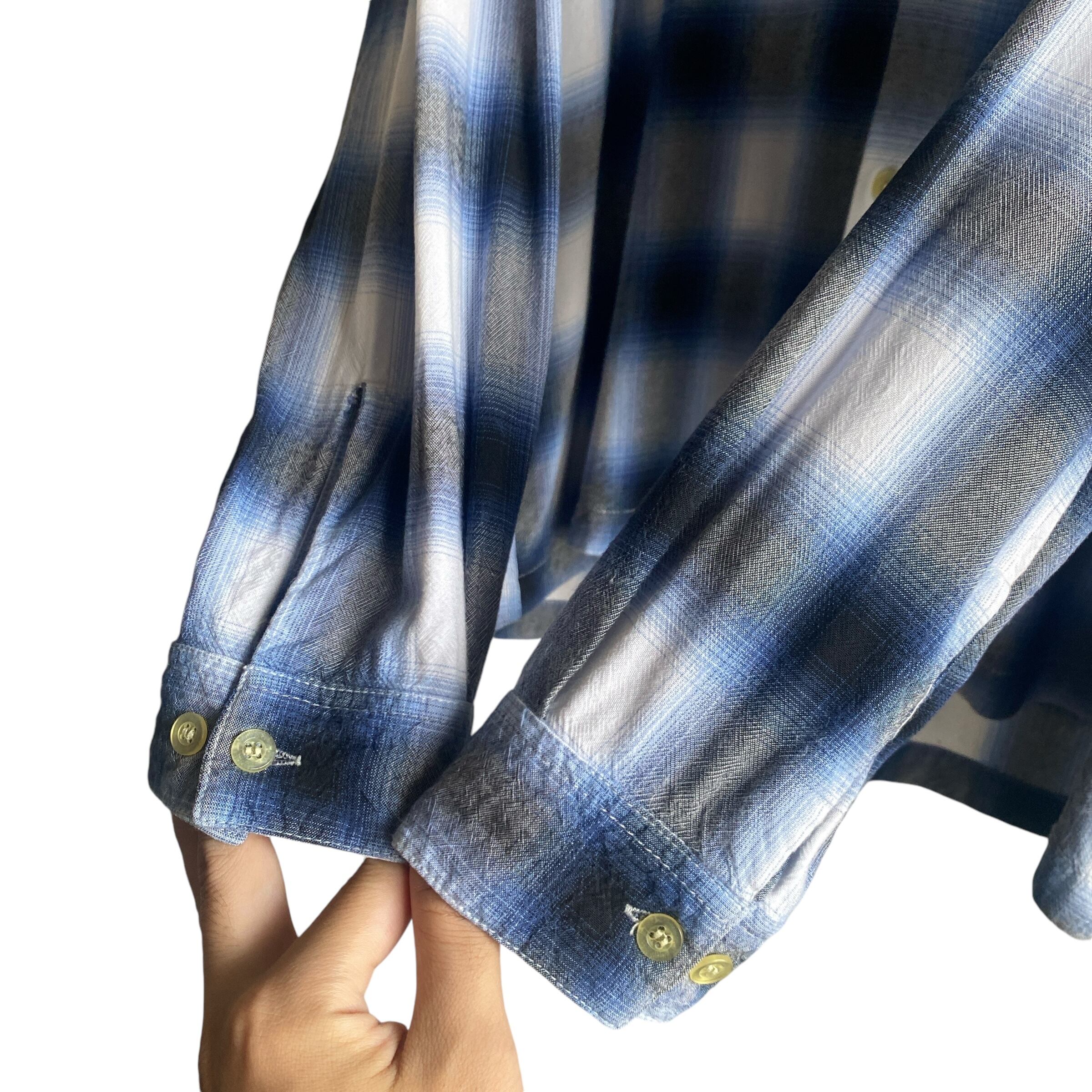 ヴィンテージのオンブレチェックの中でも非常に人気の高い、ブルー×ホワイト×ブラックのチェックパターン、柔らかくとろみがあり、織柄のようにも見える雰囲気の良い生地感、縮みが少なくバランスの良いサイズ感など、条件が揃った非常に素晴らしい一着。