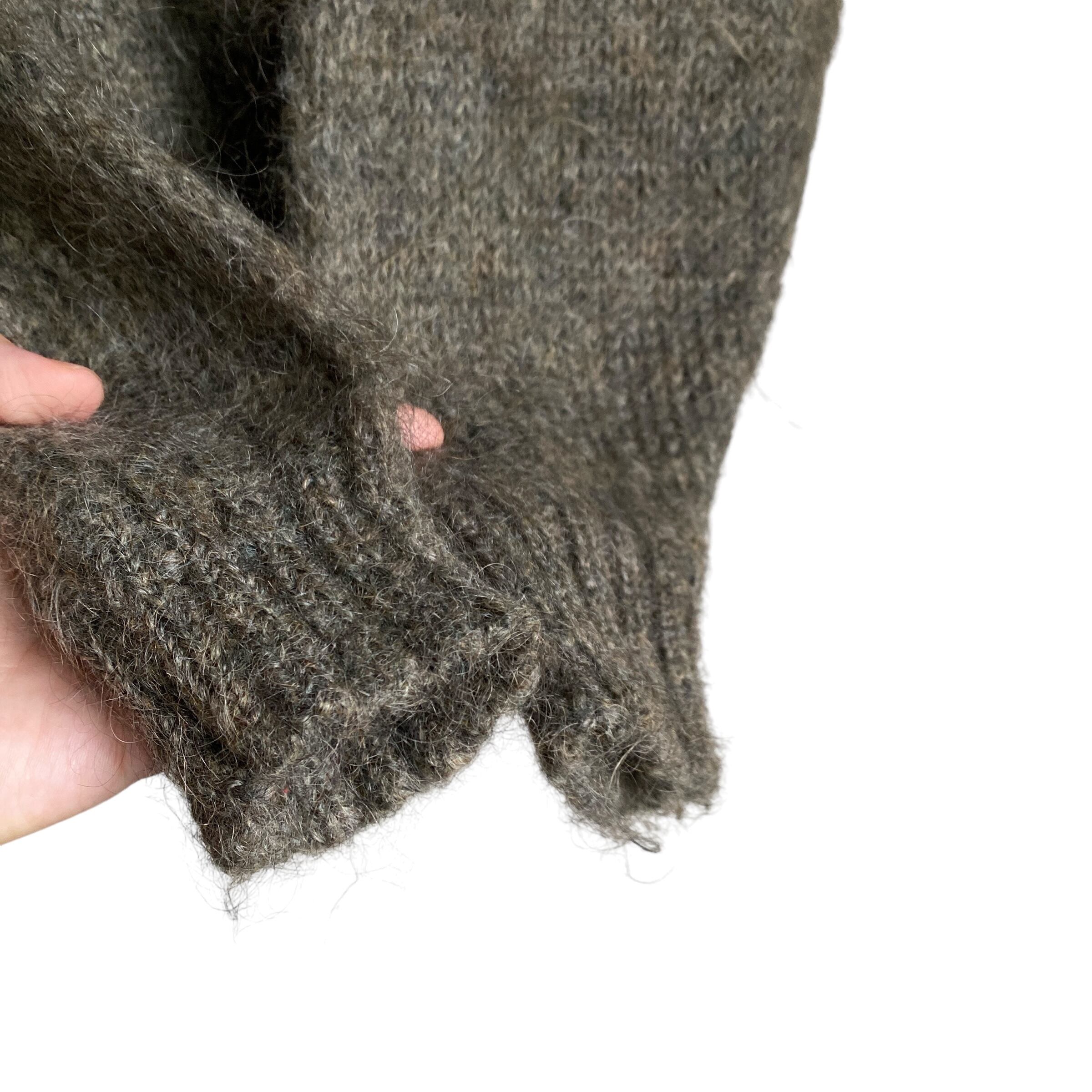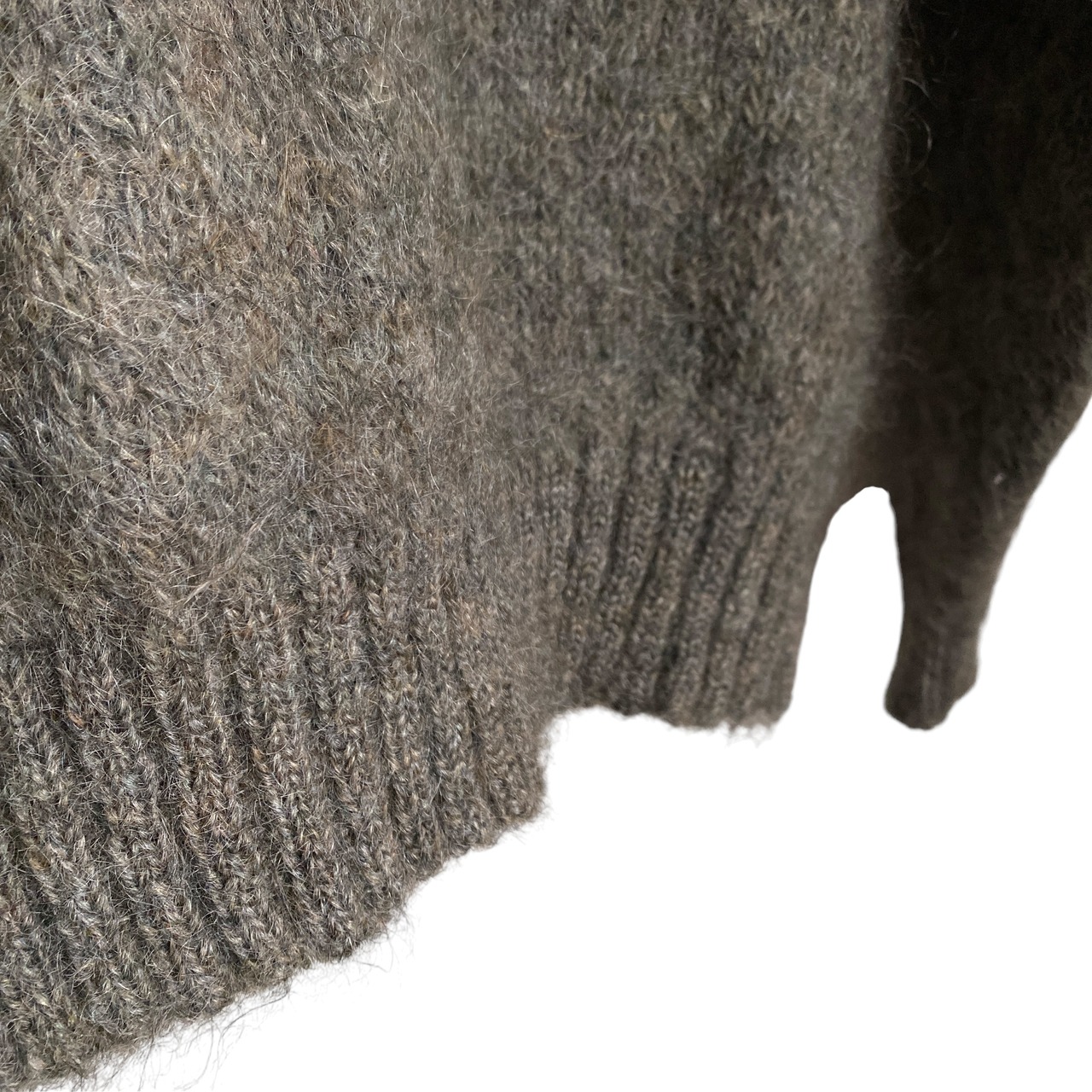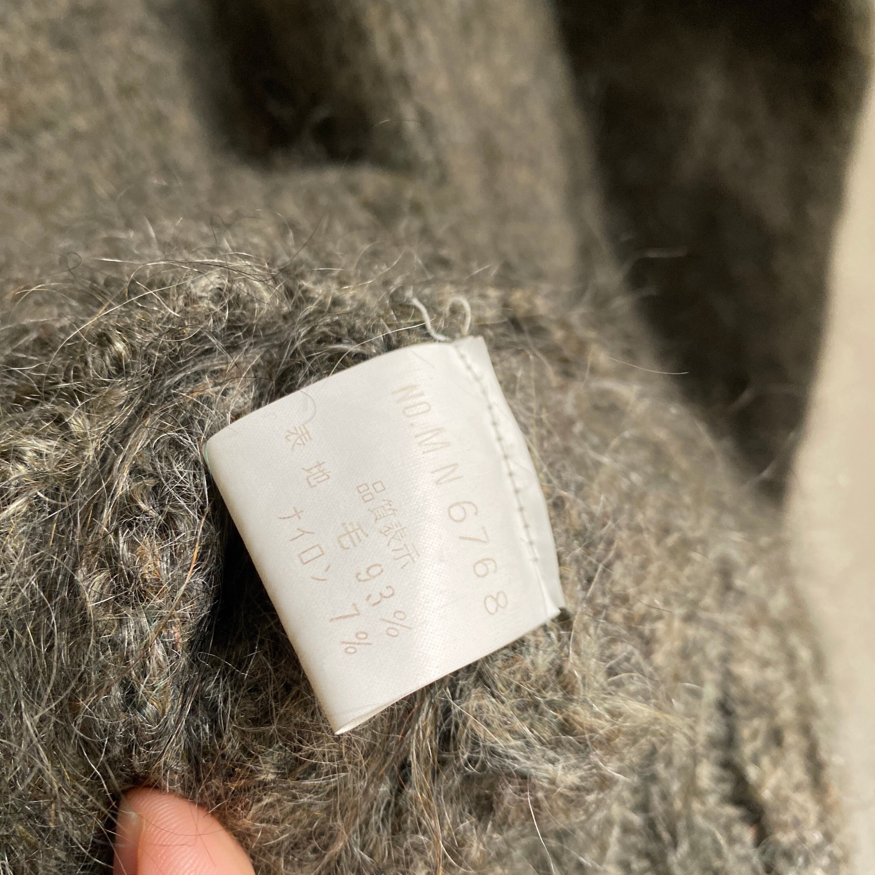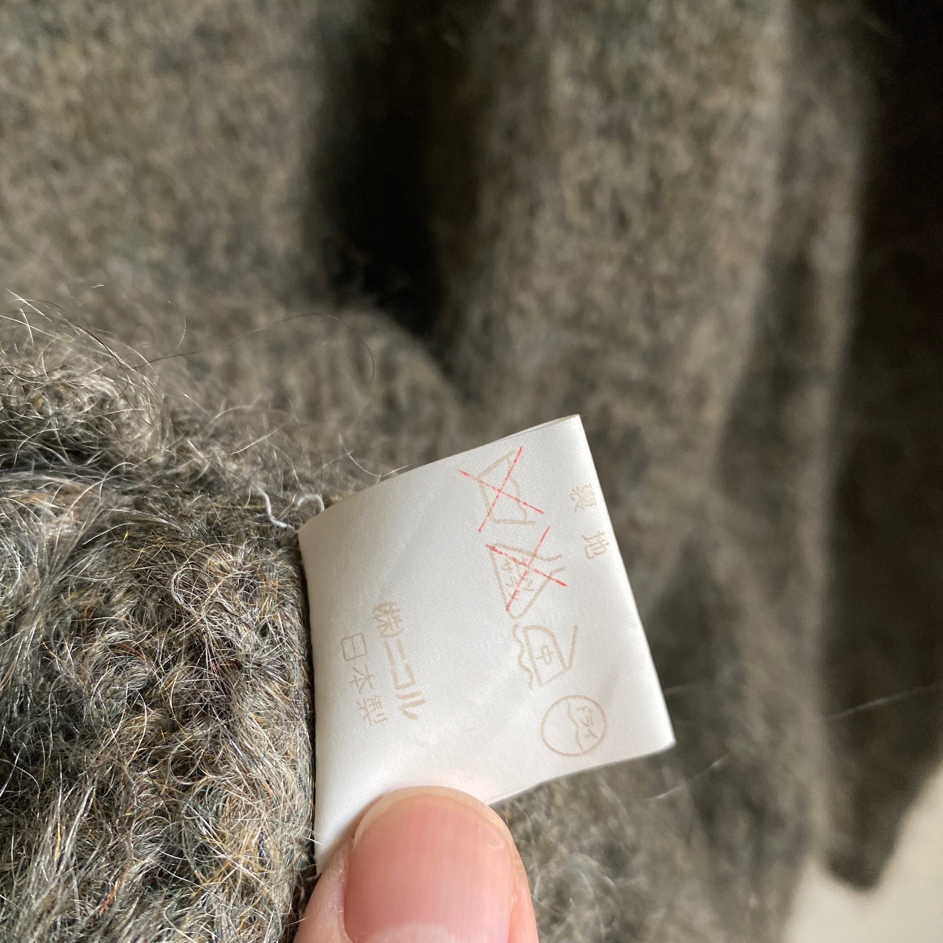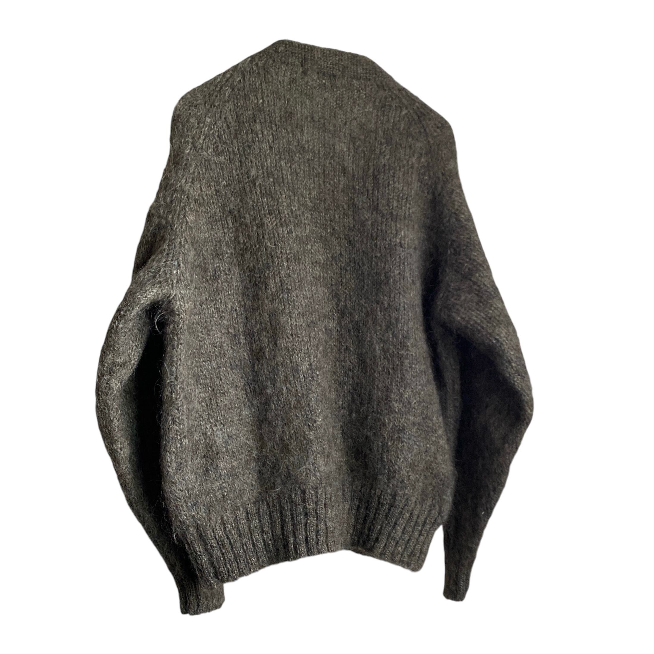 MTVアンプラグドのカートコバーンが着ていたカーディガンに少し似た、ダークオリーブ〜グレー系が混ざった奥行きのある上品な色目に、ヴィンテージモヘアのような毛足の長い生地感、身幅、アームホール共にゆったりとした丸みのあるボックスシルエットが非常に格好良い一着。