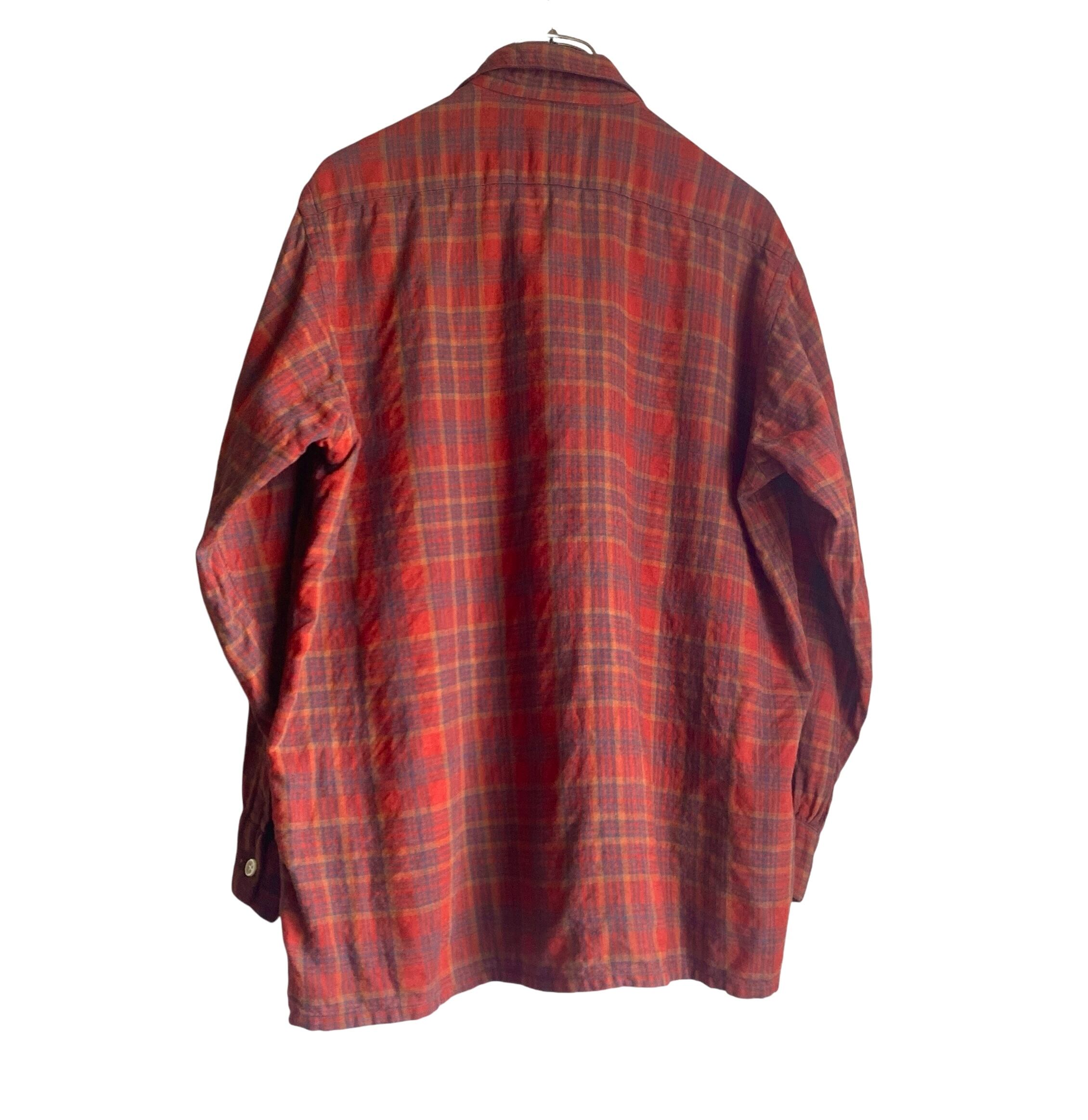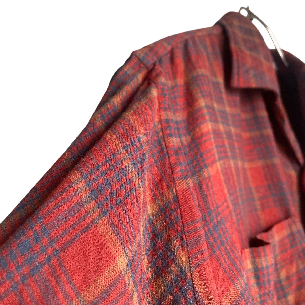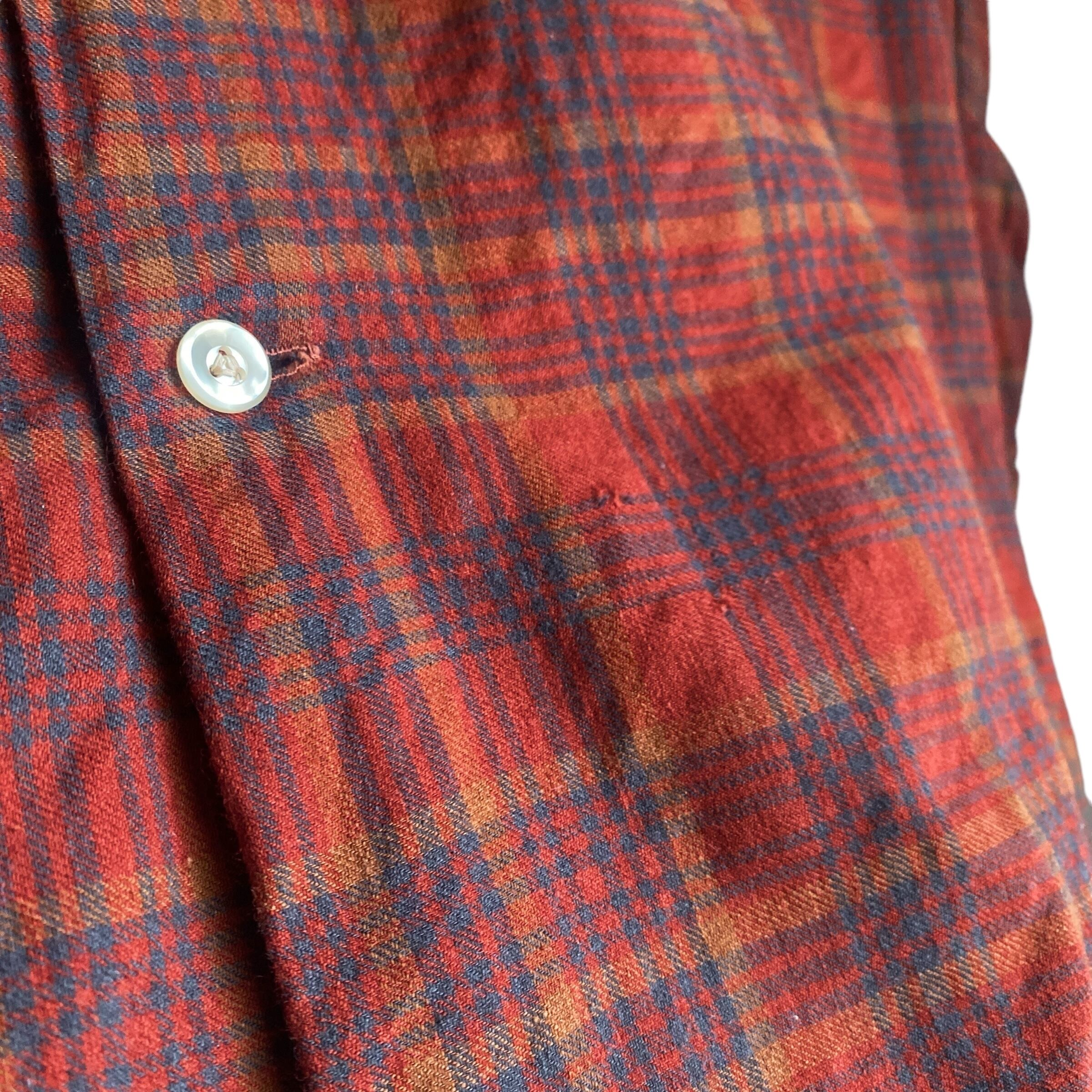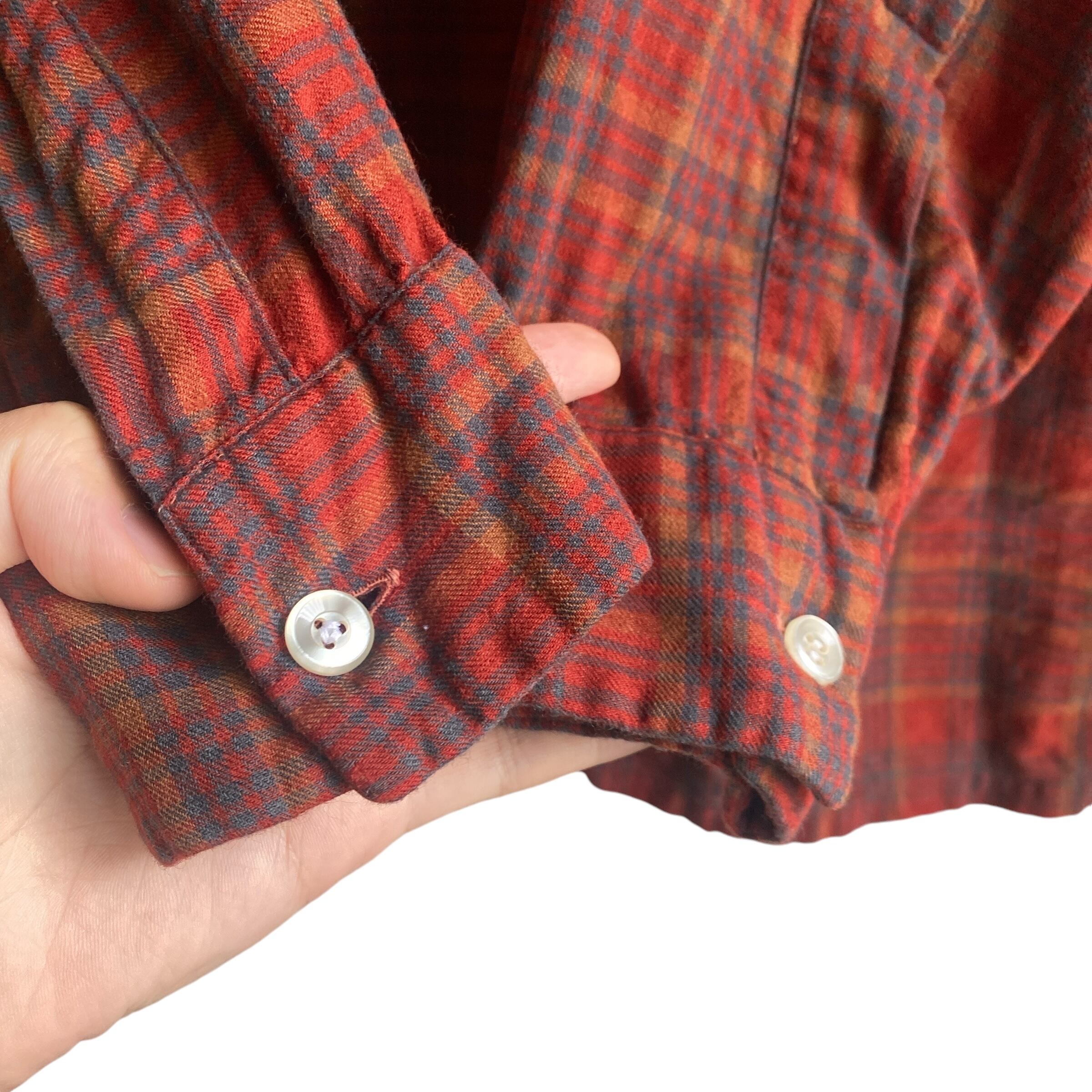 おそらく低速の織り機で織られ、空気を含んだようなウールらしいシボ感やコットンらしい柔らかさを持った極上のイギリス製生地、この年代らしいゆったりとしたボックスシルエット、朱色をベースとした秋らしいチェックカラー(タグの写真の色目が近いです)が素晴らしい一着。