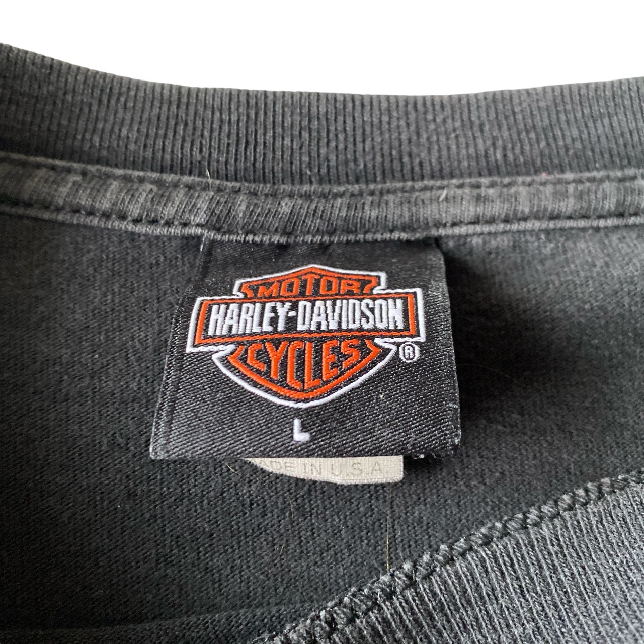 1990年代後半から2000年代初頭頃のUSA製「ハーレーダビッドソン」両面プリントTシャツになります。(コピーライトが潰れてしまって読めないのですが、同フロントデザインでバックが1998のものを見たことがあるので、おそらくそのあたりかと)