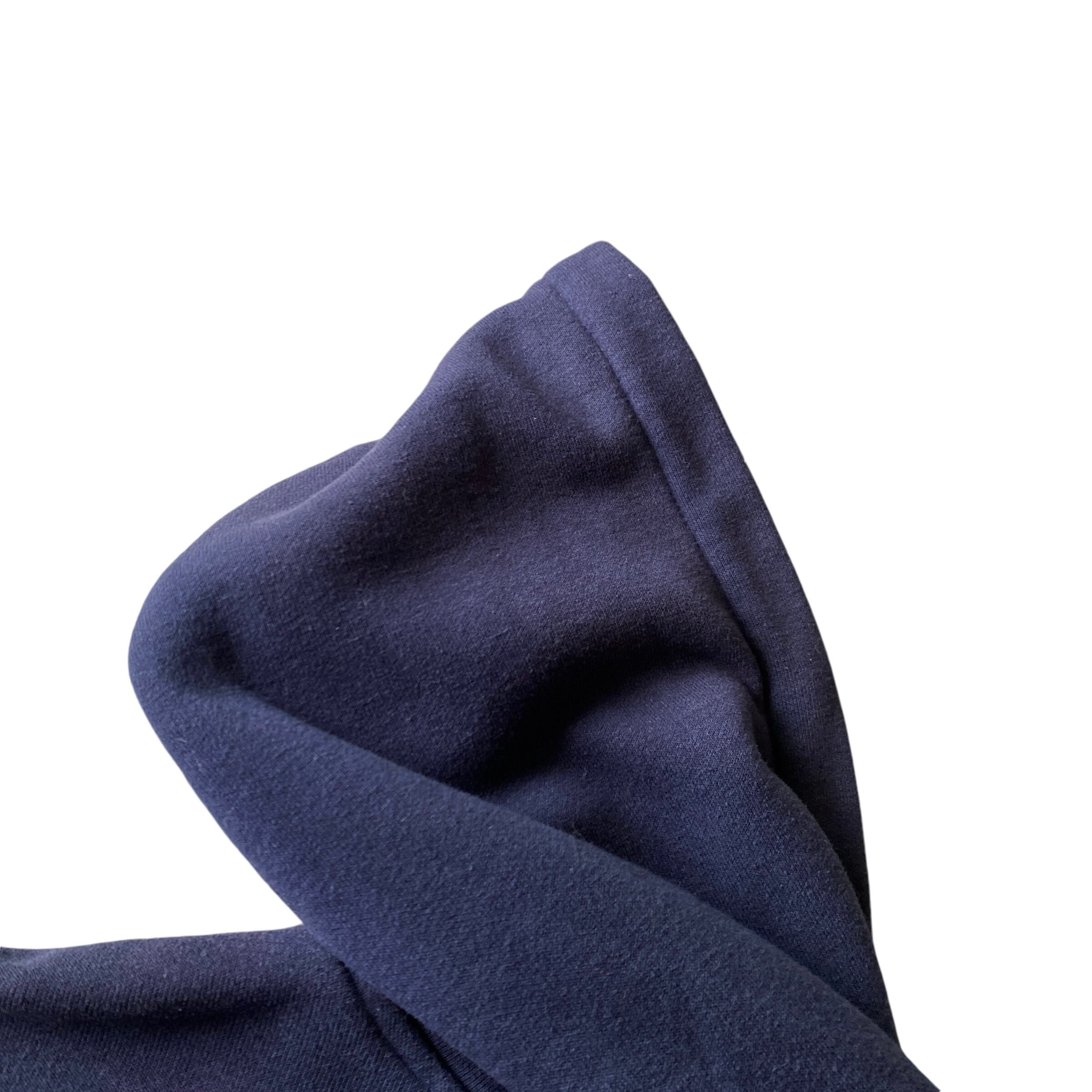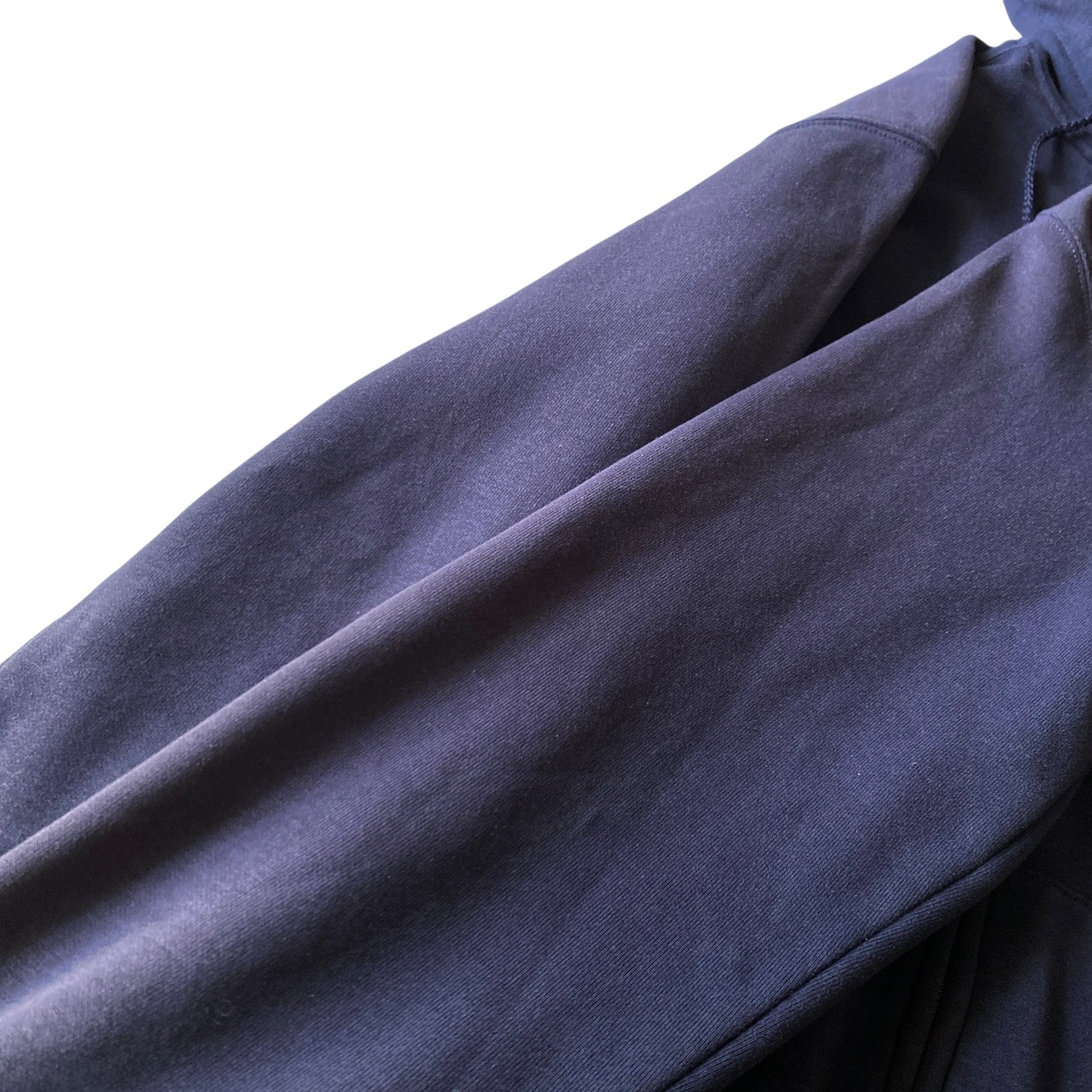 やや縦長でたっぷりとしたサイズ感(裾リブがそれなりに効いているので、折り込んでボックスシルエットで着用も可能)に、ダークネイビーからフェードした茄子紺系の色目が素晴らしい一着。