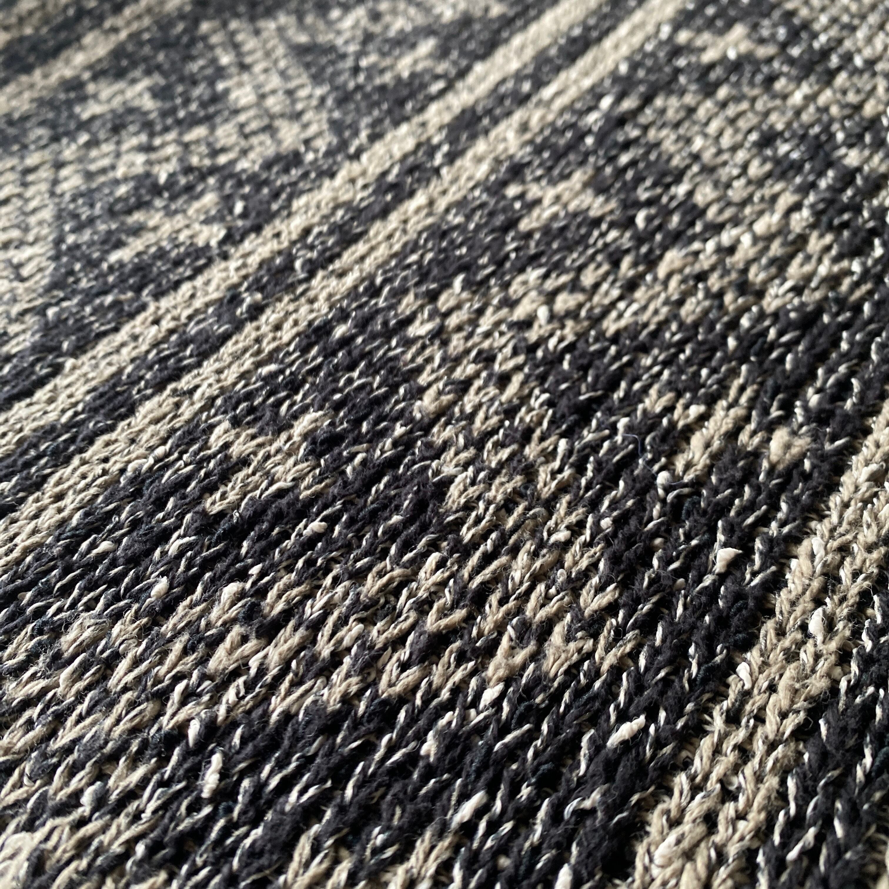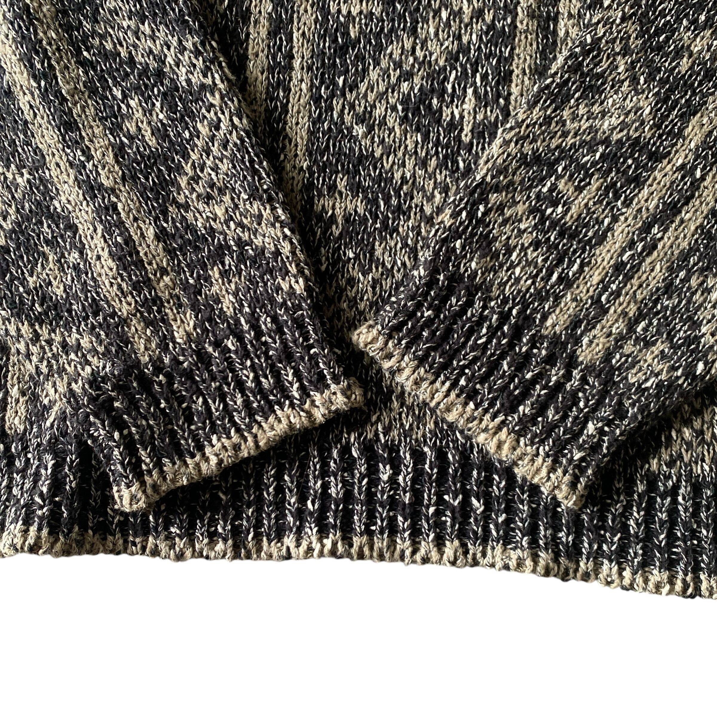 程よく肉厚なコットン100のニット地に、ブラック×ベージュの幾何学デザイン、しっかりと肩落ちするゆったりとしたボックスシルエットが非常に格好良い一着。