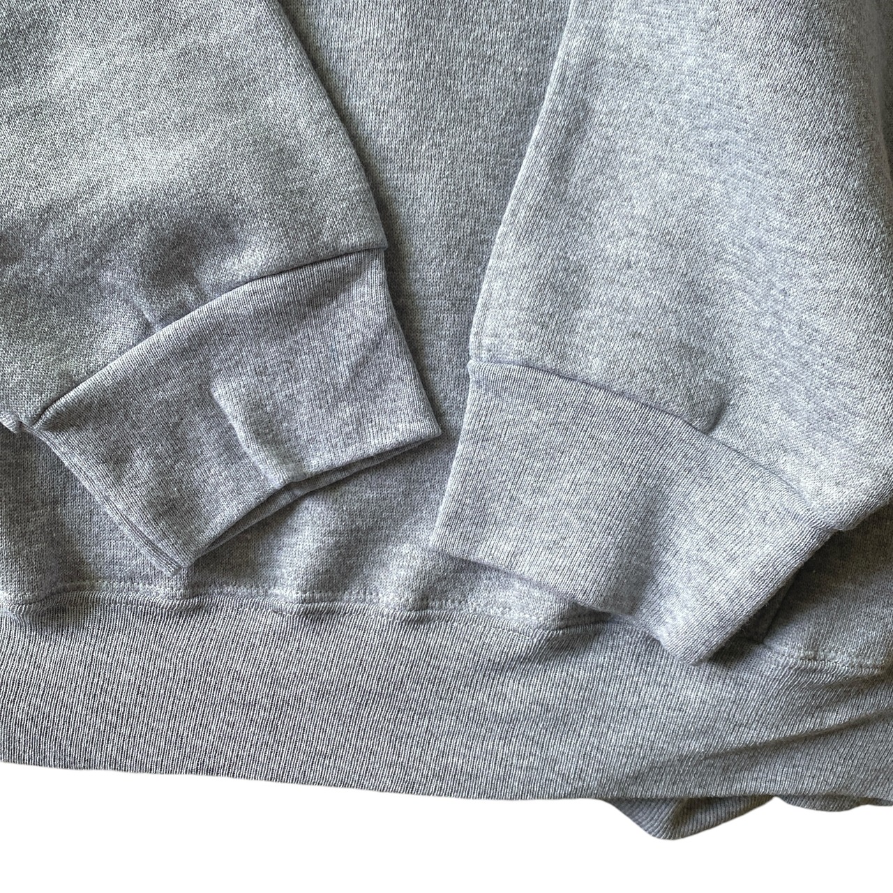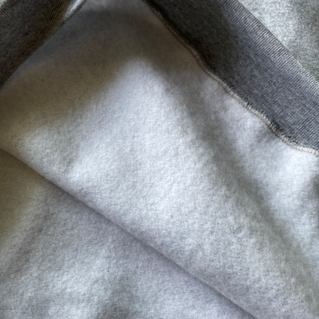 ベーシックなヘザーグレーカラーに、おそらく9ozぐらいで厚みで、コットンポリ特有の柔らかくやや落ち感のある生地が非常に良い塩梅の一着。