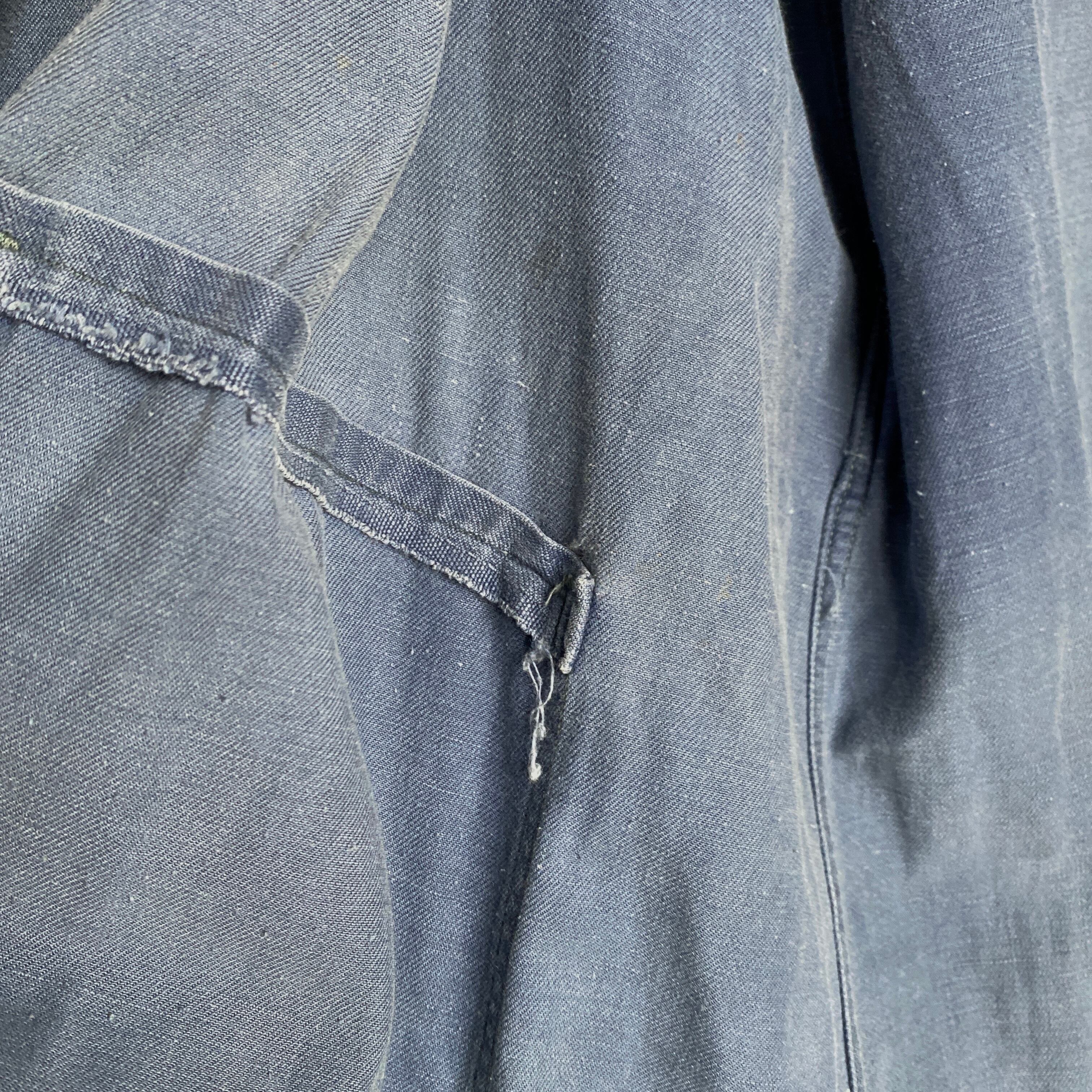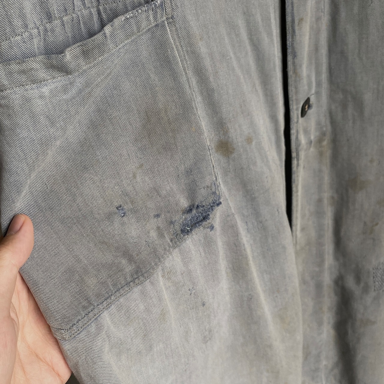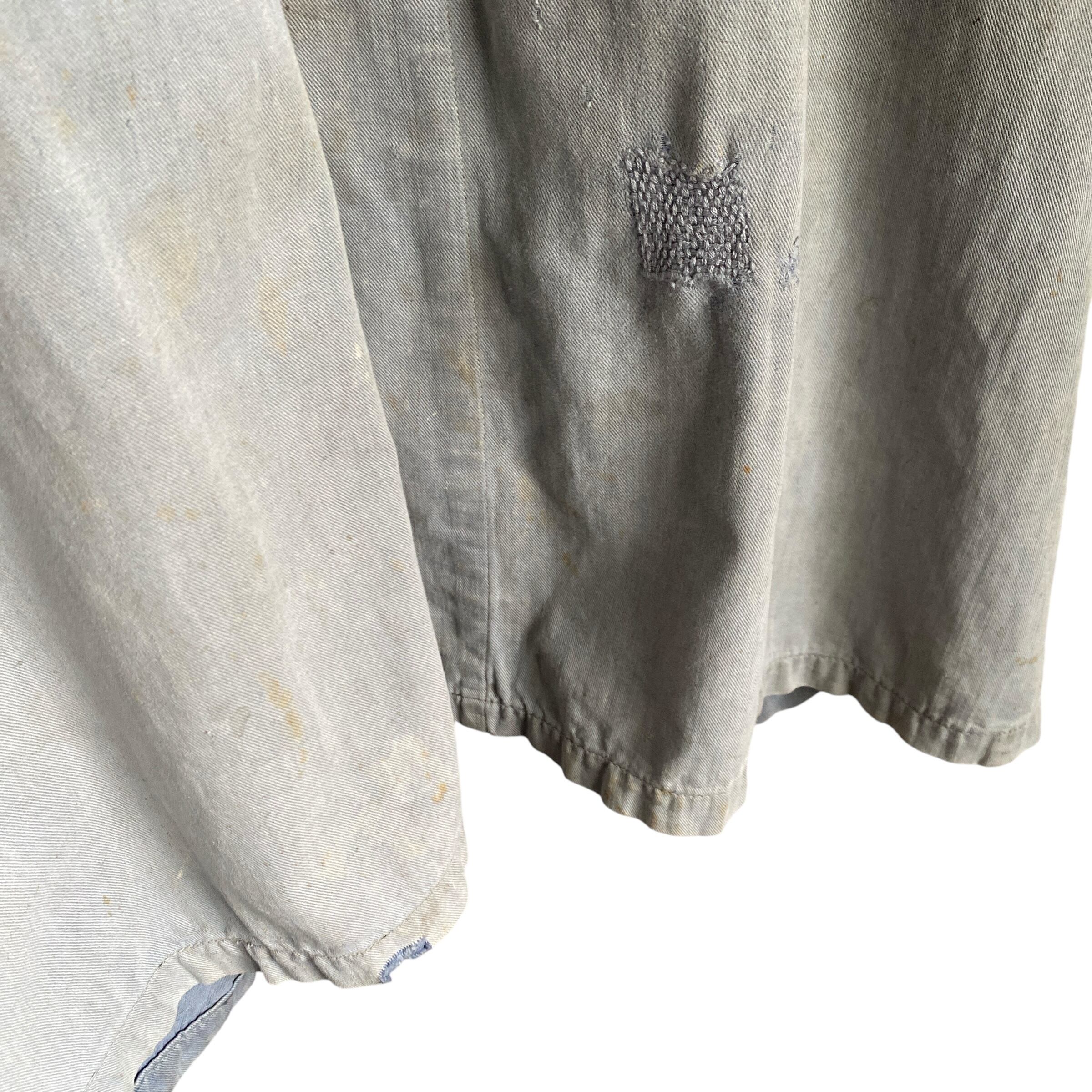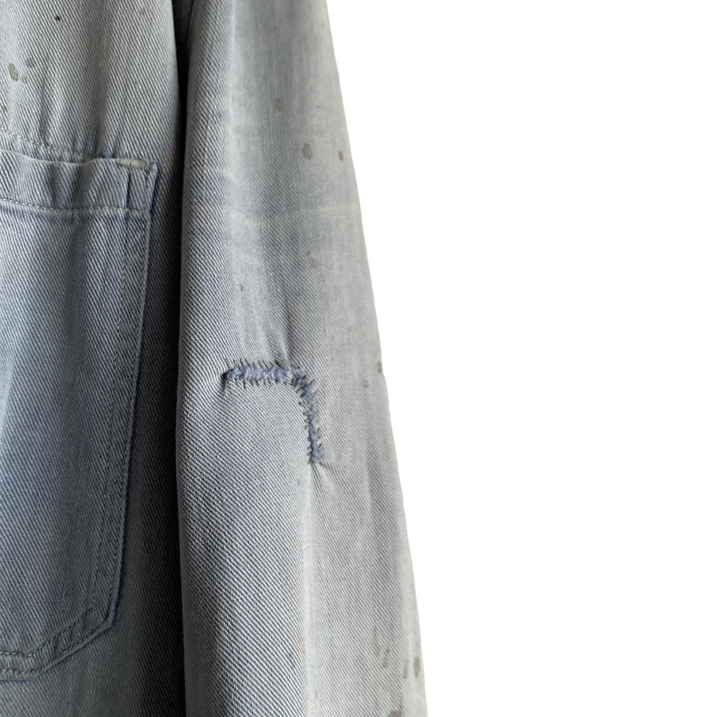 経年で目の詰まった滑らかで落ち感のある薄手コットンツイル生地に、とんでもないぐらいフェードしたブルーの色目、刺し子ステッチによるリペア、リアルなワーク感を感じるペンキやオイルの汚れが非常に素晴らしい一着。