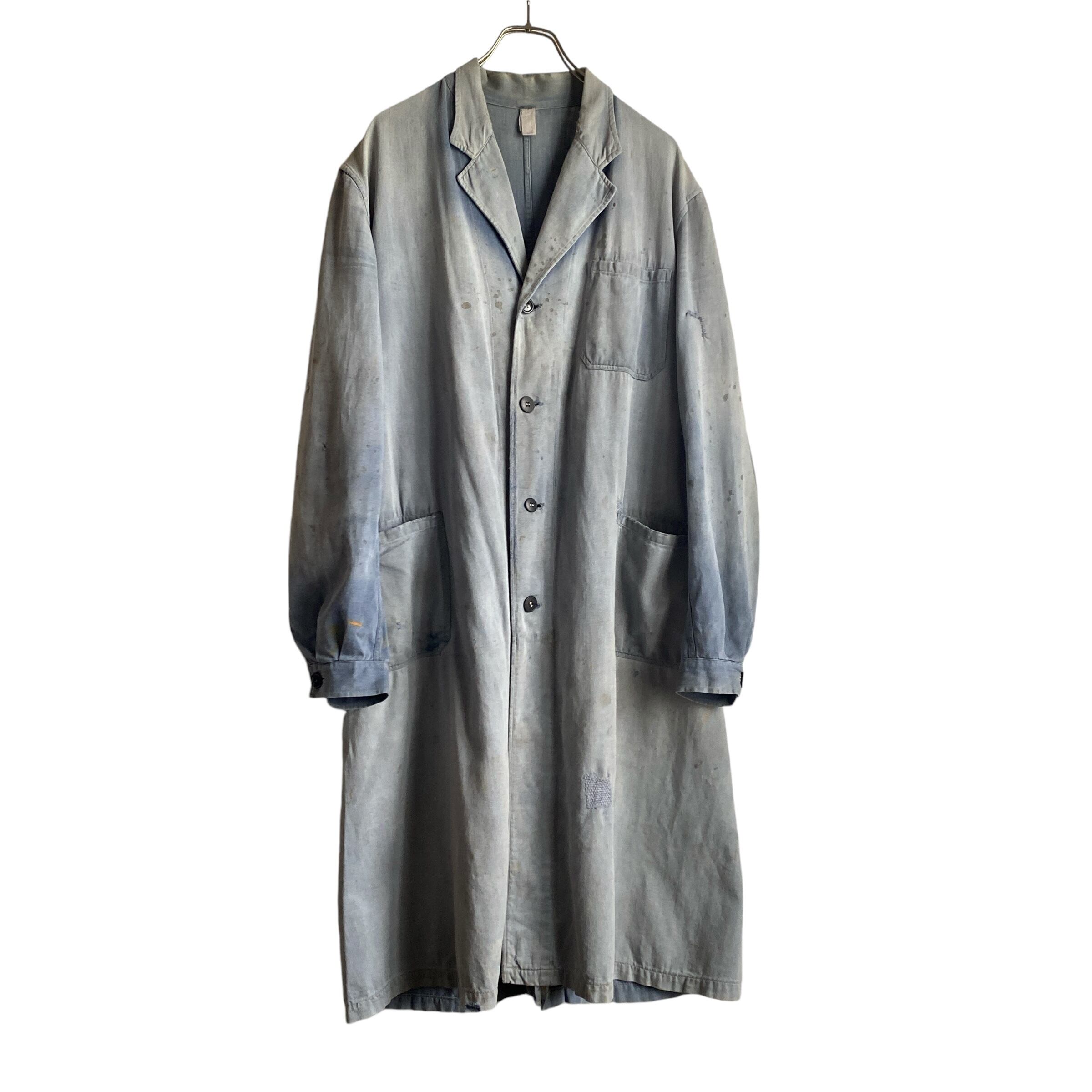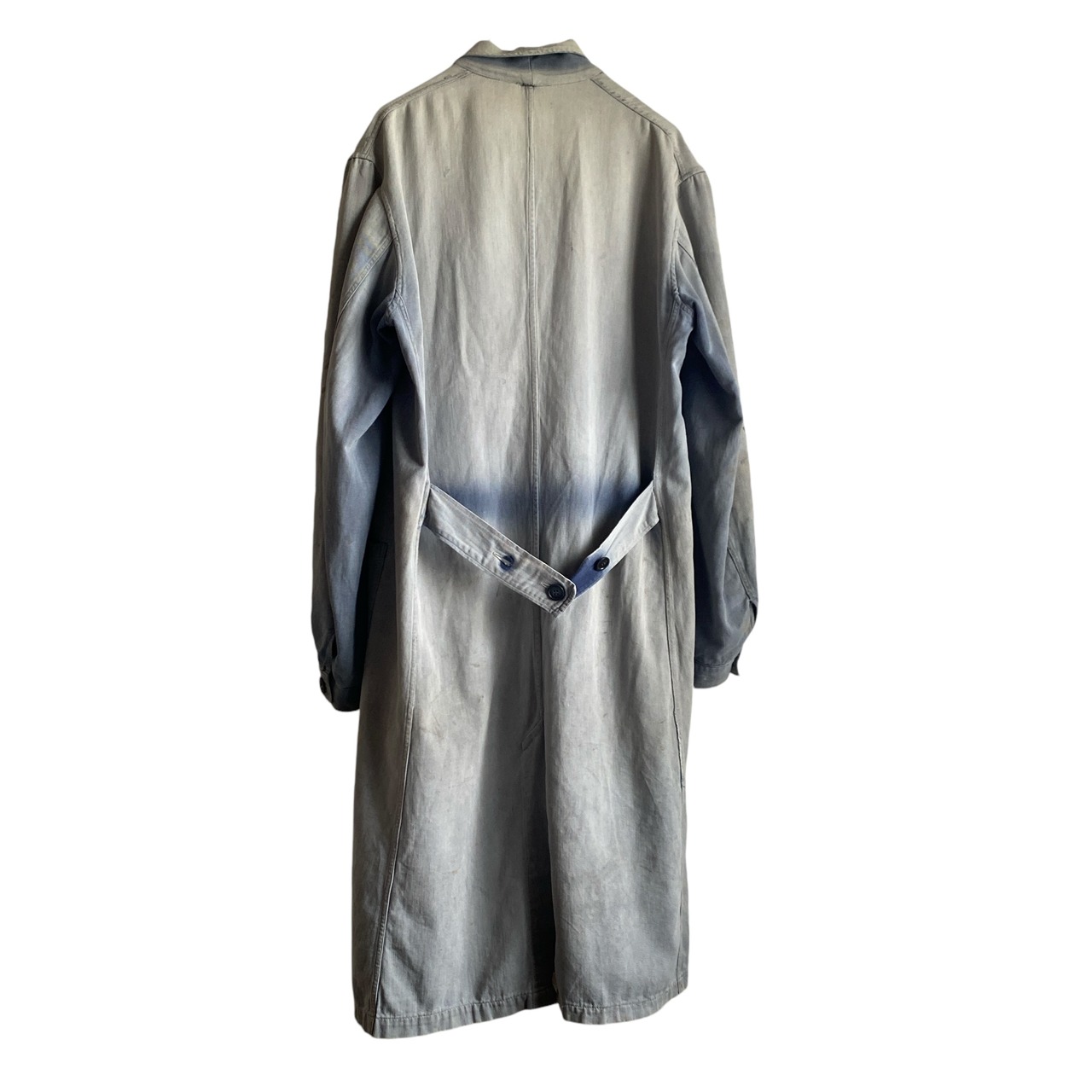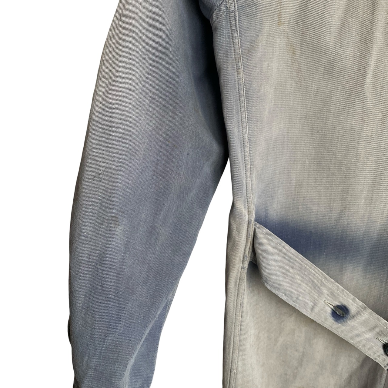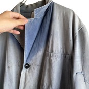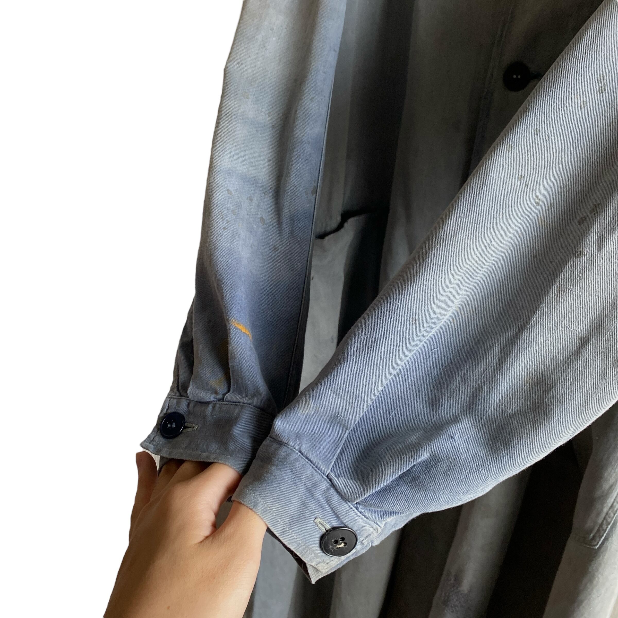 経年で目の詰まった滑らかで落ち感のある薄手コットンツイル生地に、とんでもないぐらいフェードしたブルーの色目、刺し子ステッチによるリペア、リアルなワーク感を感じるペンキやオイルの汚れが非常に素晴らしい一着。