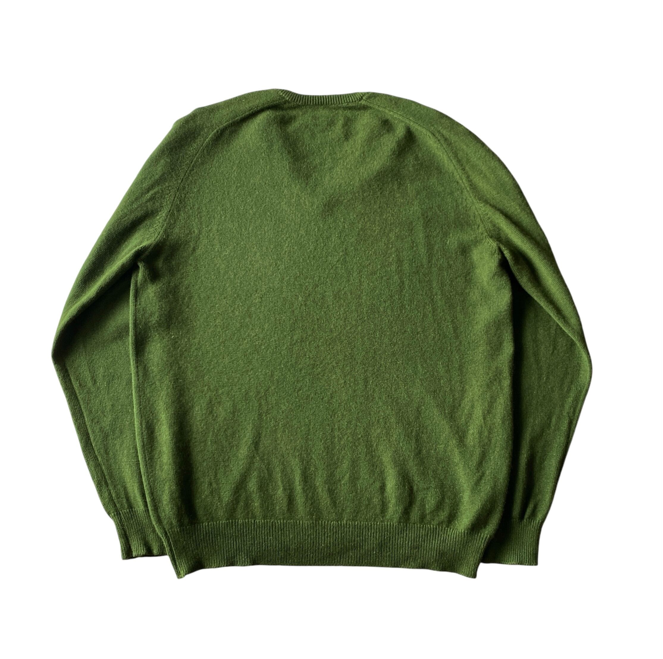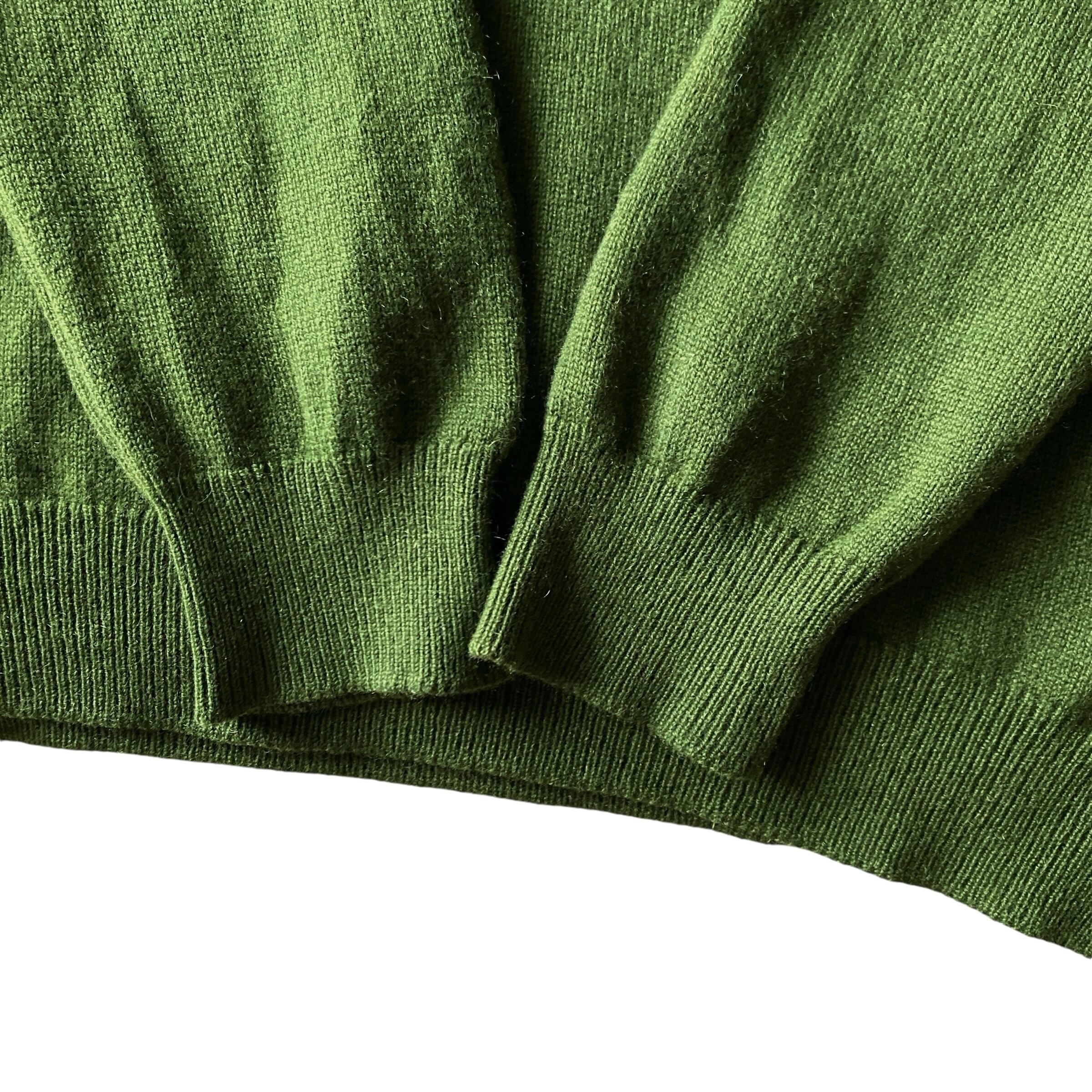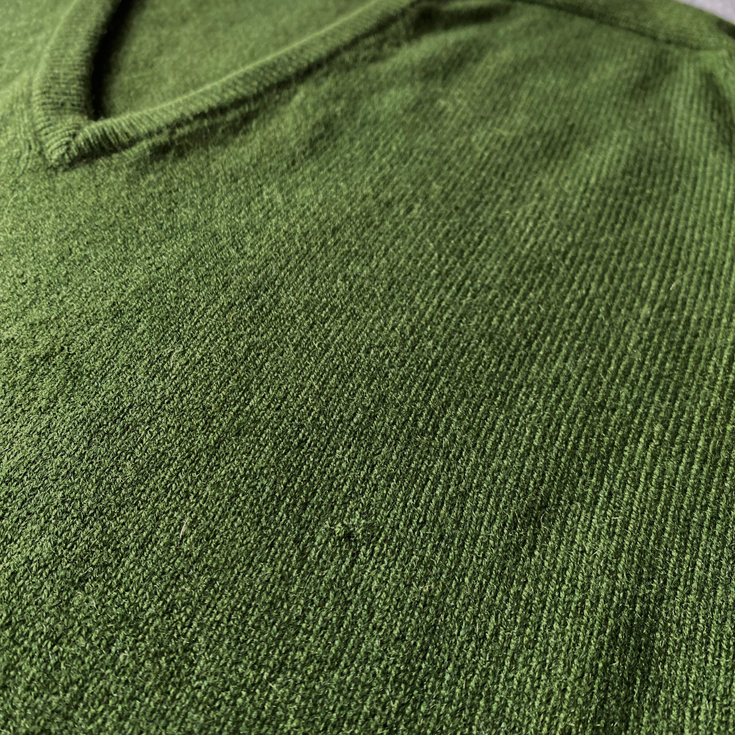 3plyほどの太めの糸が使用された、目の詰まった硬さのある(とはいえもちろんしなやかです)肉厚な質感に、抹茶色?のような珍しい色目が素晴らしい一着。