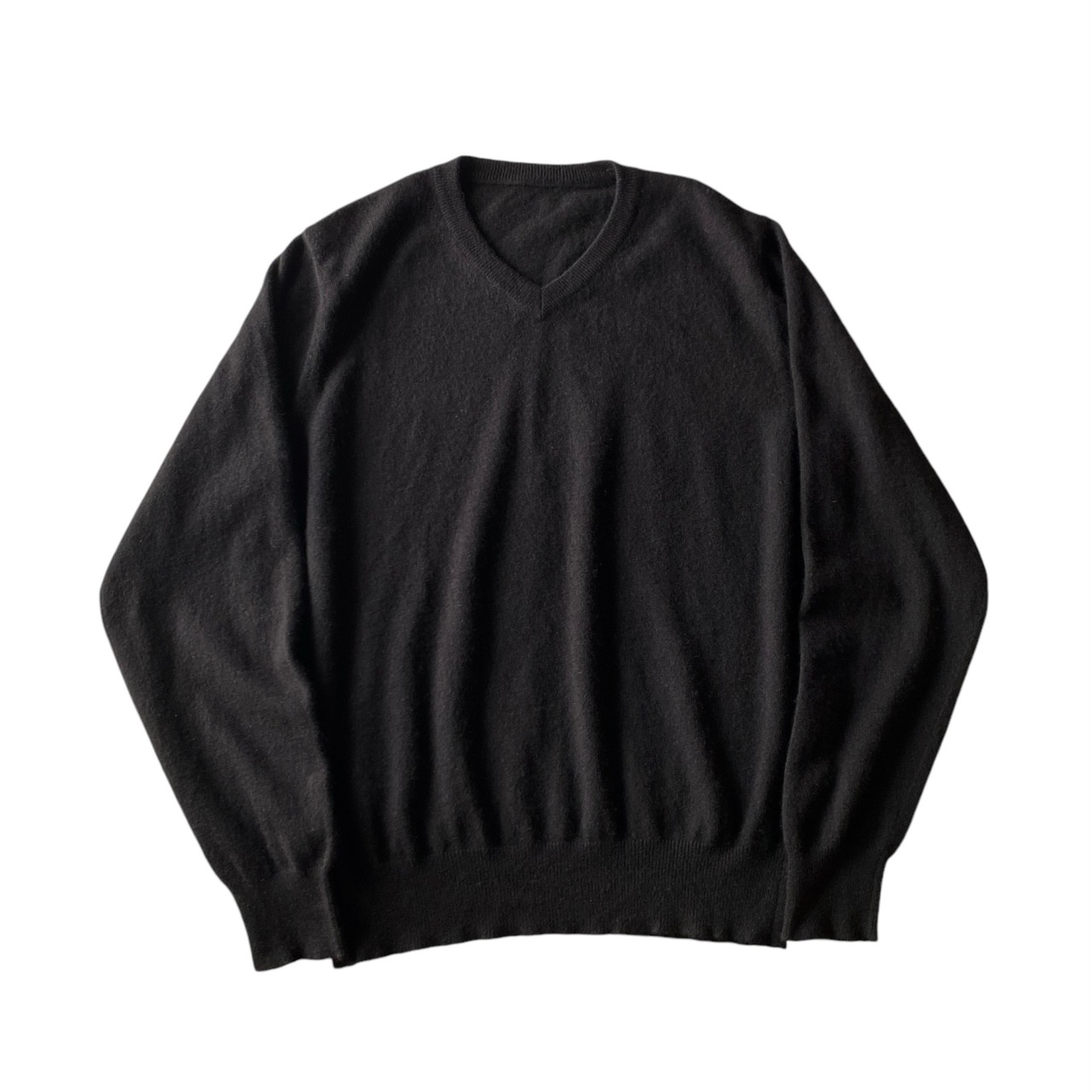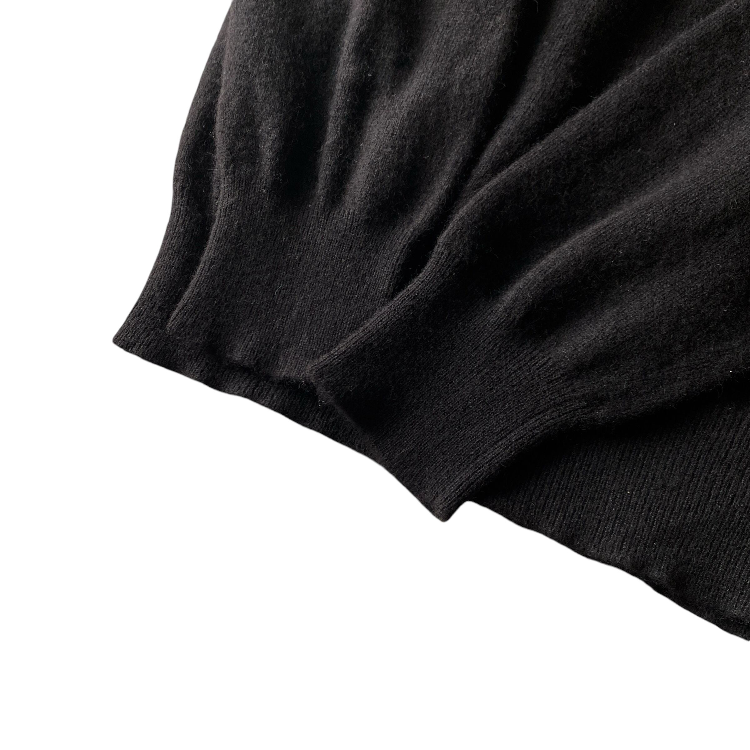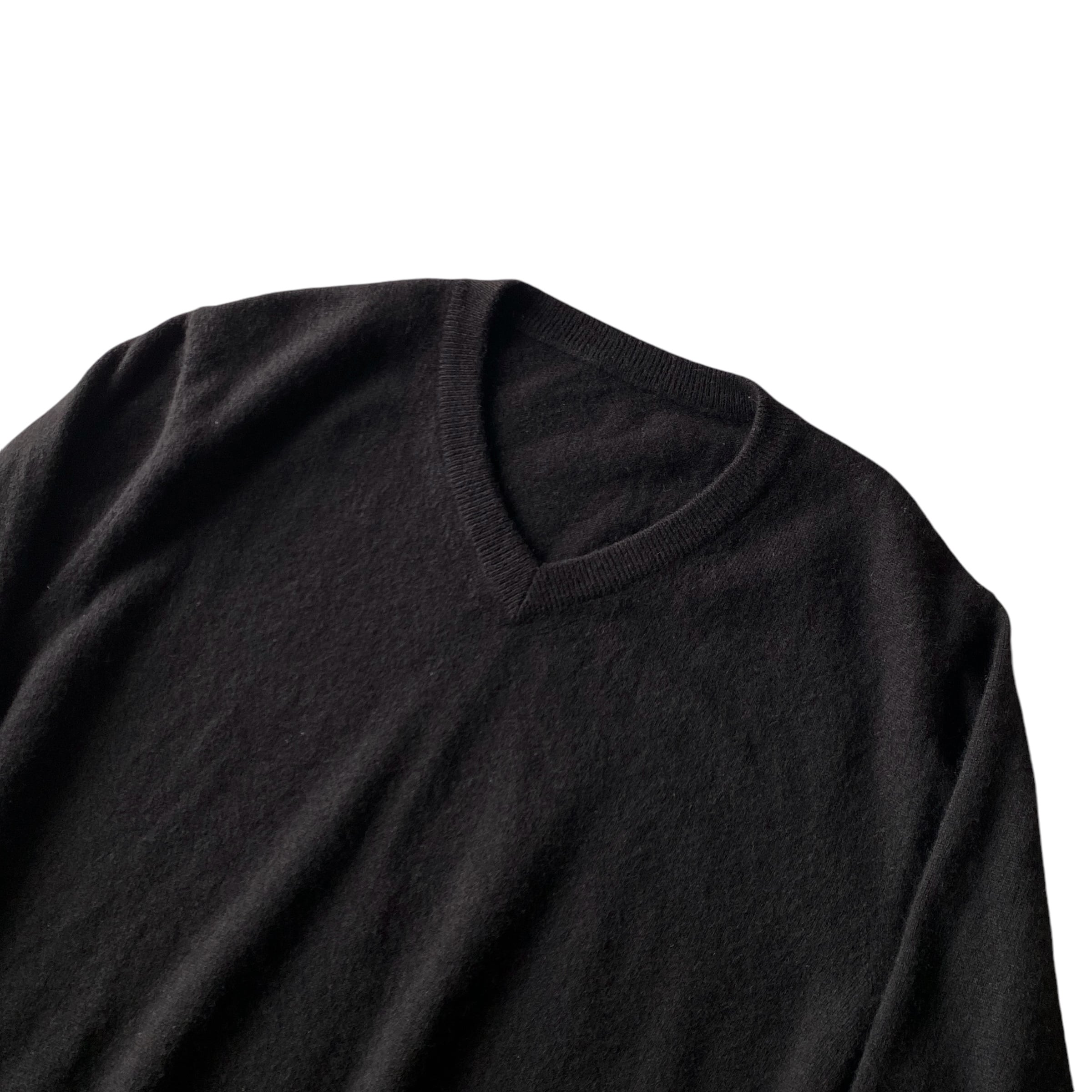 希少なブラックカラーに浅めで着やすいVネックデザイン、程よく肉厚で空気を含んだようなふわっとした上質な手触りのカシミヤ生地が非常に素晴らしい一着。
