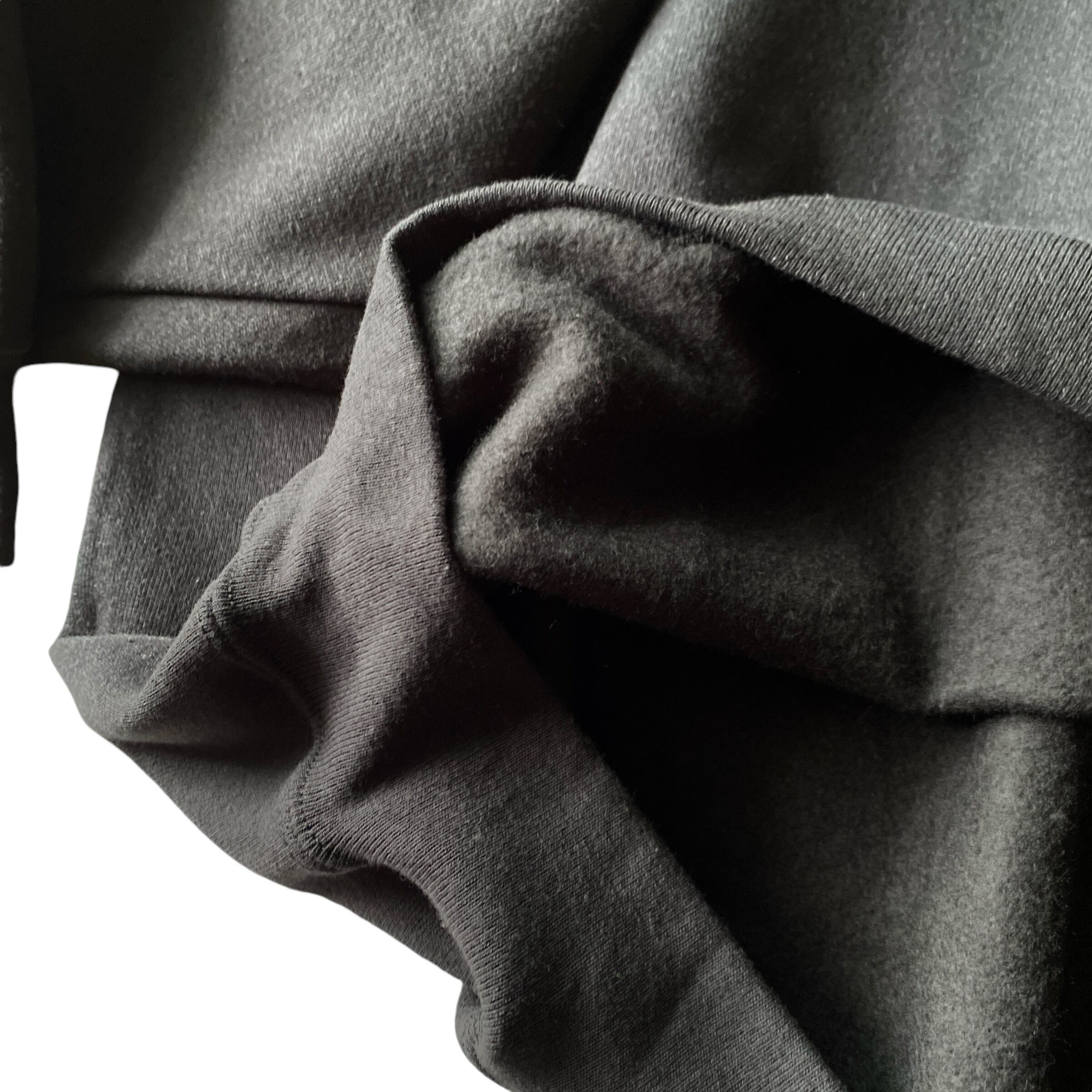 ベーシックなブラックカラーに、おそらく9ozぐらいで厚みで、コットンポリ特有の柔らかくやや落ち感のある生地が非常に良い塩梅の一着。
