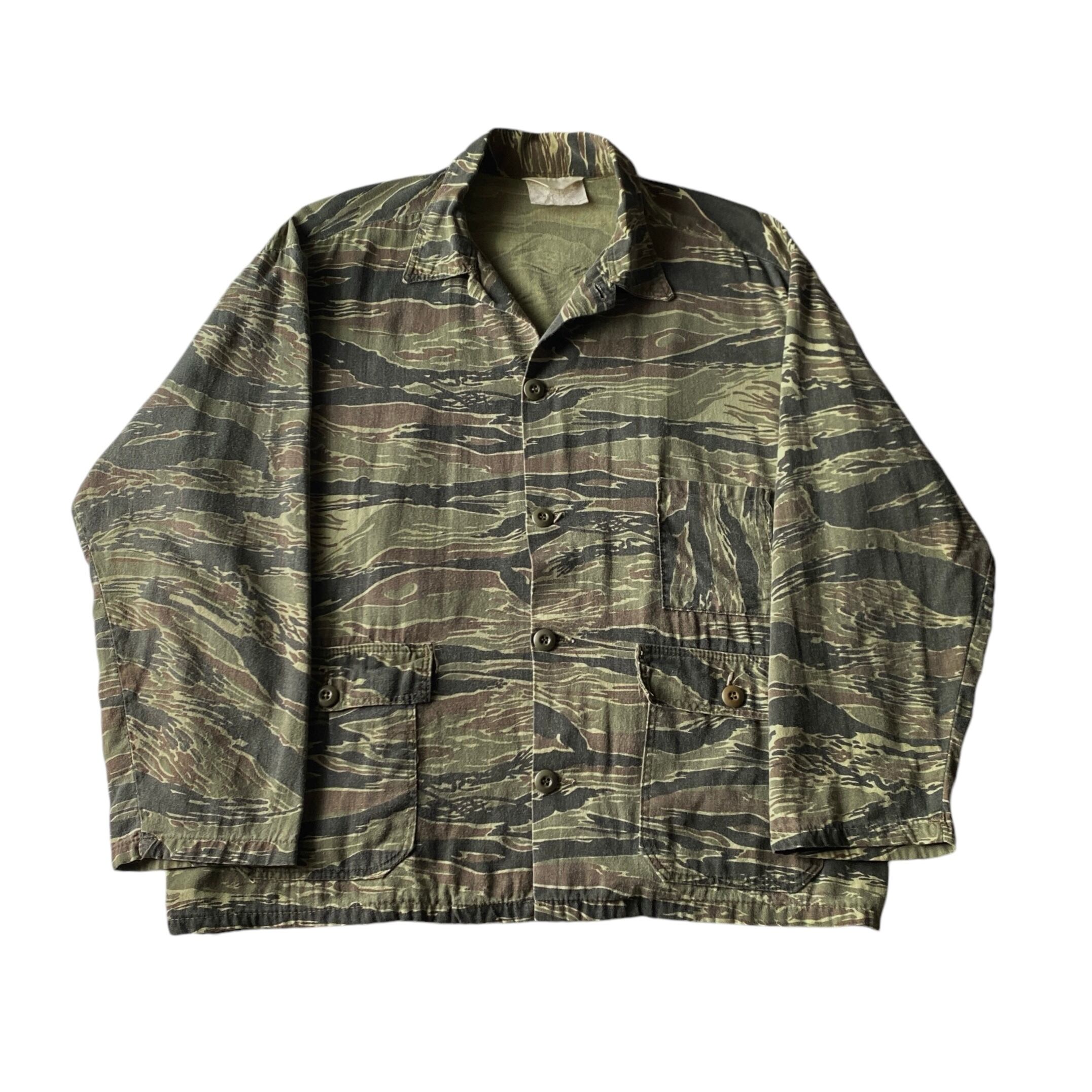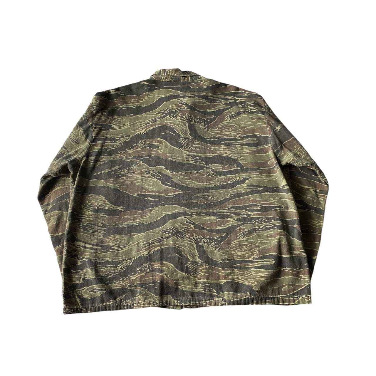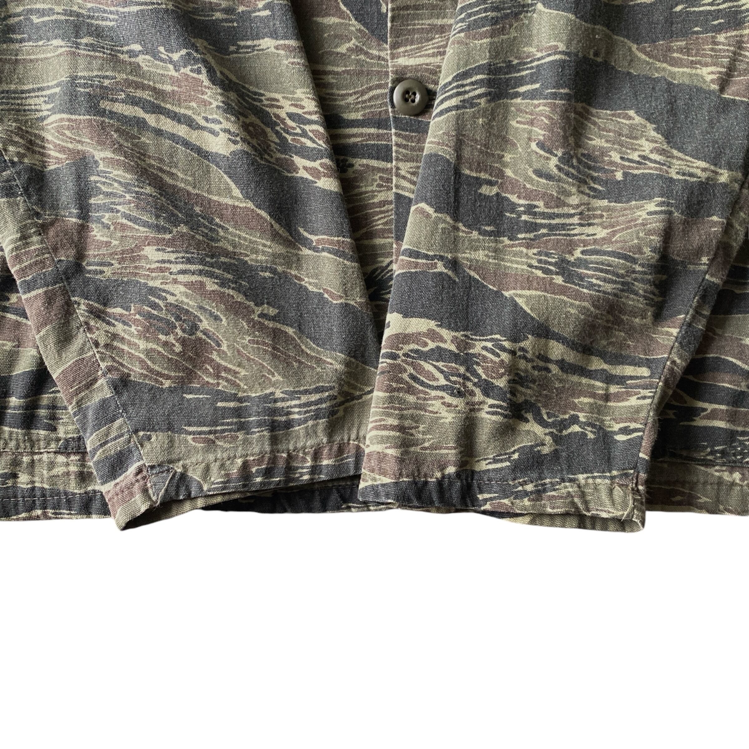 このタイプだと少し珍しい小さめ襟のオープンカラーに、タイガーカモ柄、ゆったりとした短丈ボックスシルエットが非常に格好良い一着。