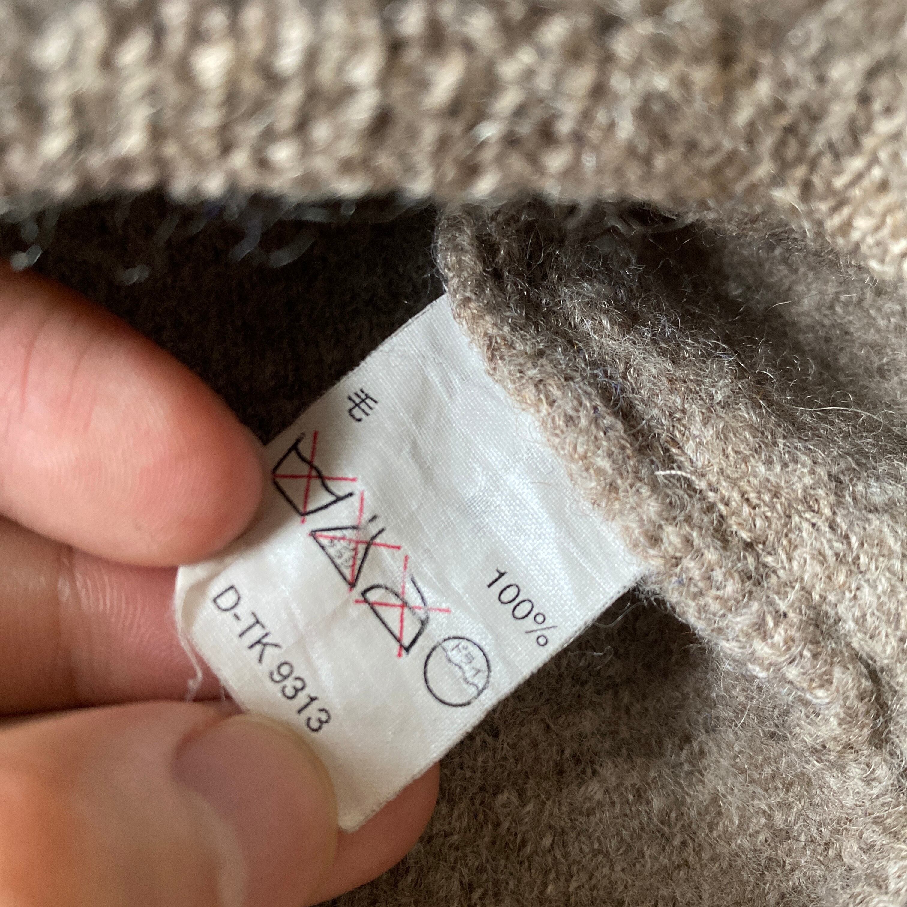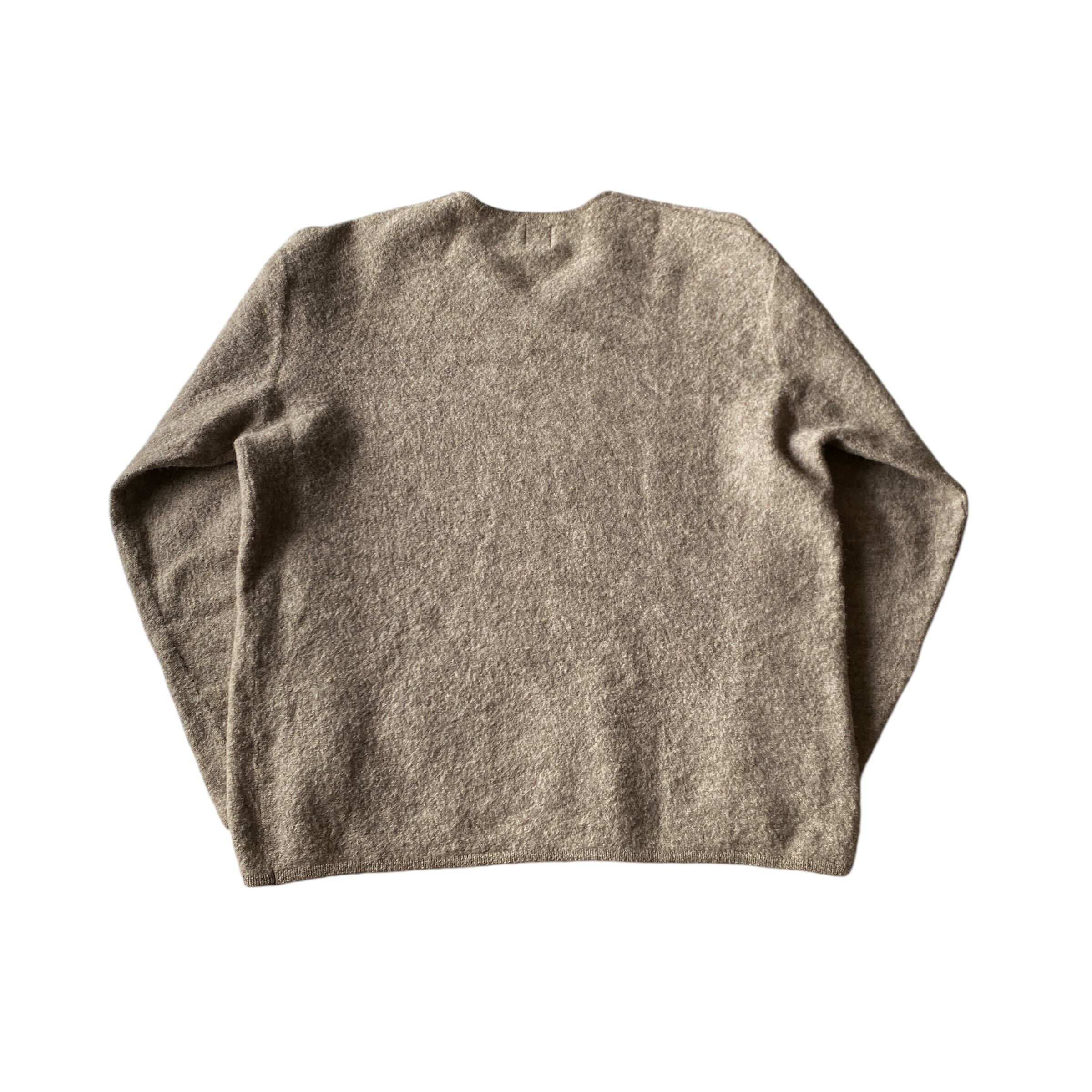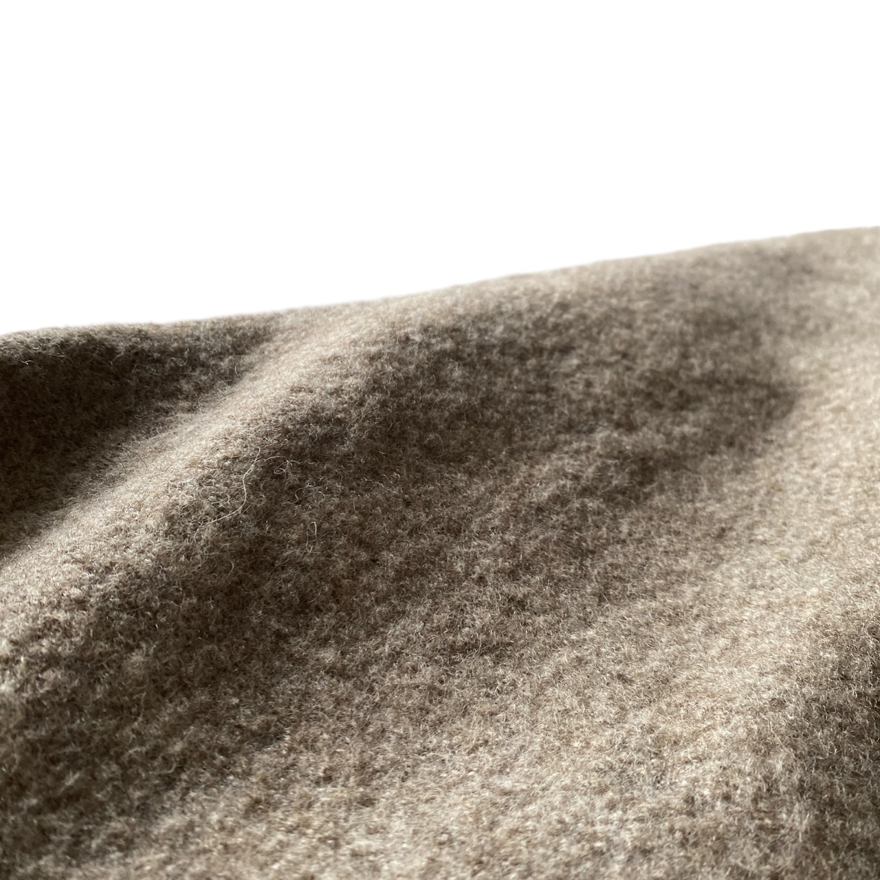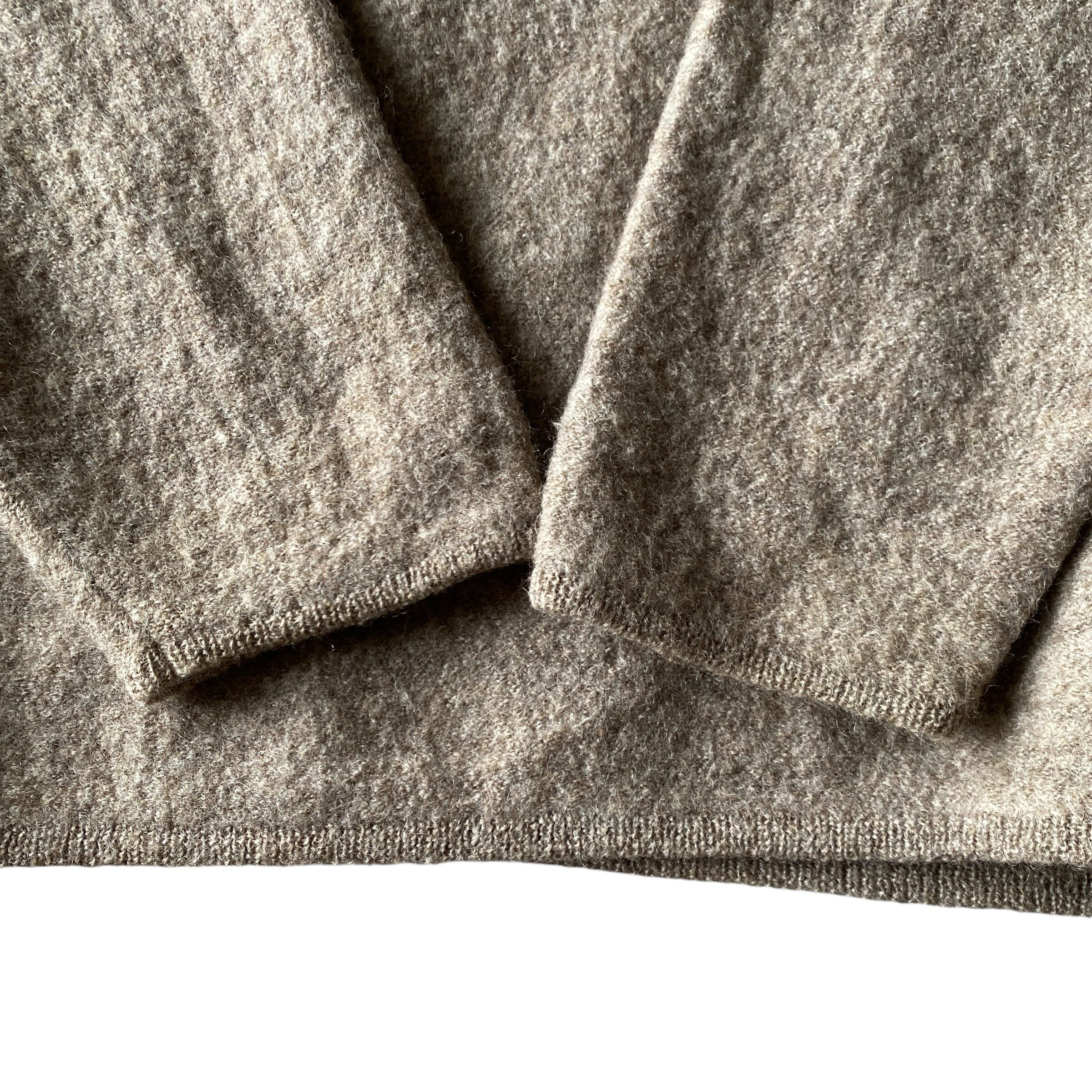 縮絨された中厚手の起毛ニットに、柔らかいグレーベージュ系のカラー、身幅、アームホールともにゆとりのあるボックスシルエットが非常に格好良い一着。