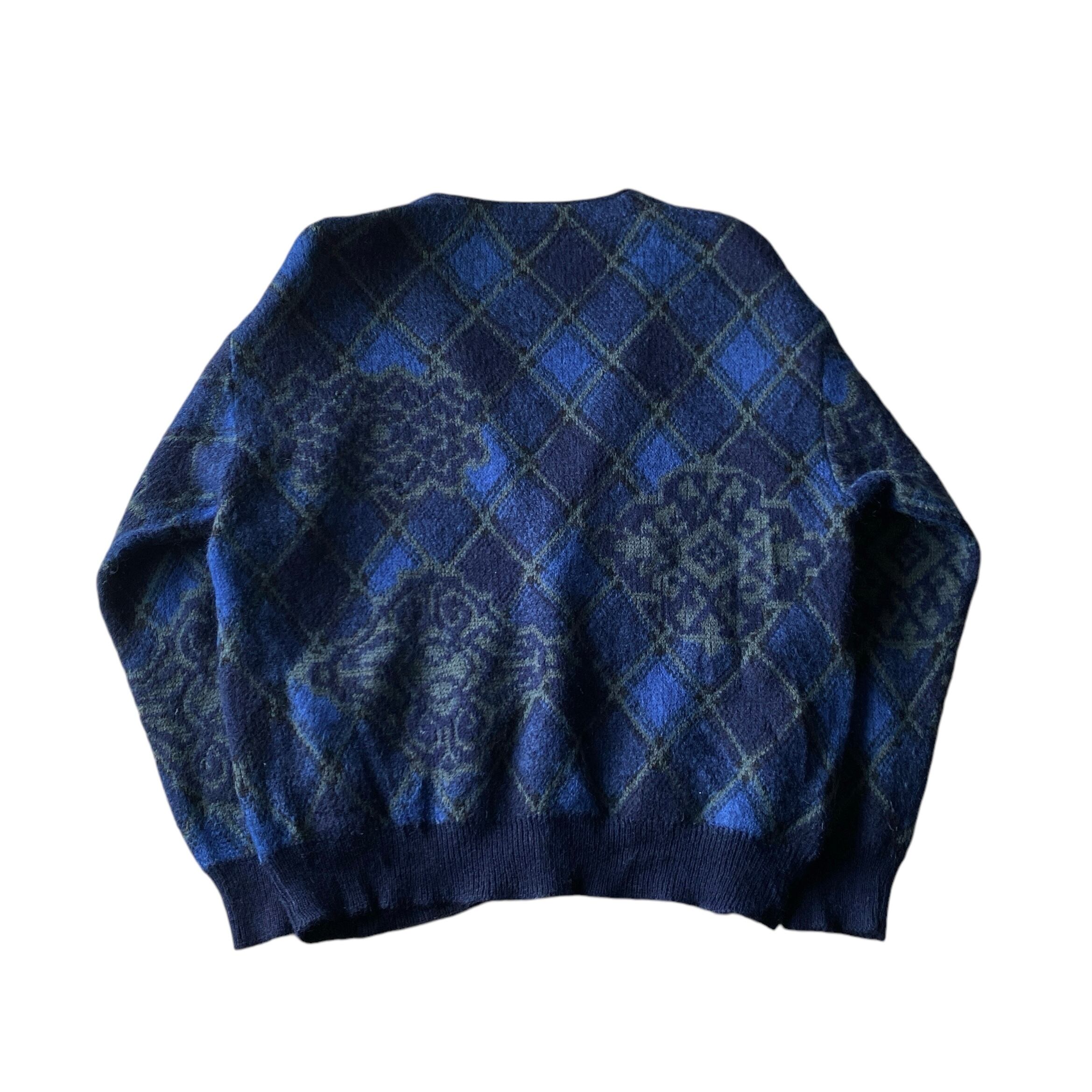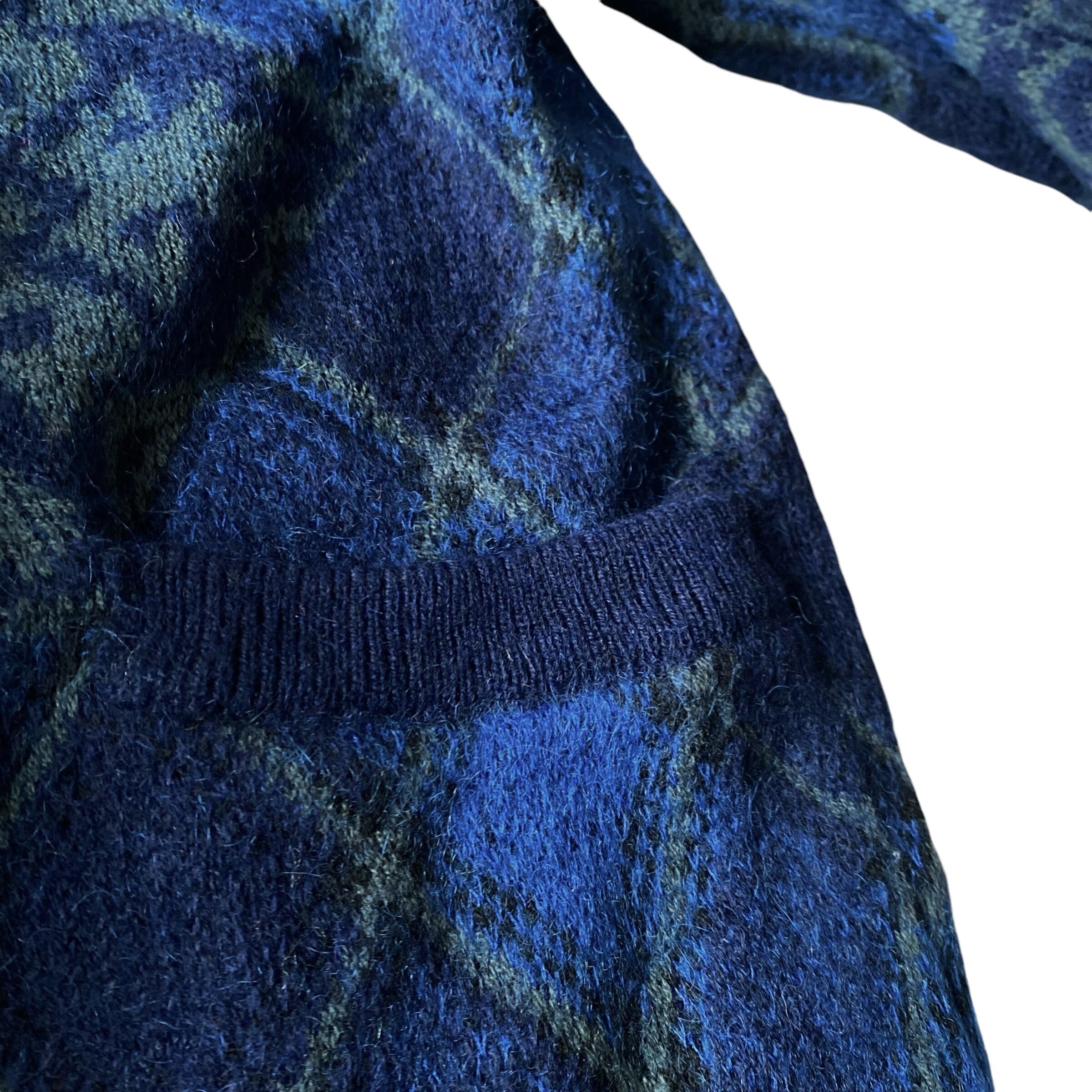 ブラック×ネイビー×くすみブルー×グレーオリーブの好配色に、アーガイルベースのエスニック?なデザイン、丸みのあるボックスシルエットが非常に格好良い一着。
