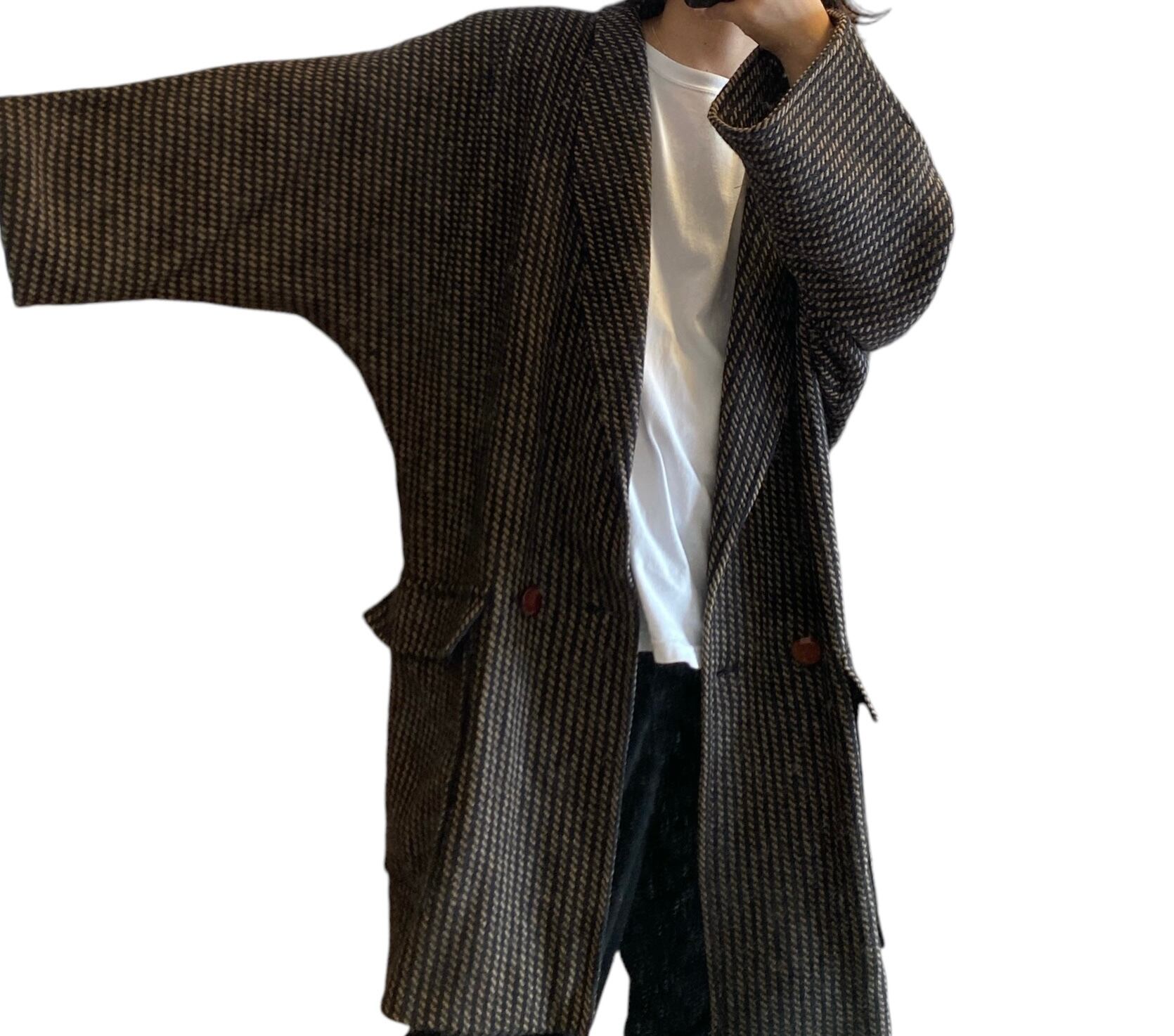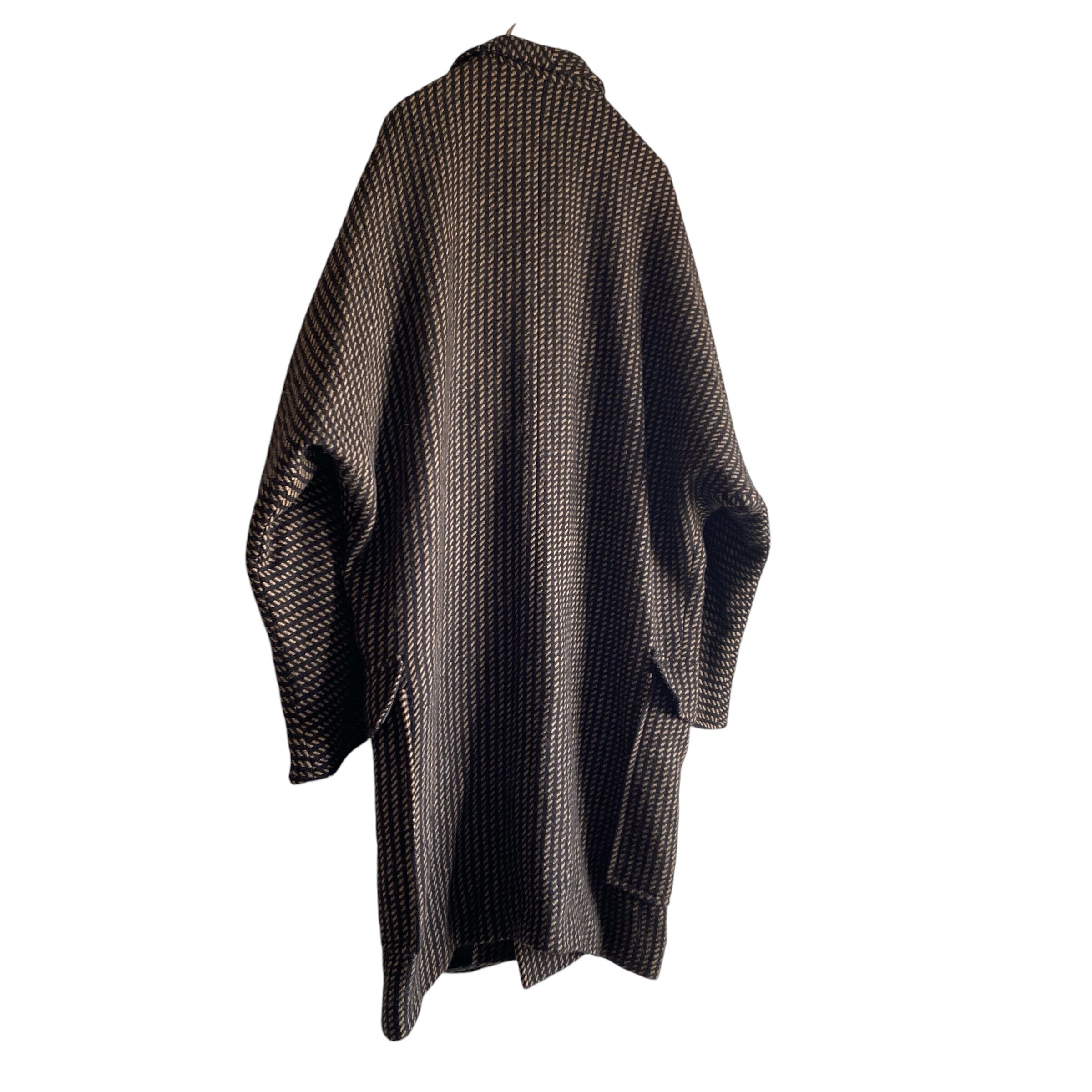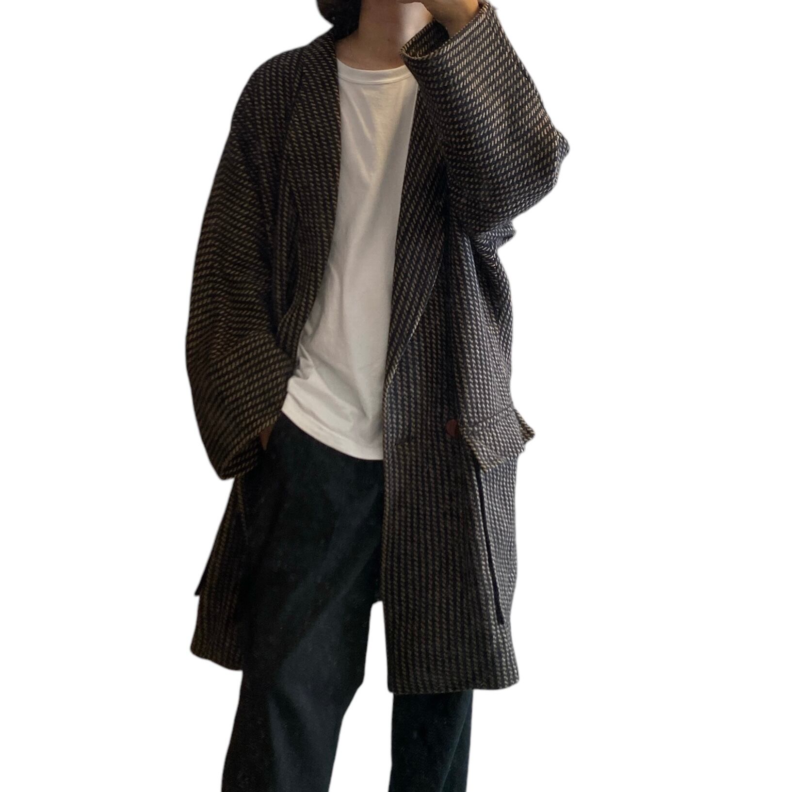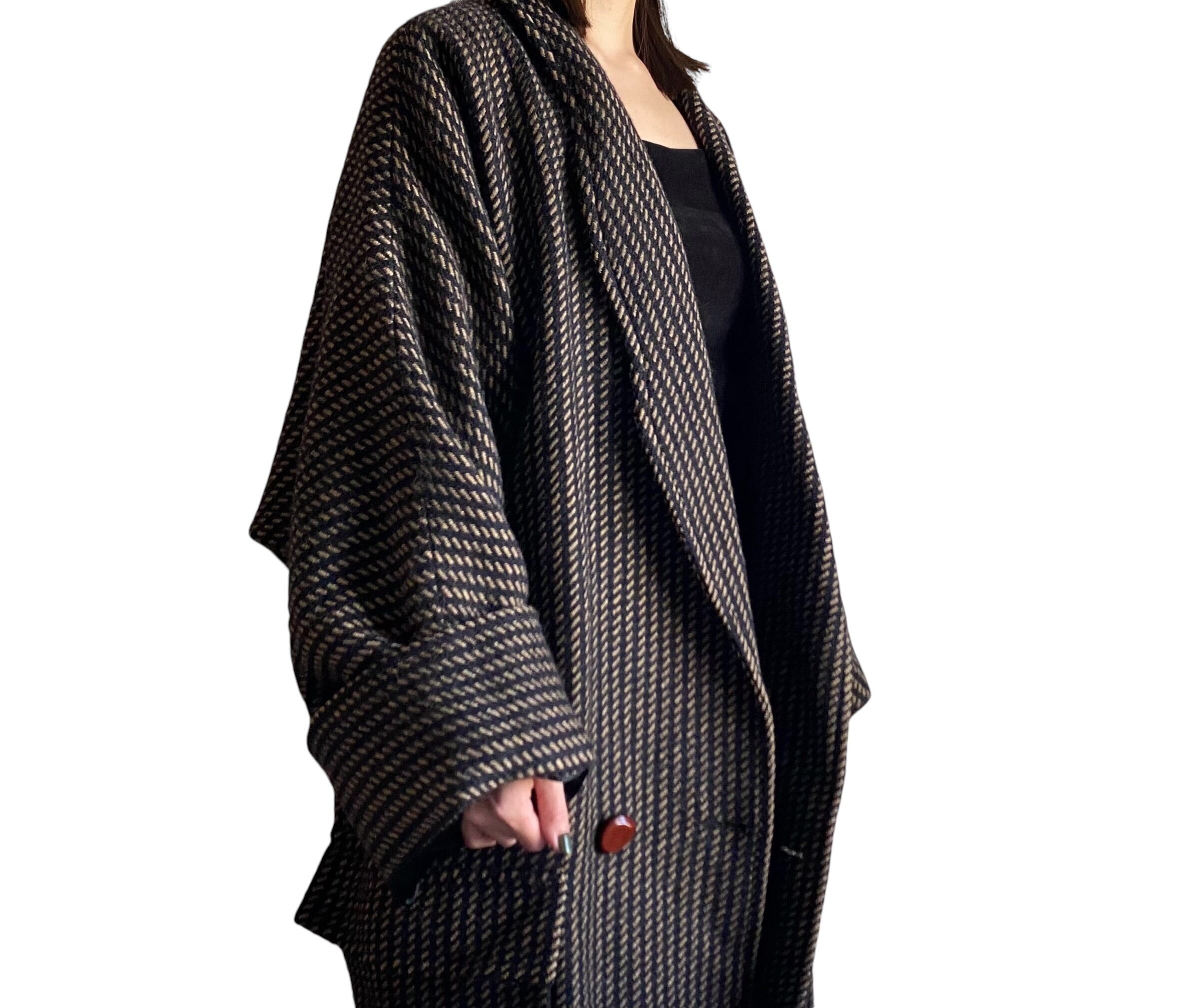どこか和服を彷彿とさせるような、大判な用尺とドルマンスリーブを採用した美しいシルエット、品質タグが欠損しておりますが、おそらくウールモヘア素材の肉厚で織柄が効いたファブリックが大変素晴らしい一着。