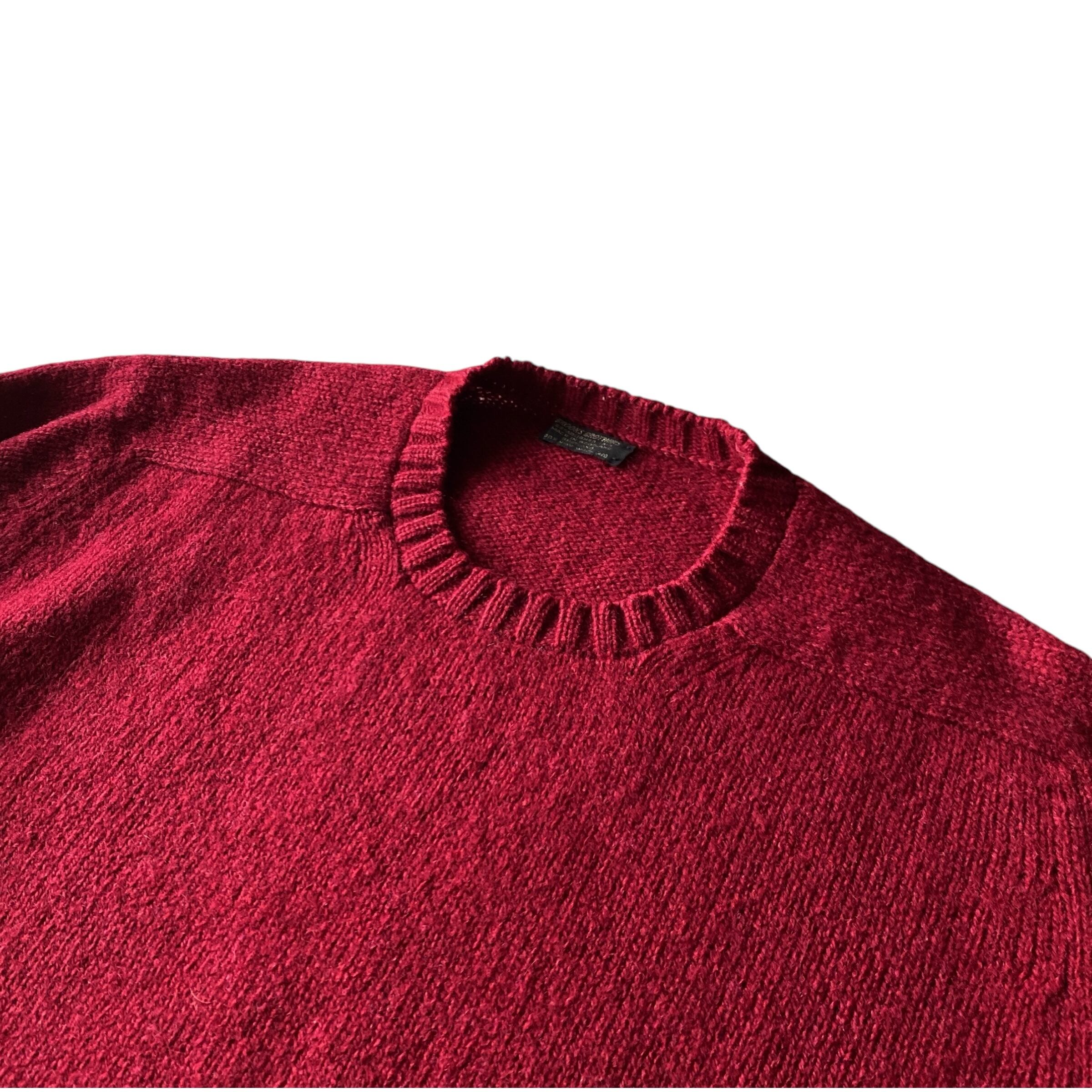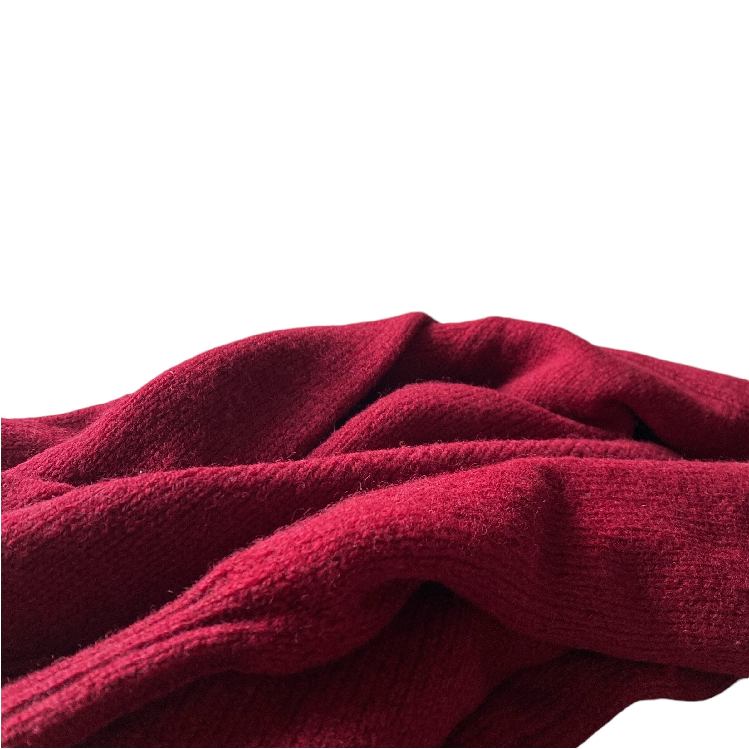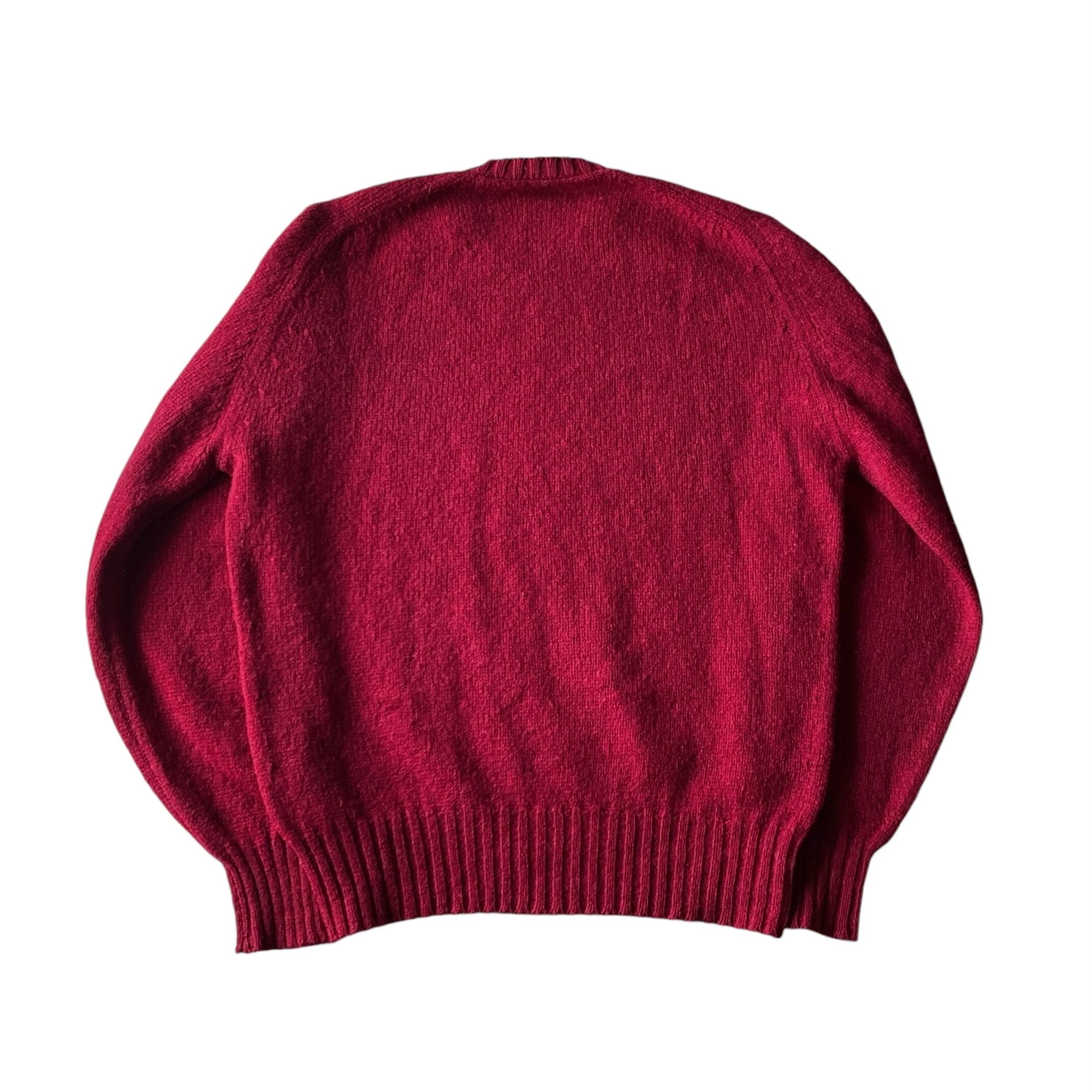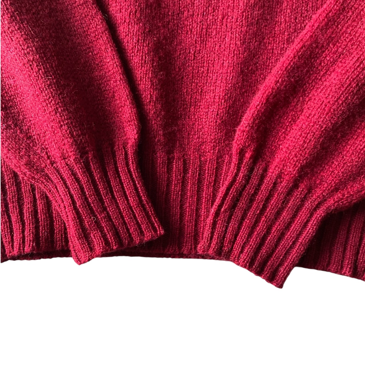 上品なベリーレッドカラー(通常の赤より黒みのある良い色です)に、シェットランドウール特有の肉厚でサクッとした温かみのある素材感が素晴らしい一着。