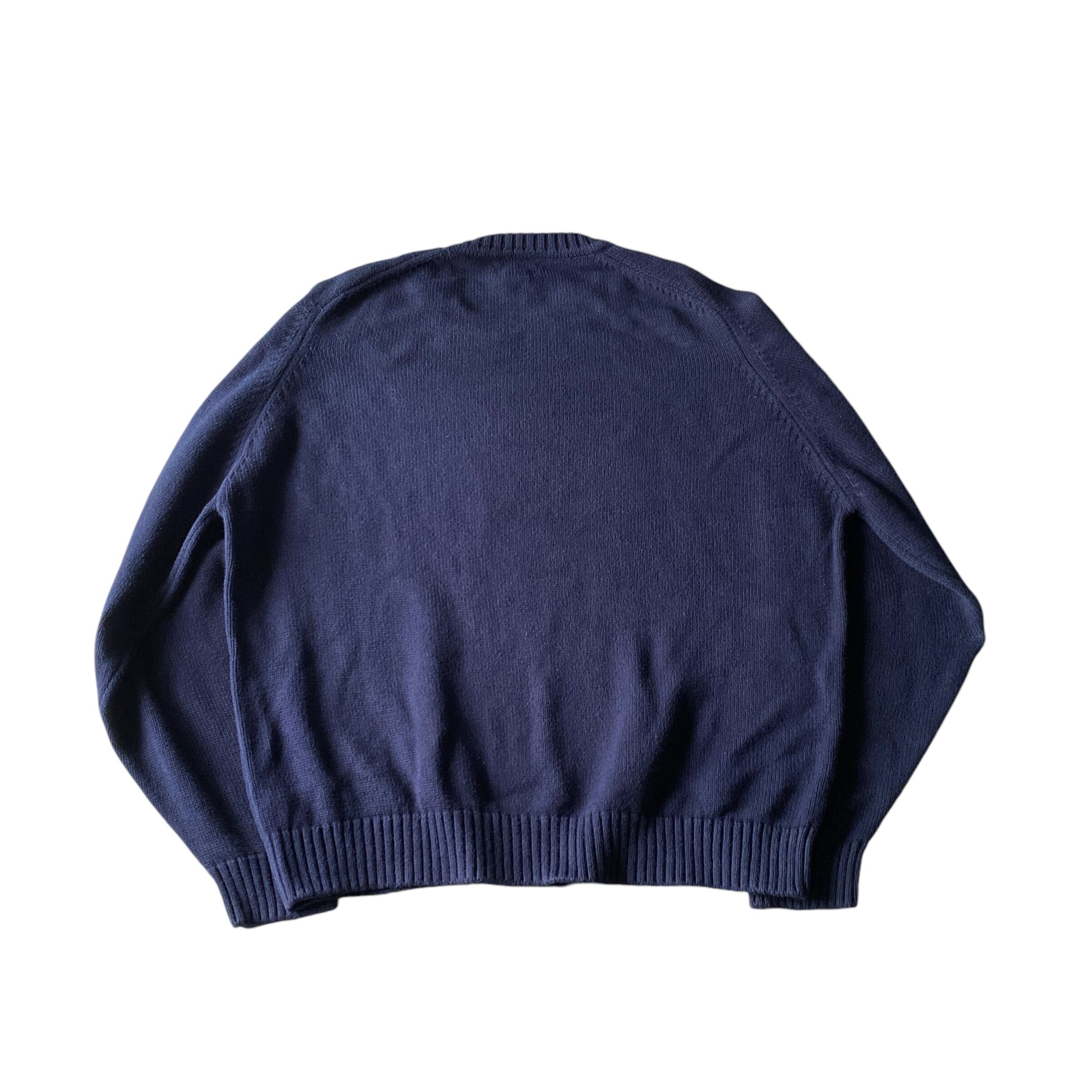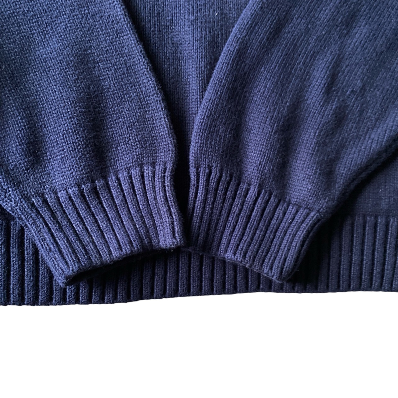 上品なダークネイビーカラーに、肉厚で柔らかなコットンニット素材、ゆったりとした丸みのあるシルエットが非常に格好良い一着。