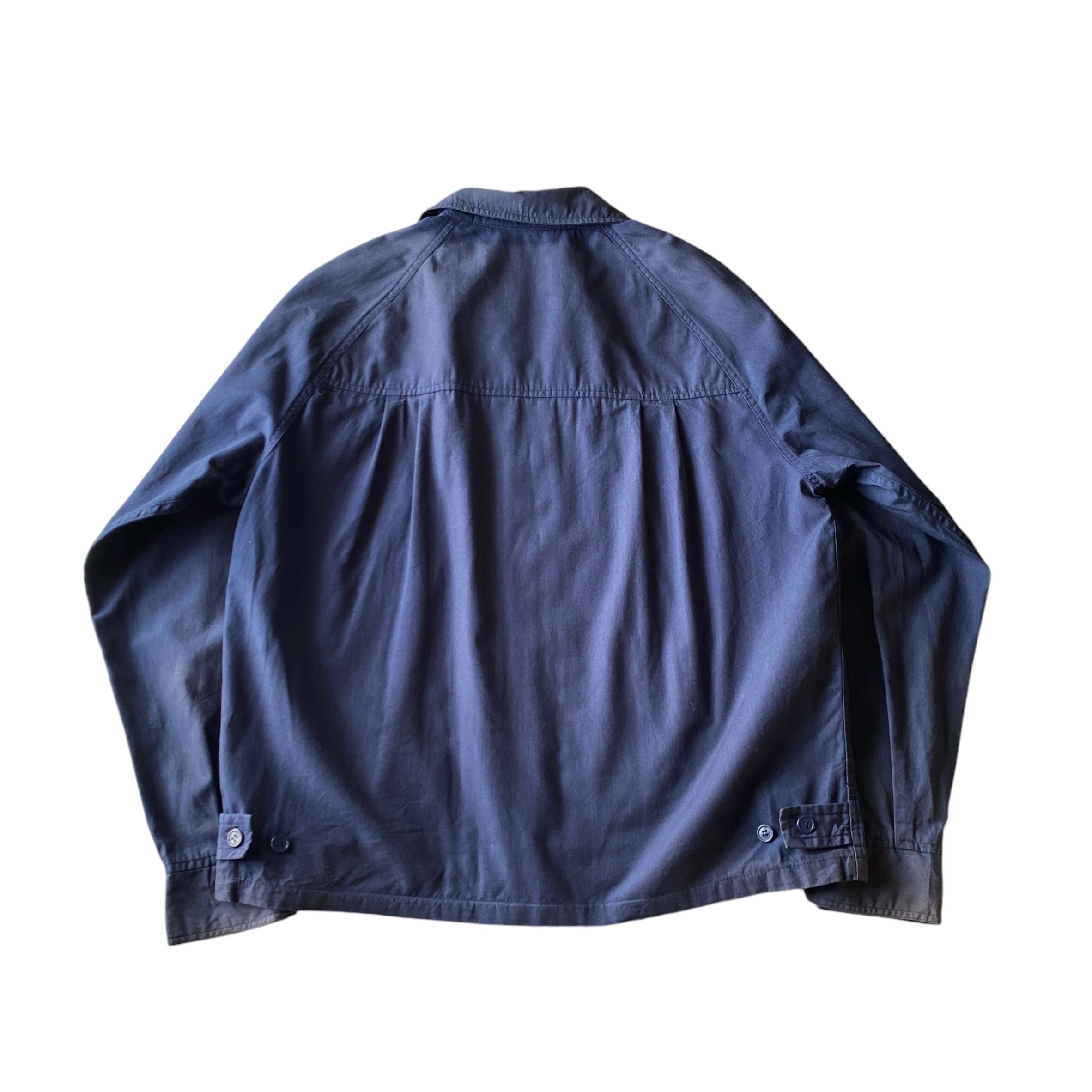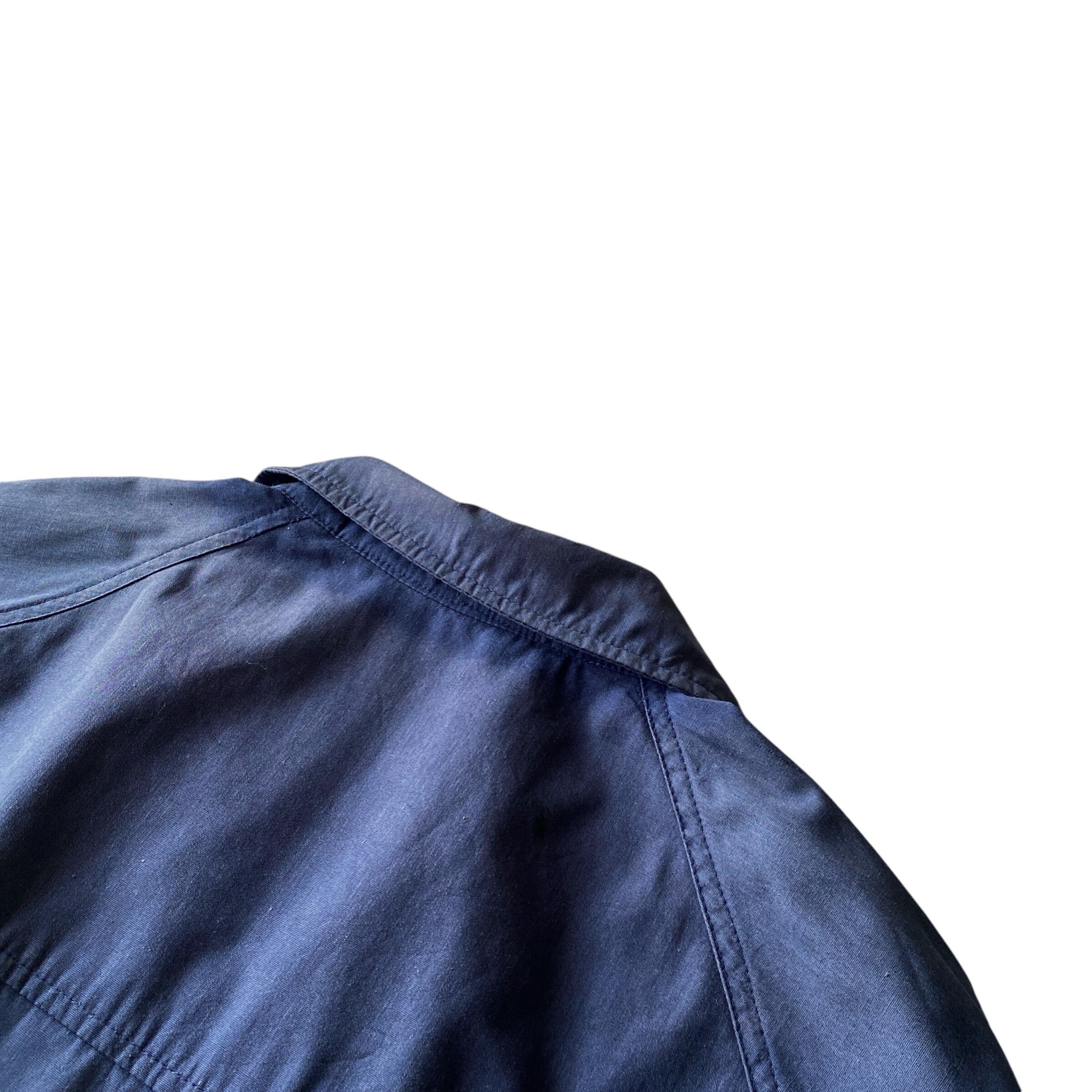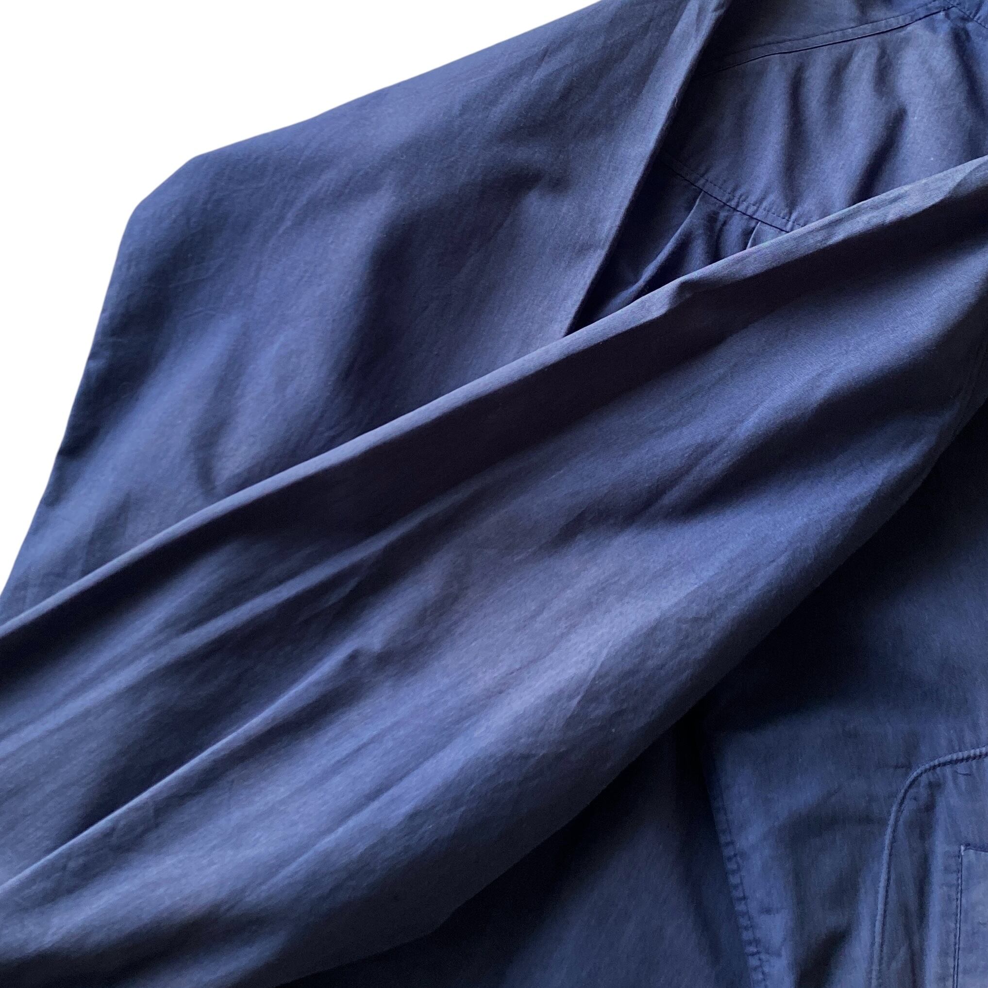ユーロのカバーオールなどを彷彿とさせるようなくすみ感のあるブルーカラーに、ムラ感のあるサンフェード、チンスト付きの短丈ボックスシルエットが非常に格好良い一着。
