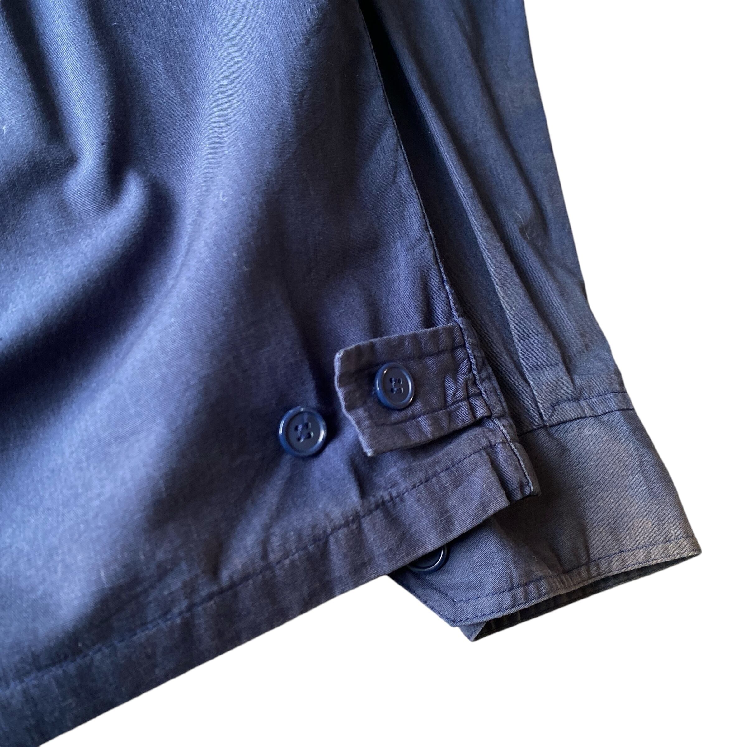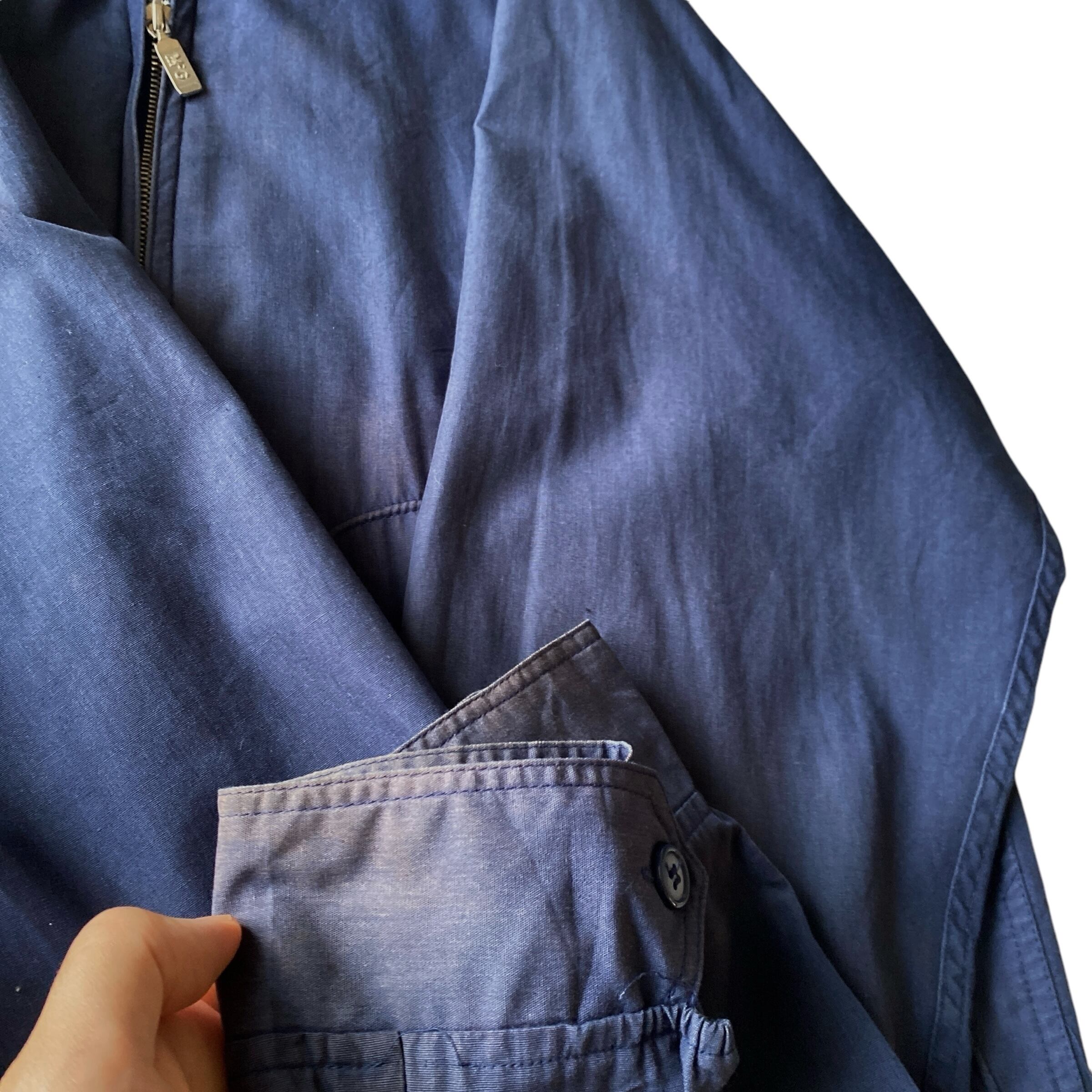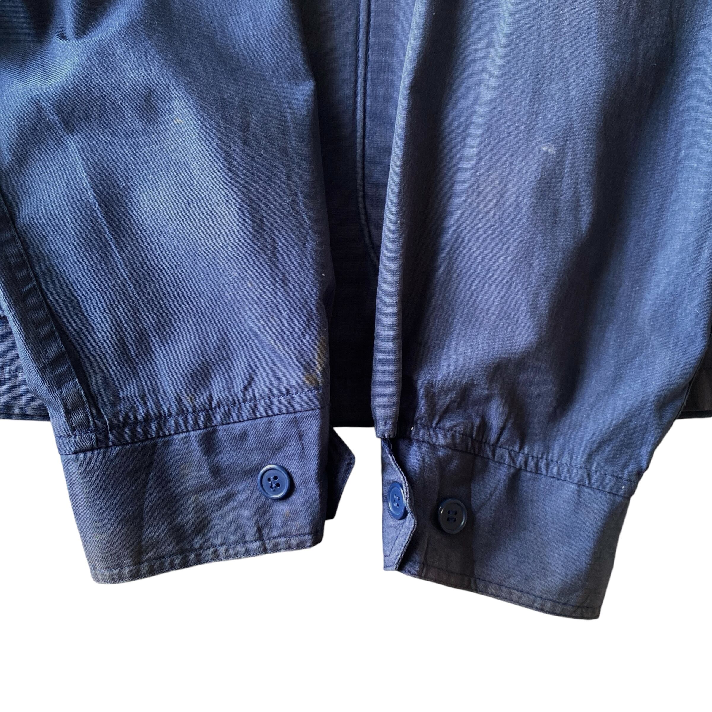 ユーロのカバーオールなどを彷彿とさせるようなくすみ感のあるブルーカラーに、ムラ感のあるサンフェード、チンスト付きの短丈ボックスシルエットが非常に格好良い一着。