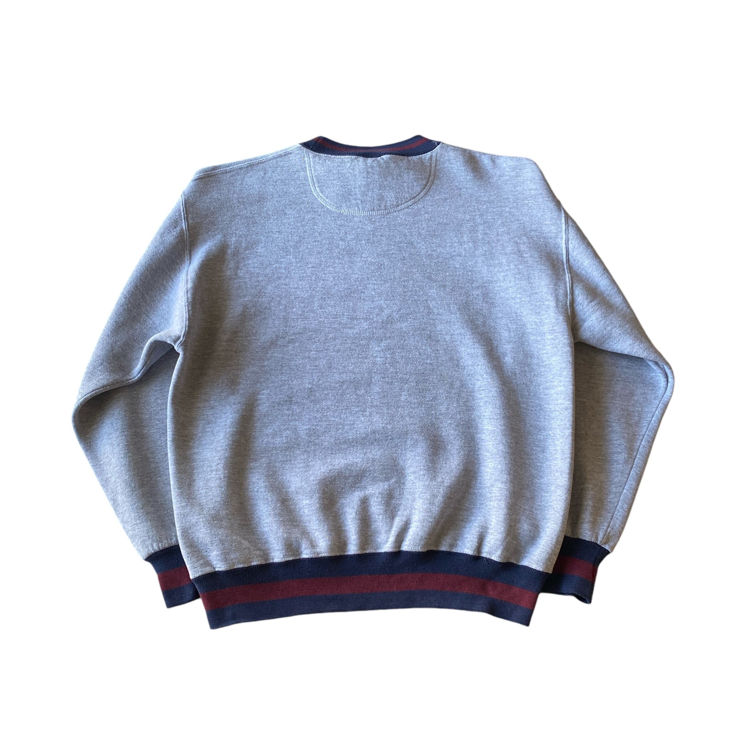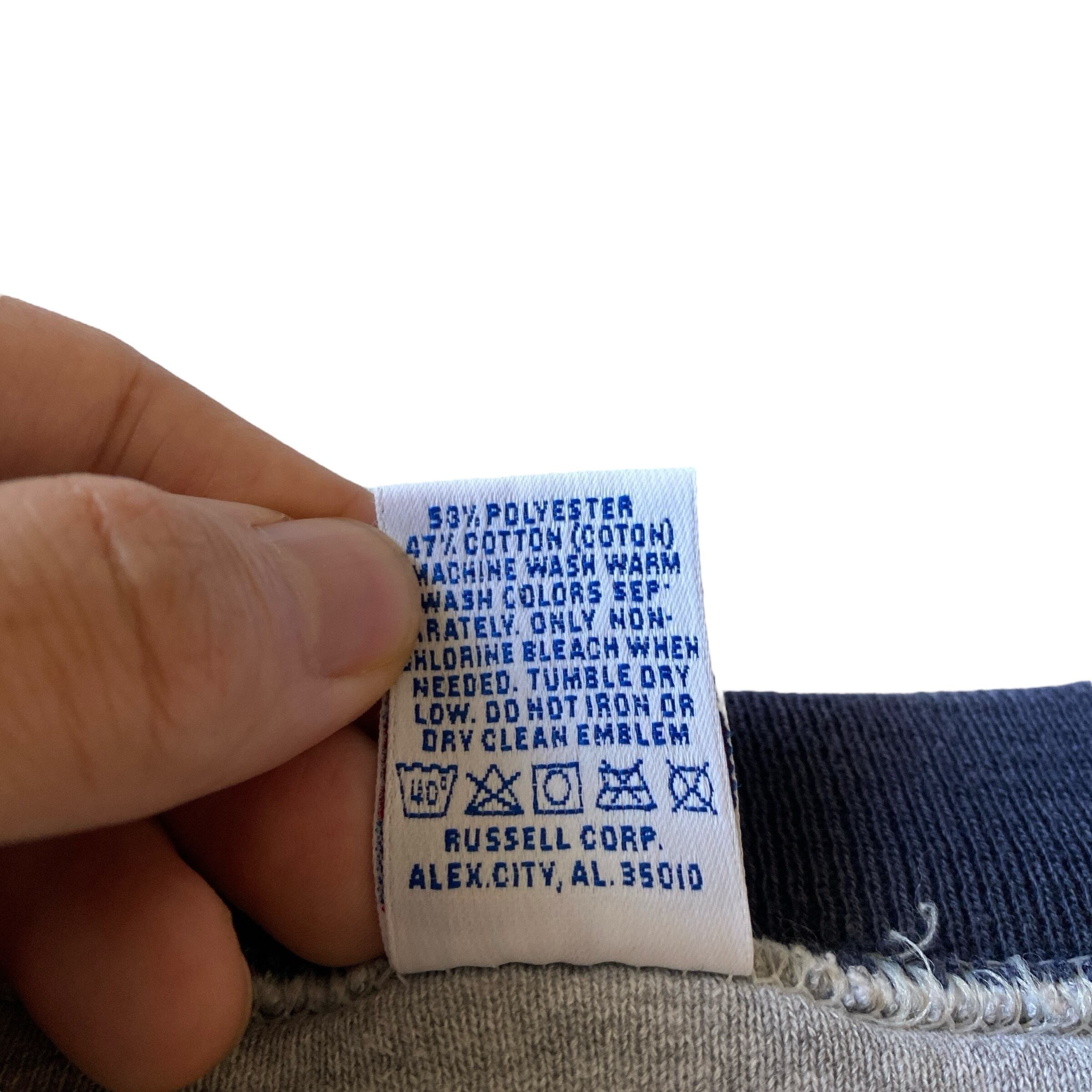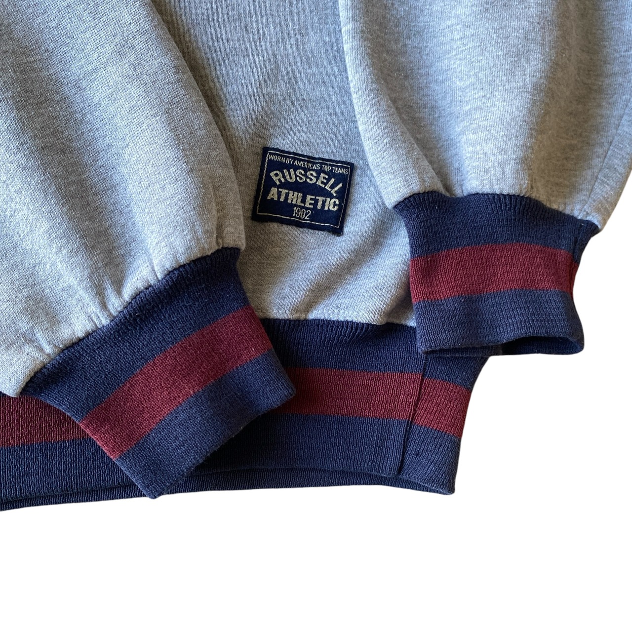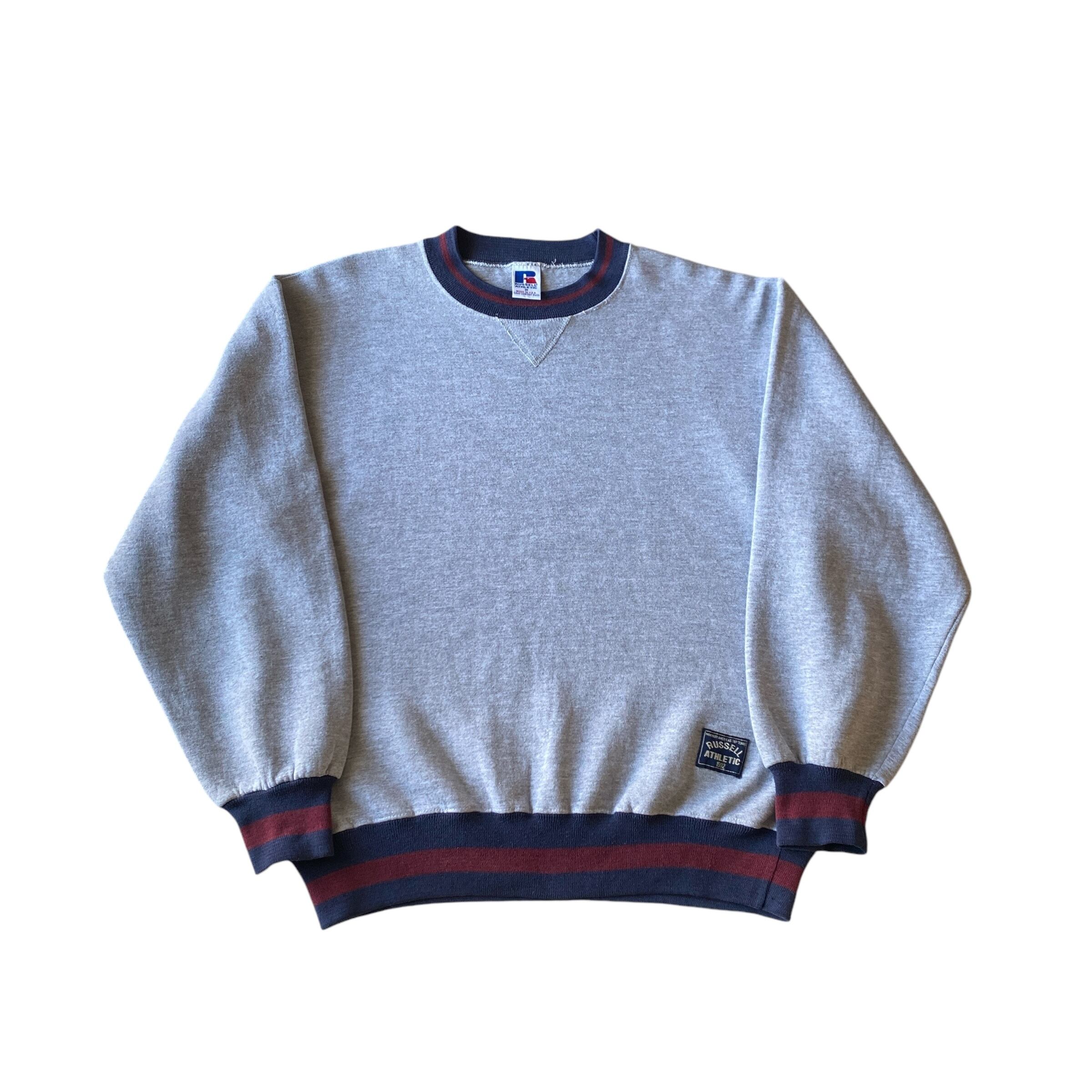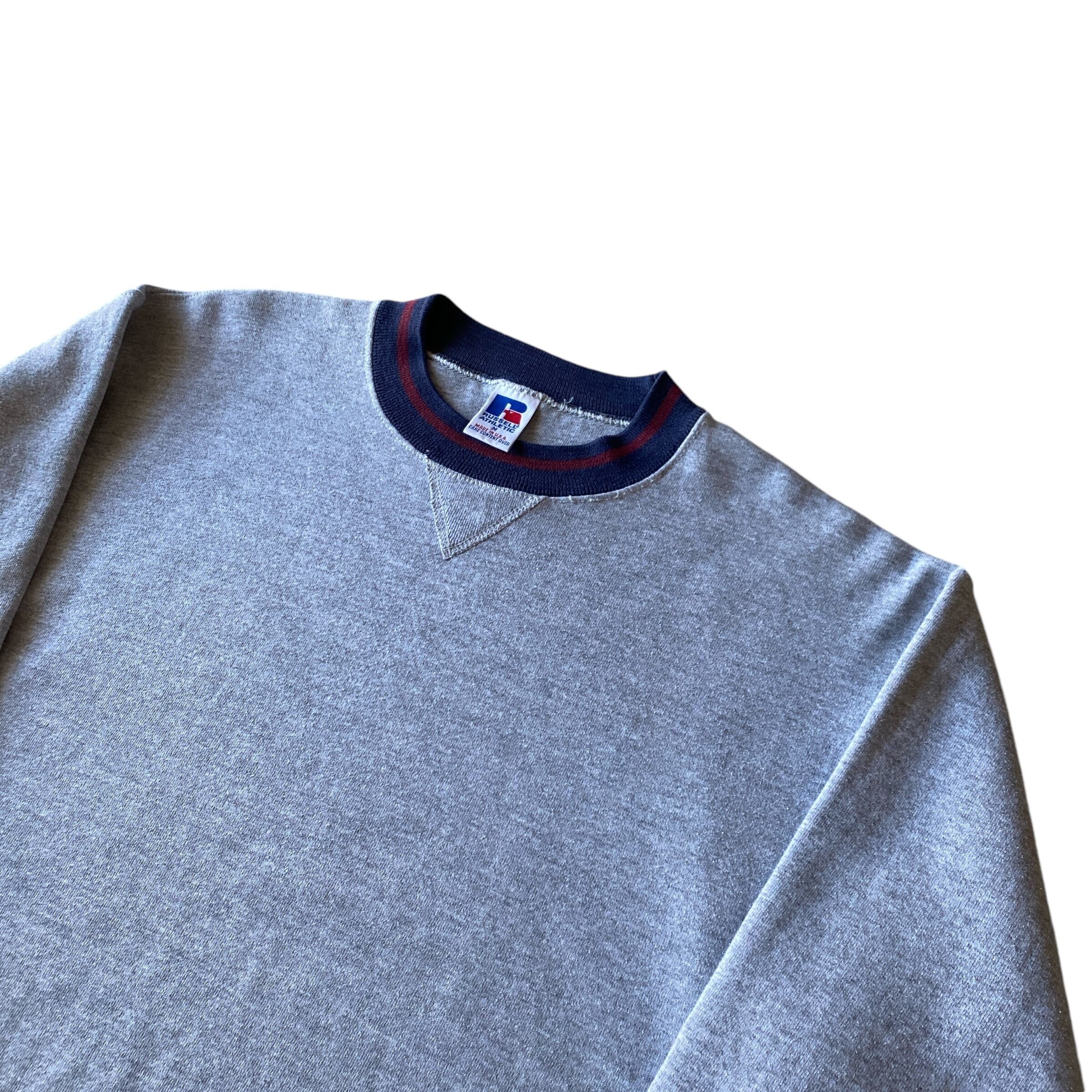 グレーベースのボディにネイビー×ダークレッドのリブライン、ラッセル特有の肉厚なコットンポリ素材のモチっとした生地感、丸みのあるボックスシルエットがグッドな一着。