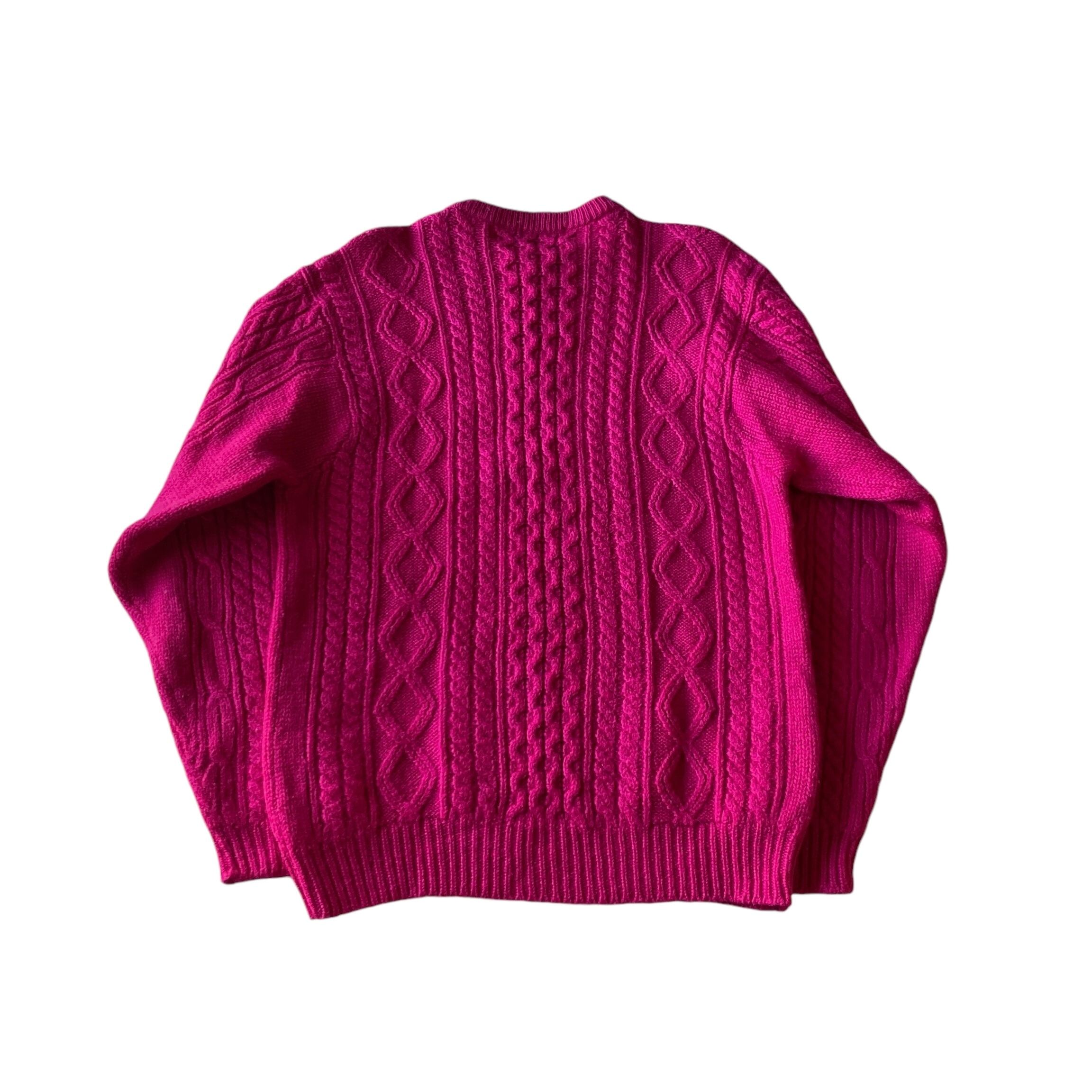 肉厚でもちっとした上質なウール地に、ギャルみを感じる綺麗なショッキングピンクカラーが非常に素晴らしい一着。(製品タグが飛んでいますが、SUTTONとあるのでイギリス製のウールニットではないかと思います)