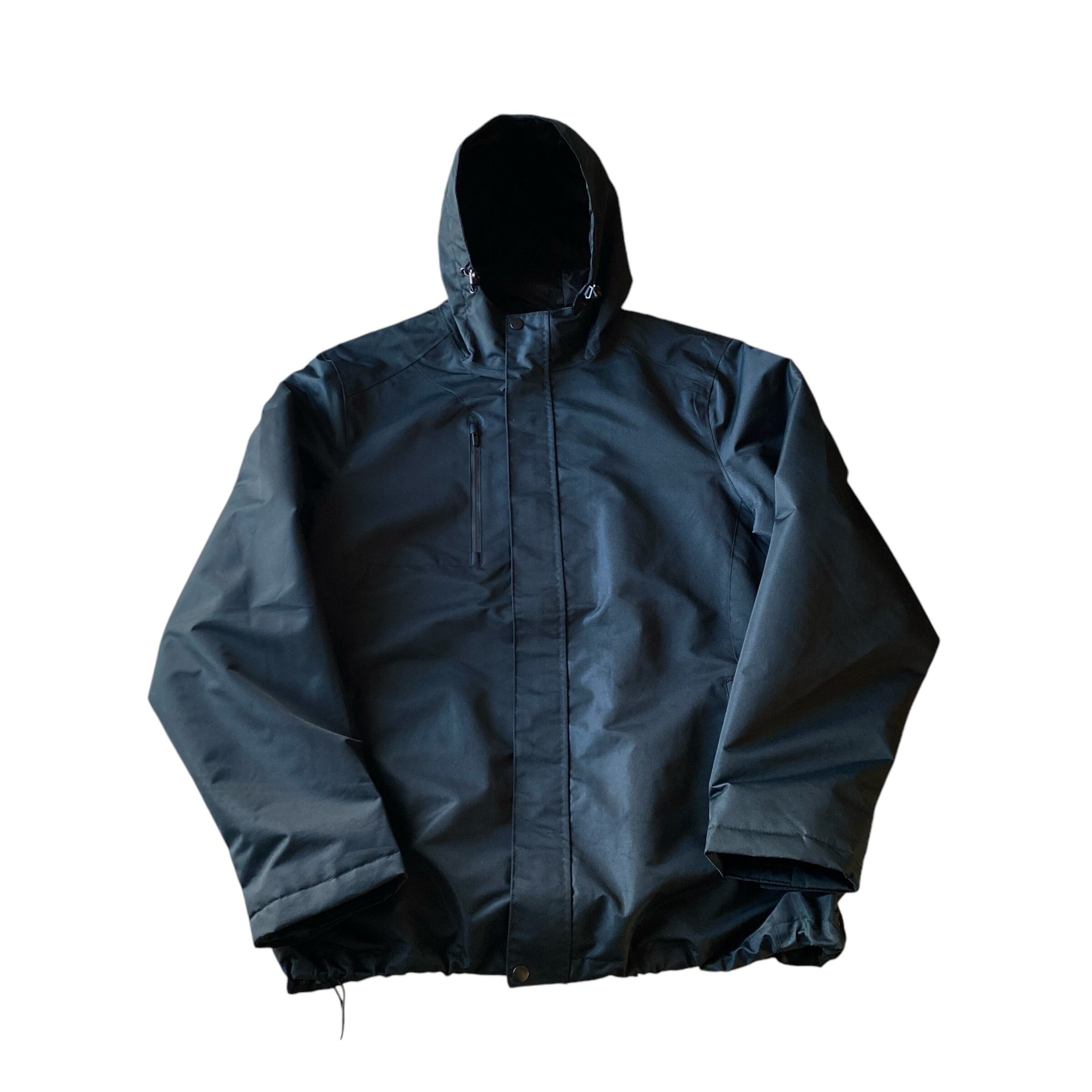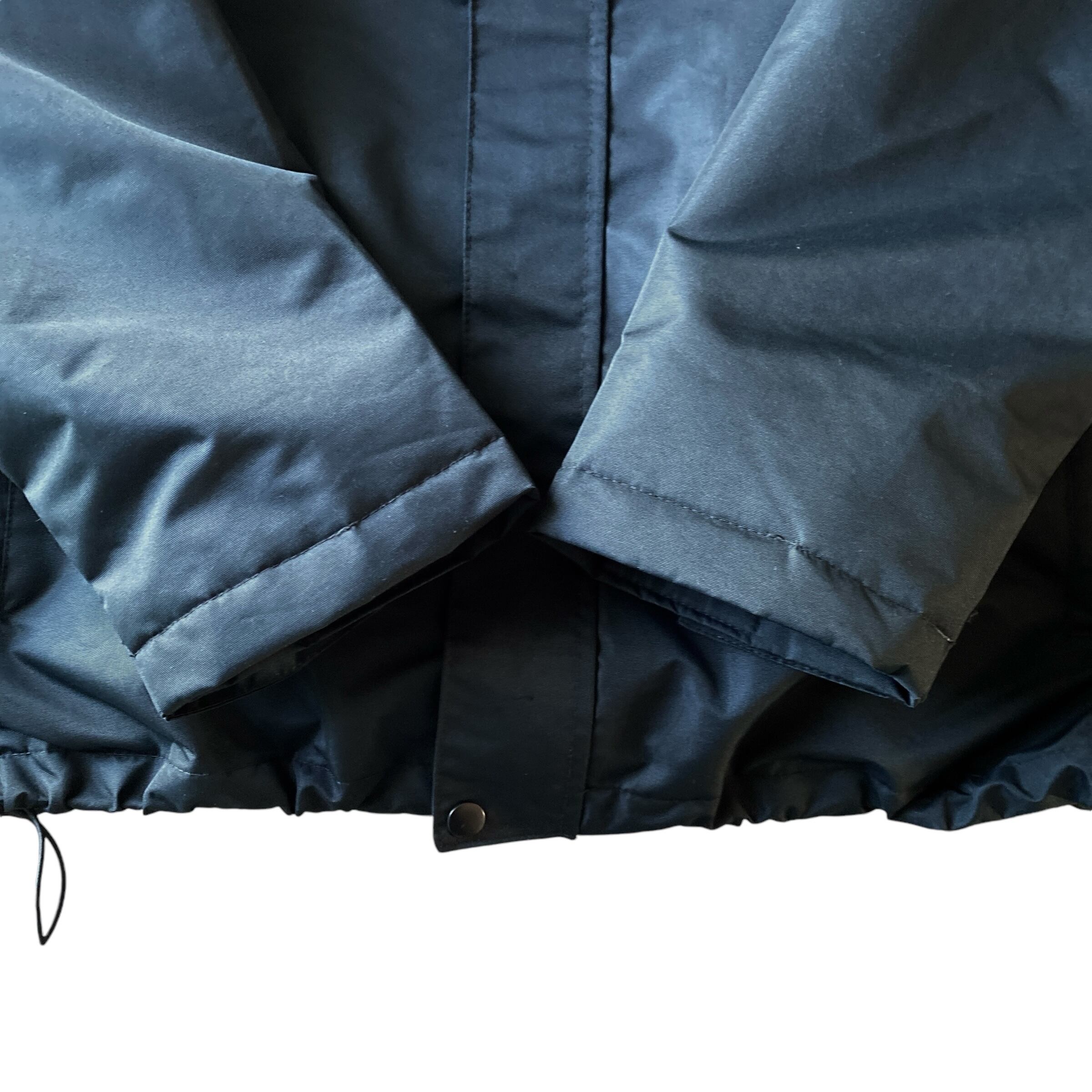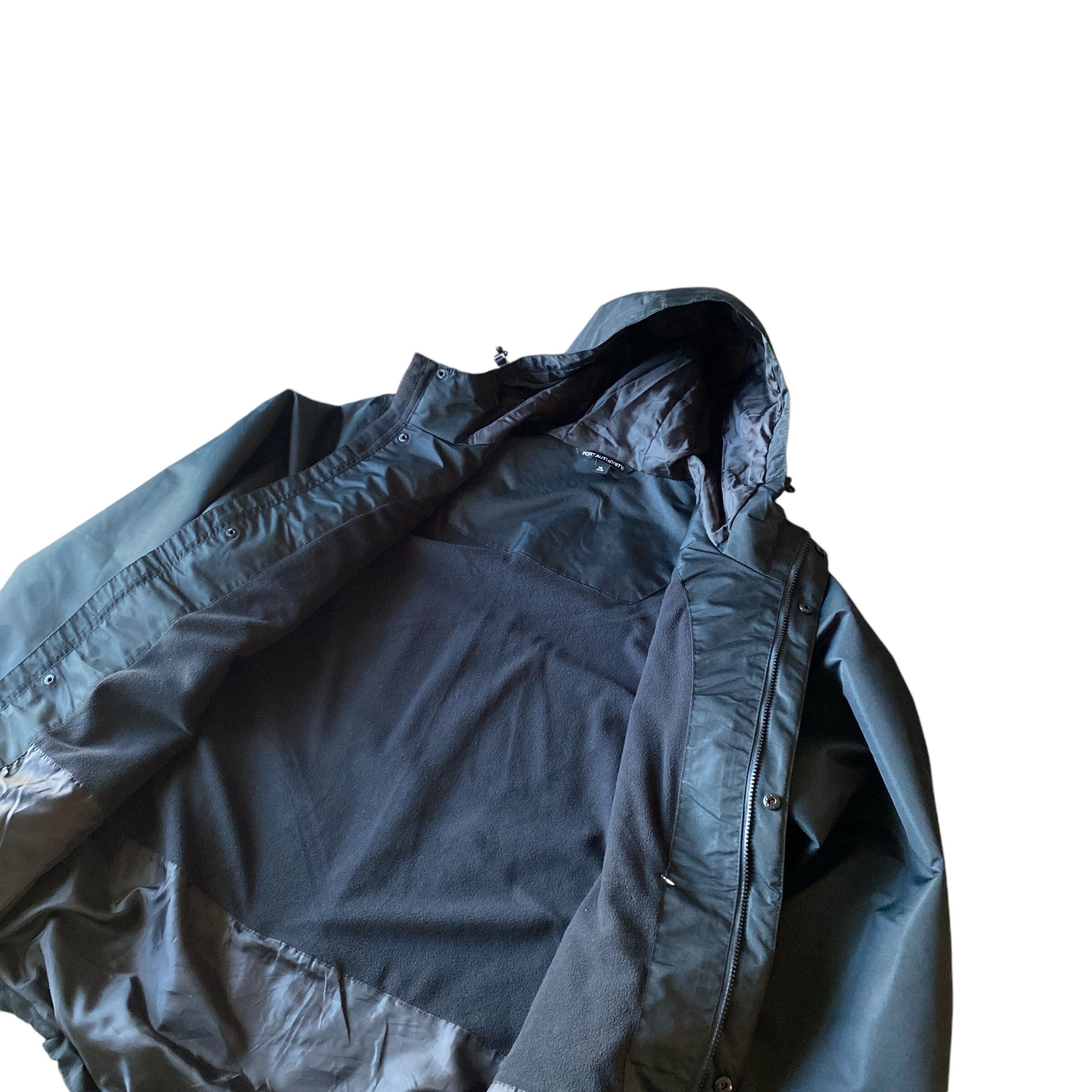少しブルーグレーみのあるブラックカラーに、防水のタフなポリエステル生地、肉厚なフリースの裏地と、実用的かつファッショナブルで非常に格好良い一着。