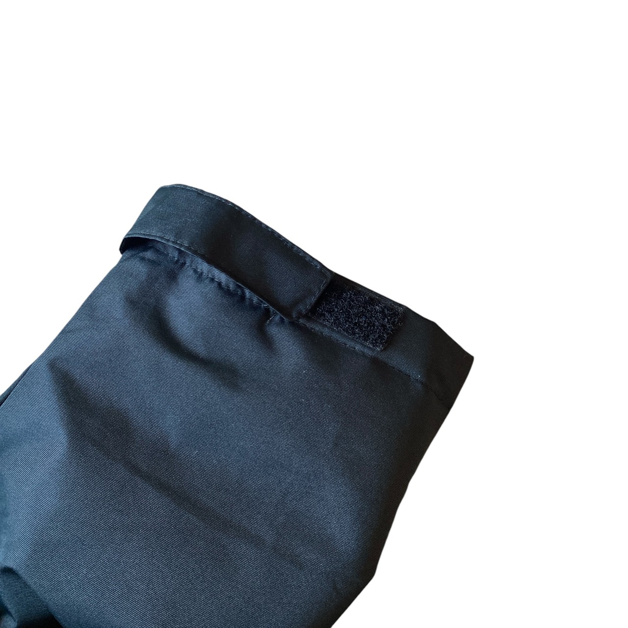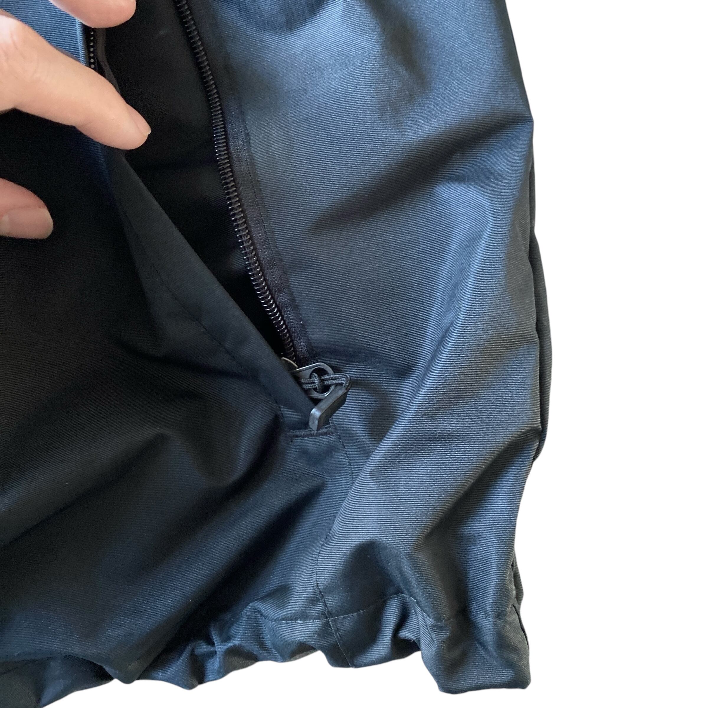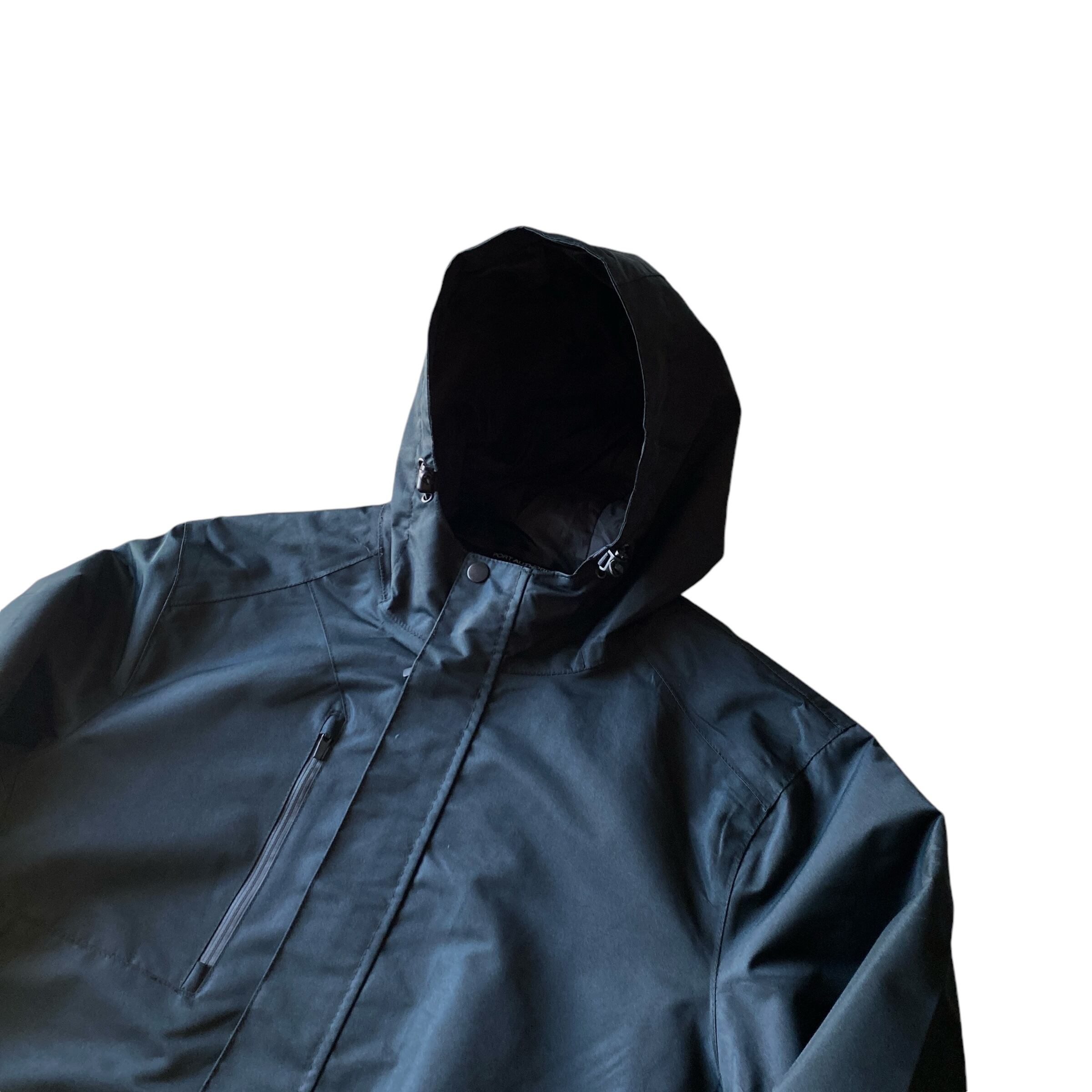 少しブルーグレーみのあるブラックカラーに、防水のタフなポリエステル生地、肉厚なフリースの裏地と、実用的かつファッショナブルで非常に格好良い一着。