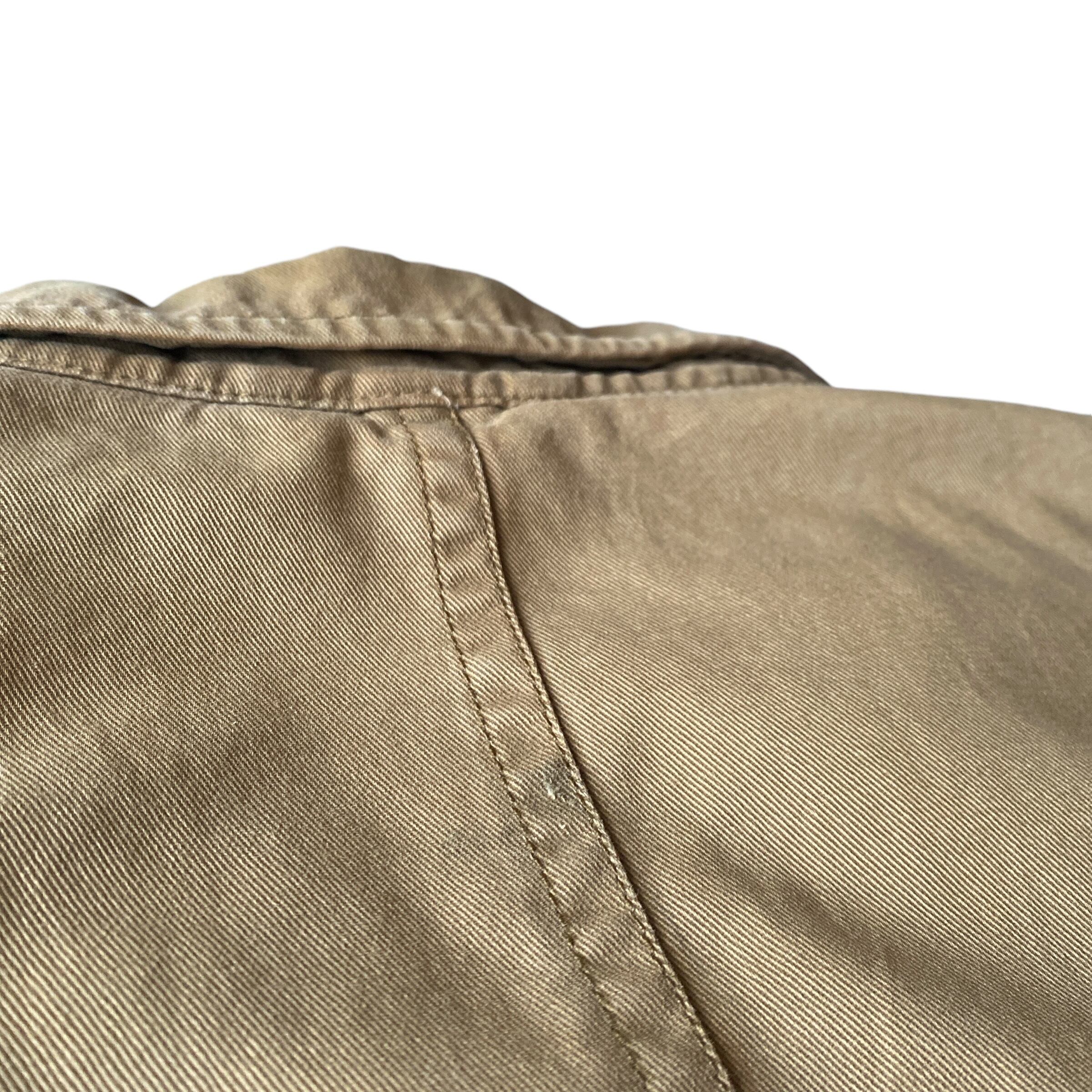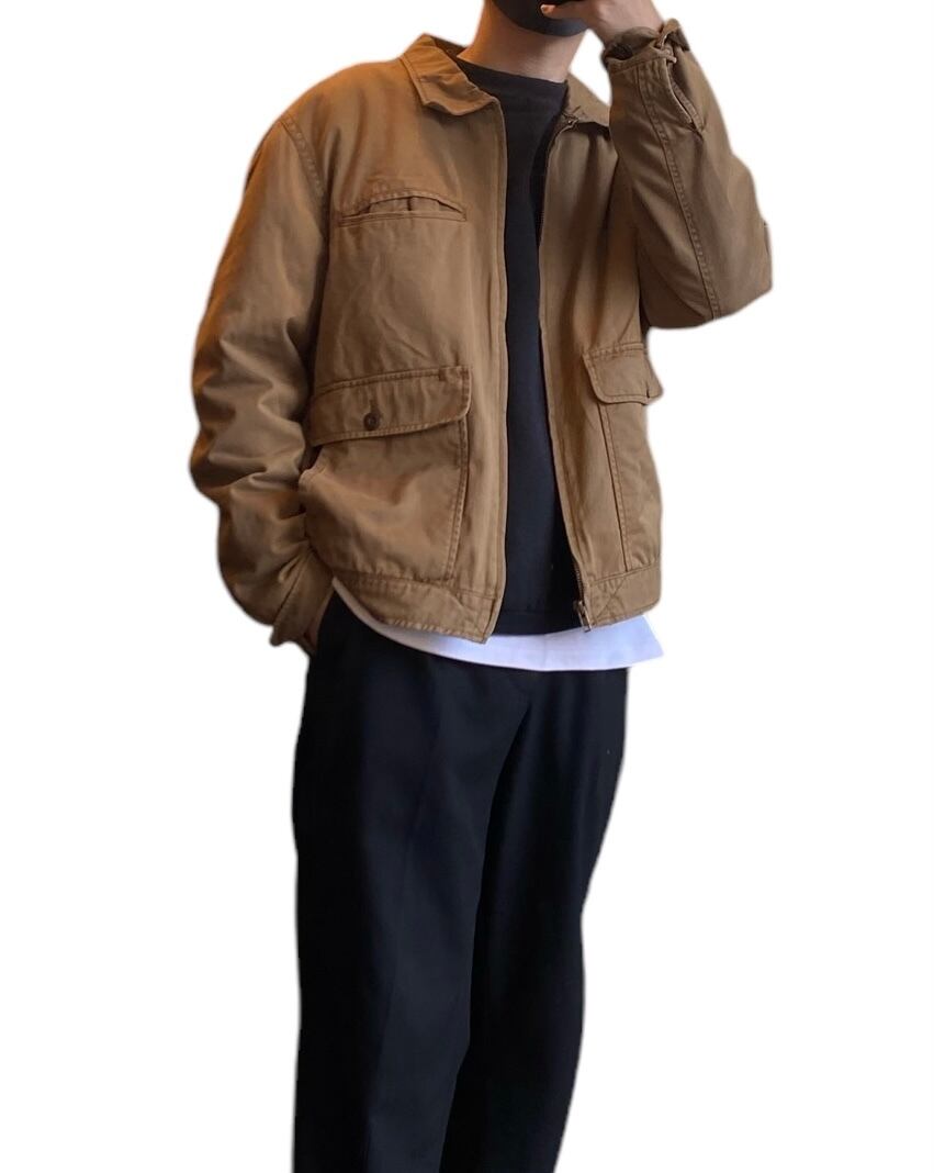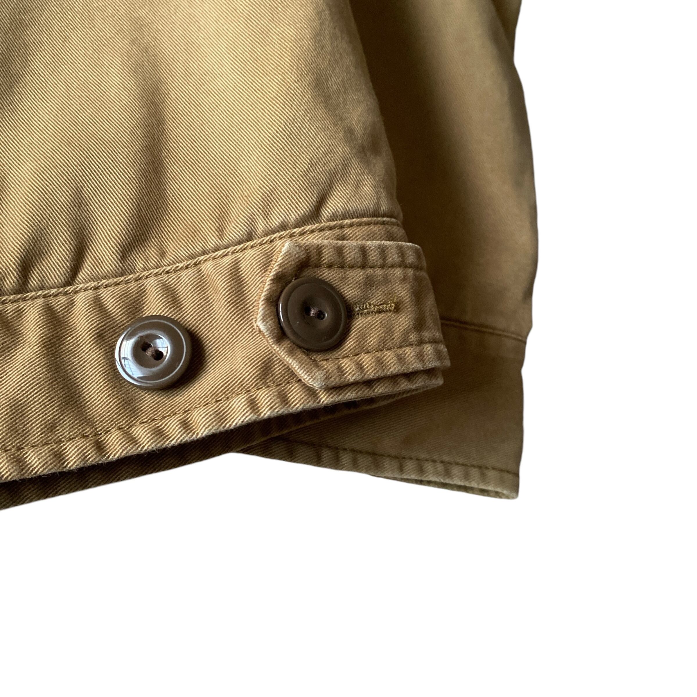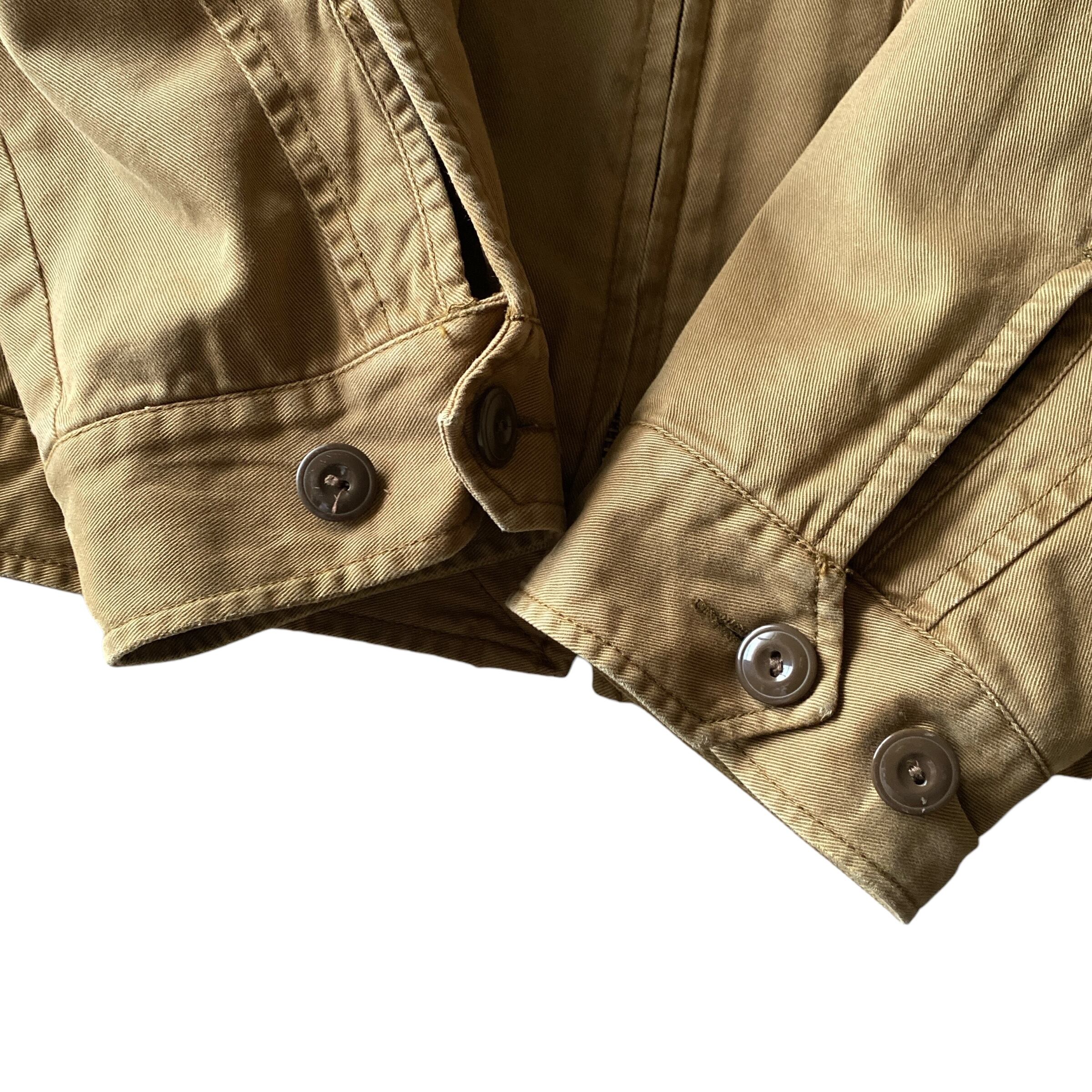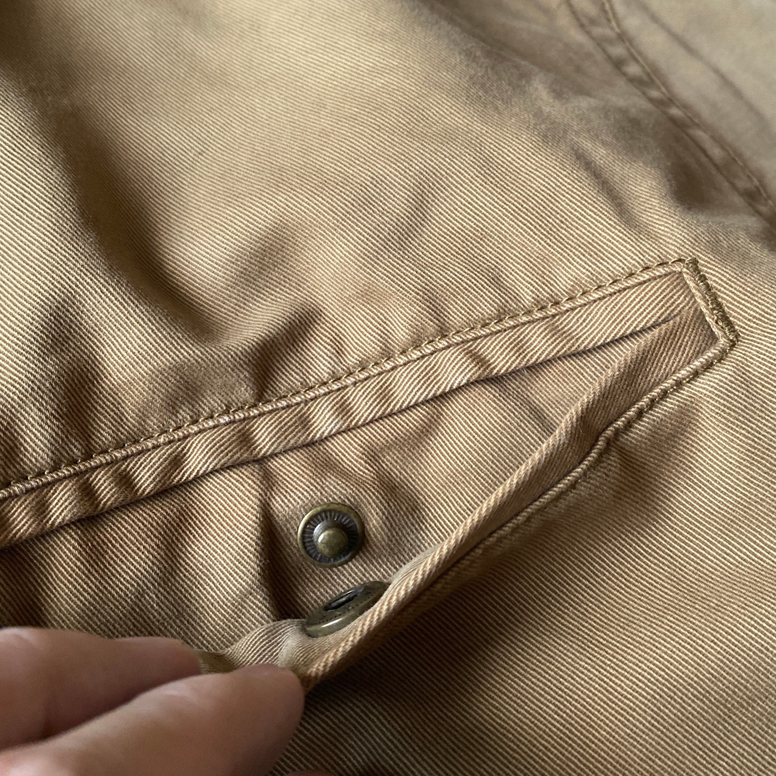 雰囲気の良いカーキブラウンカラーに、滑らかで柔らかいコットンツイル素材、おそらくフライトジャケットサンプリングの短丈ボックスシルエットが、無骨で非常に格好良い一着。