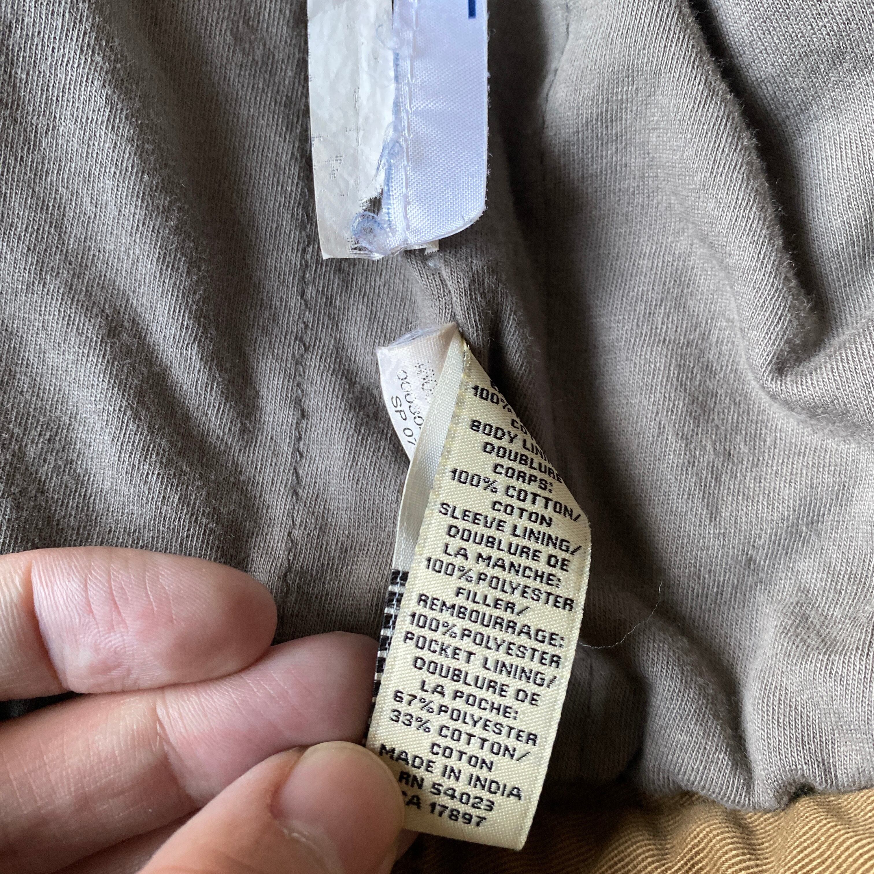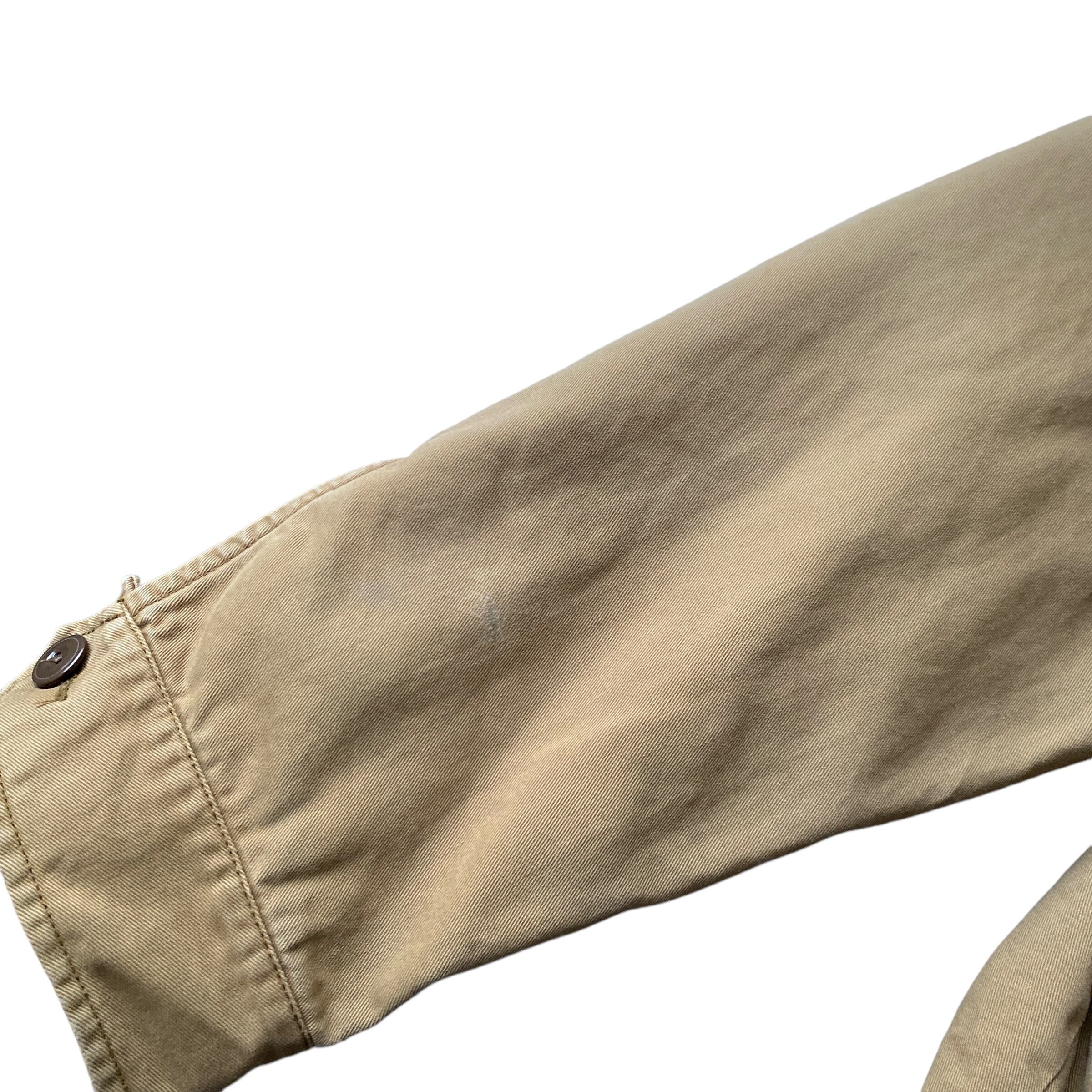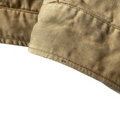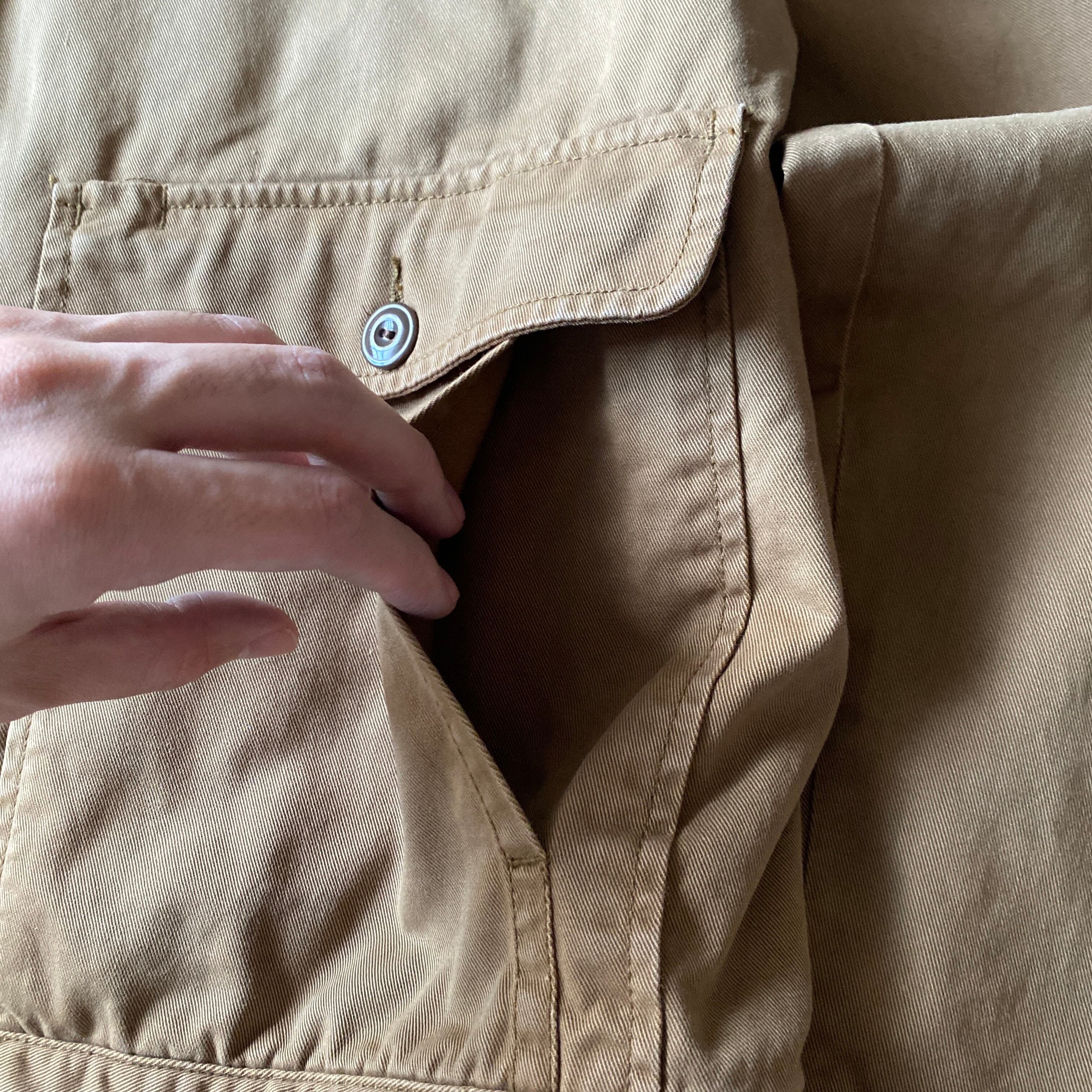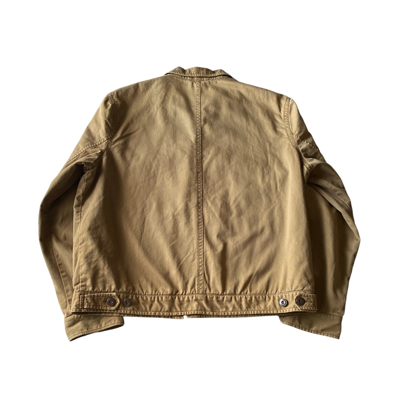 雰囲気の良いカーキブラウンカラーに、滑らかで柔らかいコットンツイル素材、おそらくフライトジャケットサンプリングの短丈ボックスシルエットが、無骨で非常に格好良い一着。
