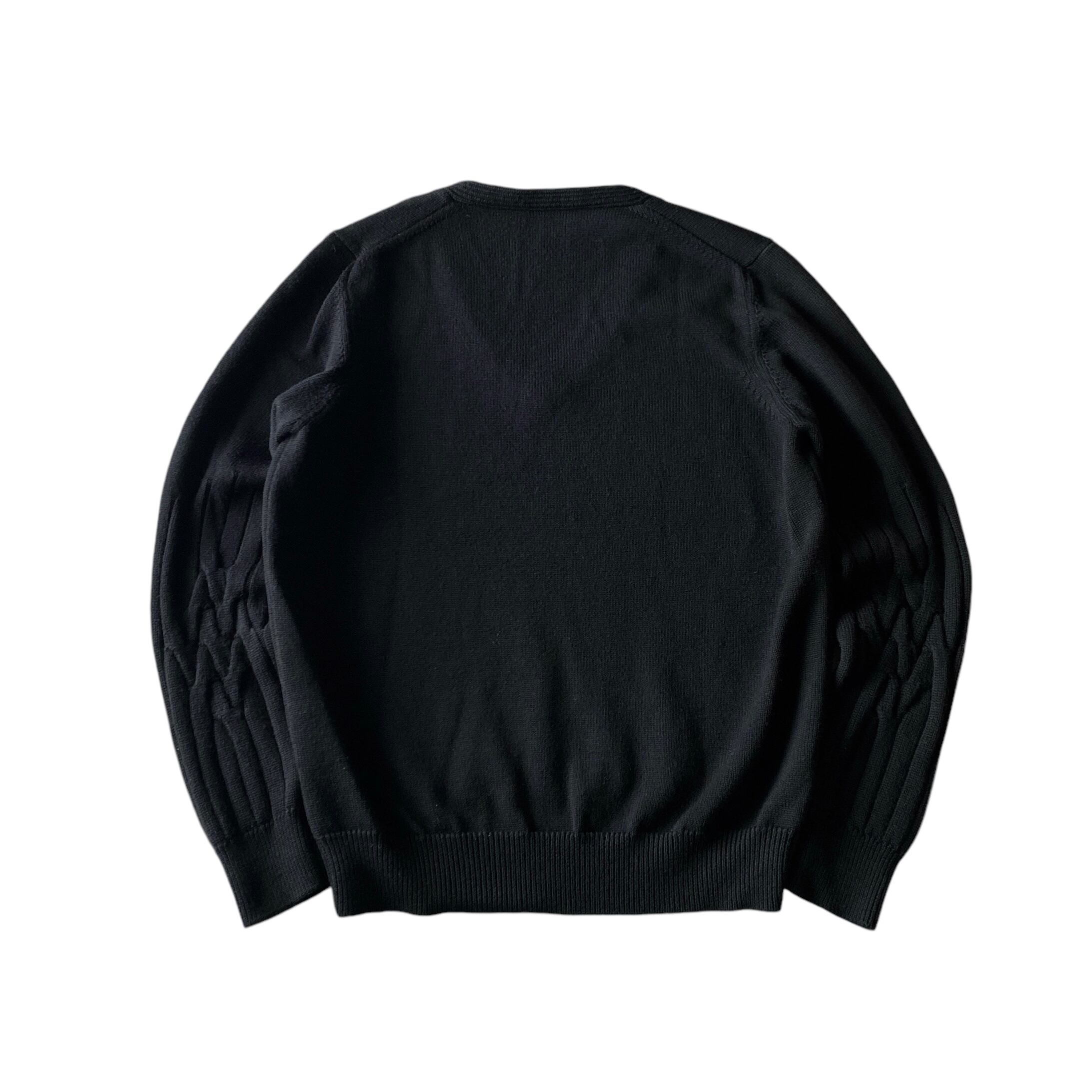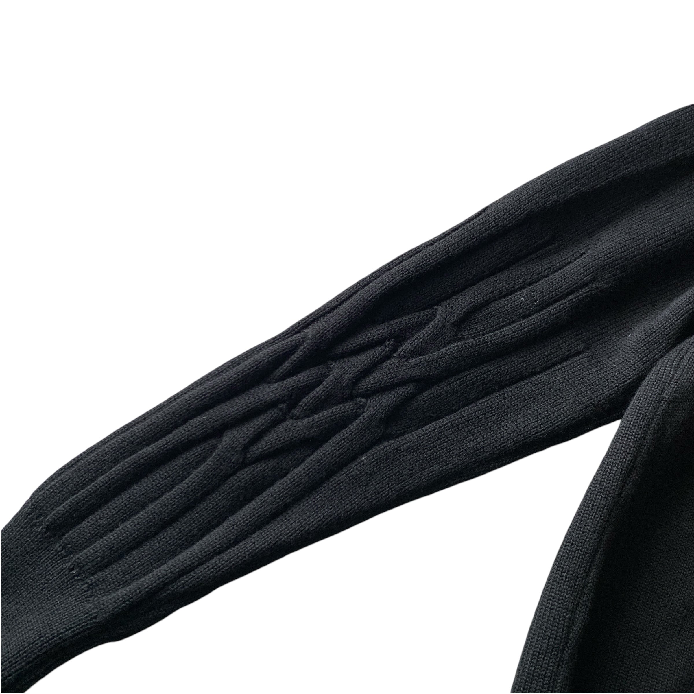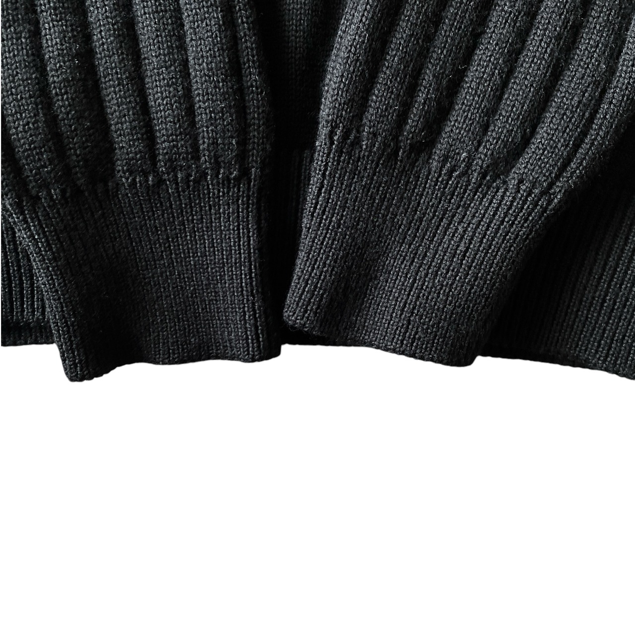肉厚で非常に滑らかな最上級のバージンウールニットに、ブラックカラー、袖のみに入ったケーブル編みのデザインが大変素晴らしい一着。