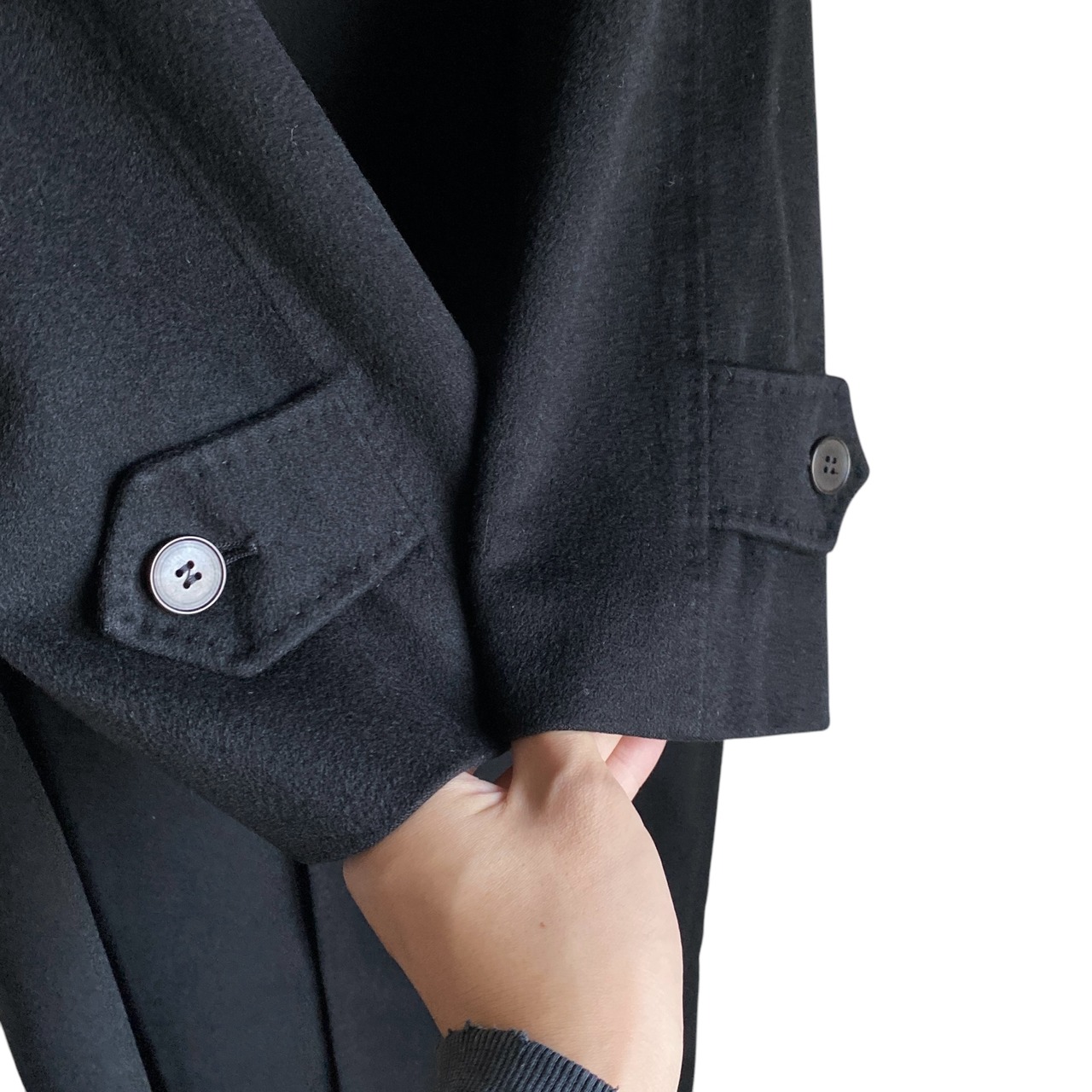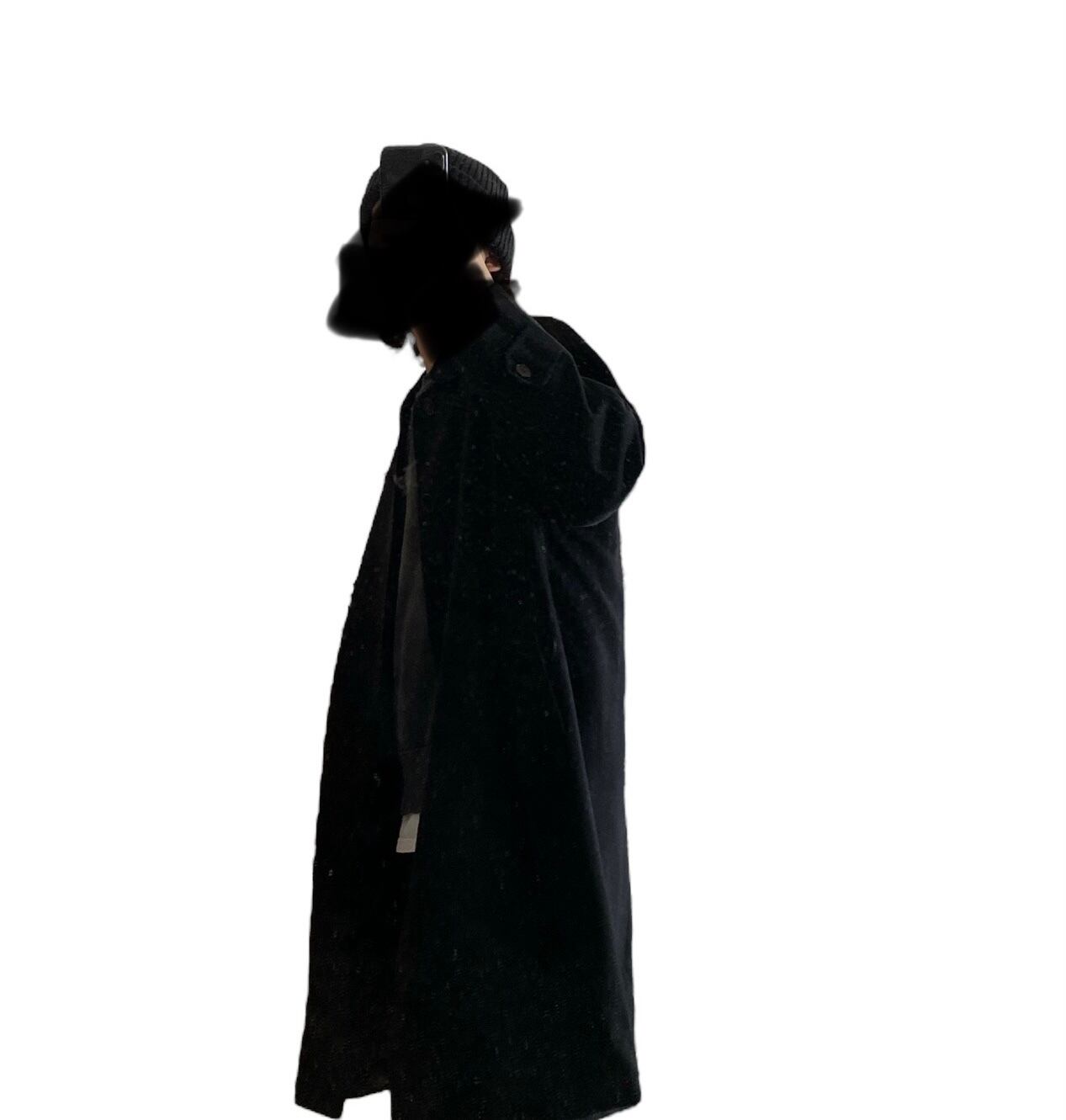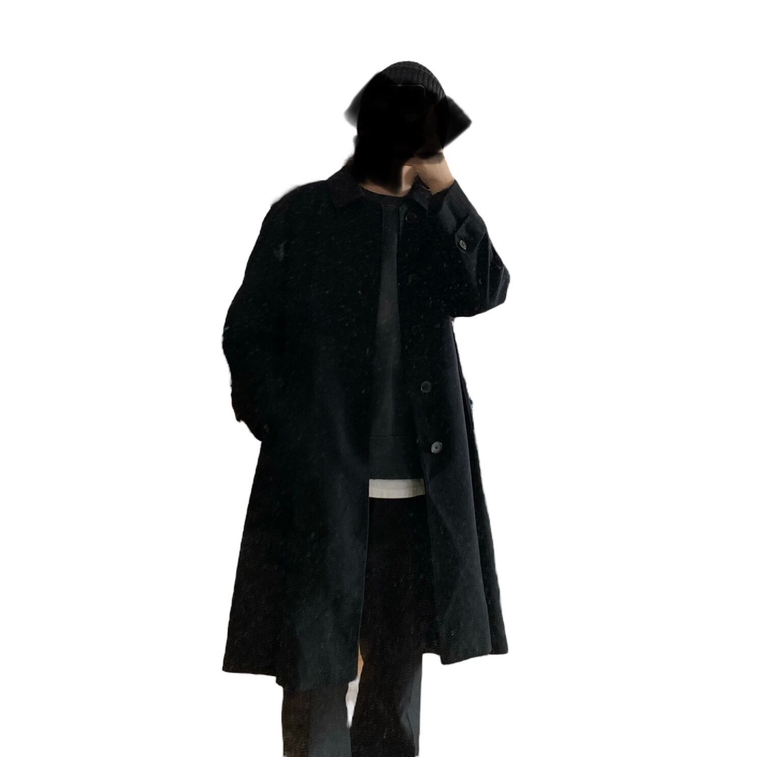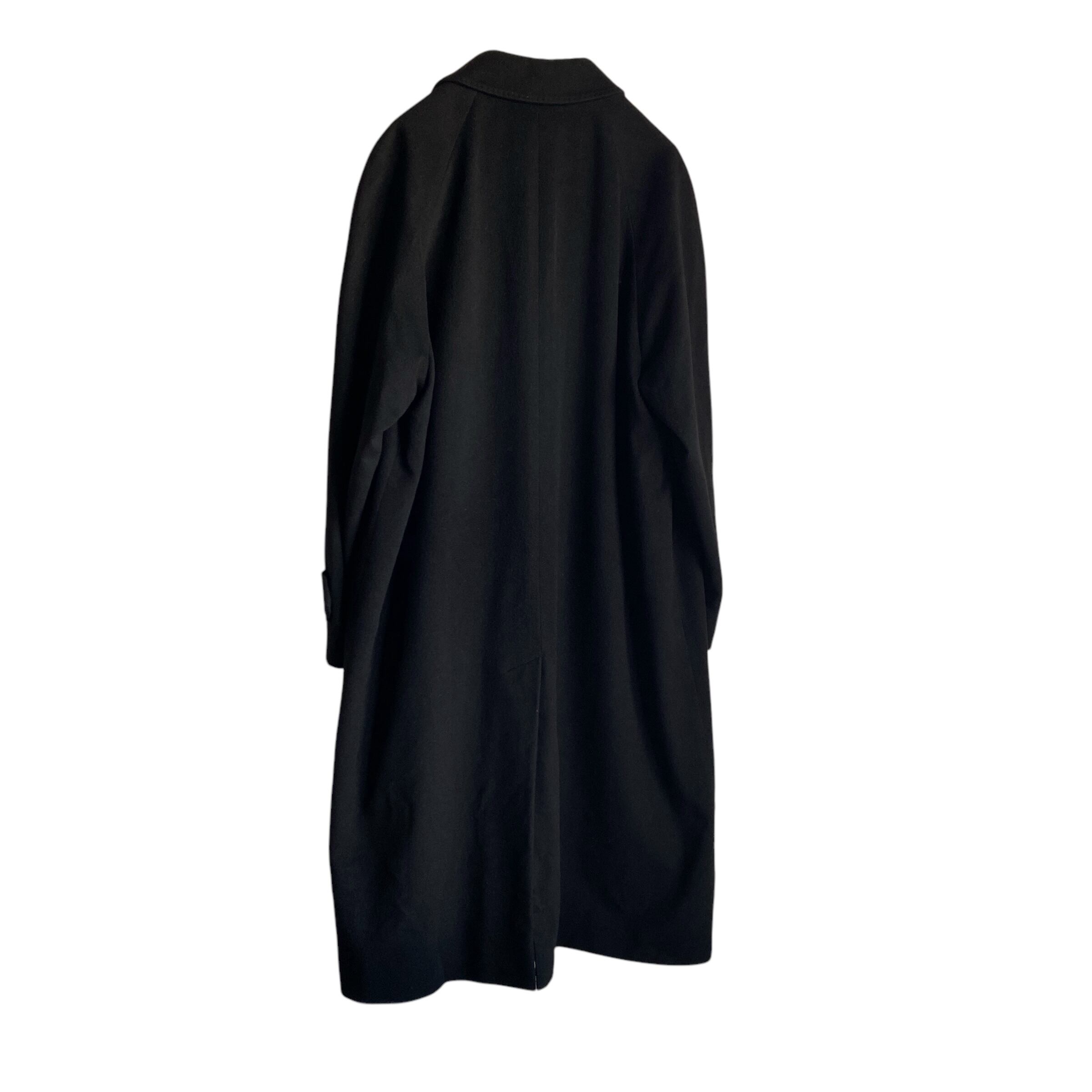 上品な深いブラックの色目に、フラシ系の軽くてしなやかなカシミヤ素材、ロング丈のベーシックなシルエットが非常に格好良い一着。
