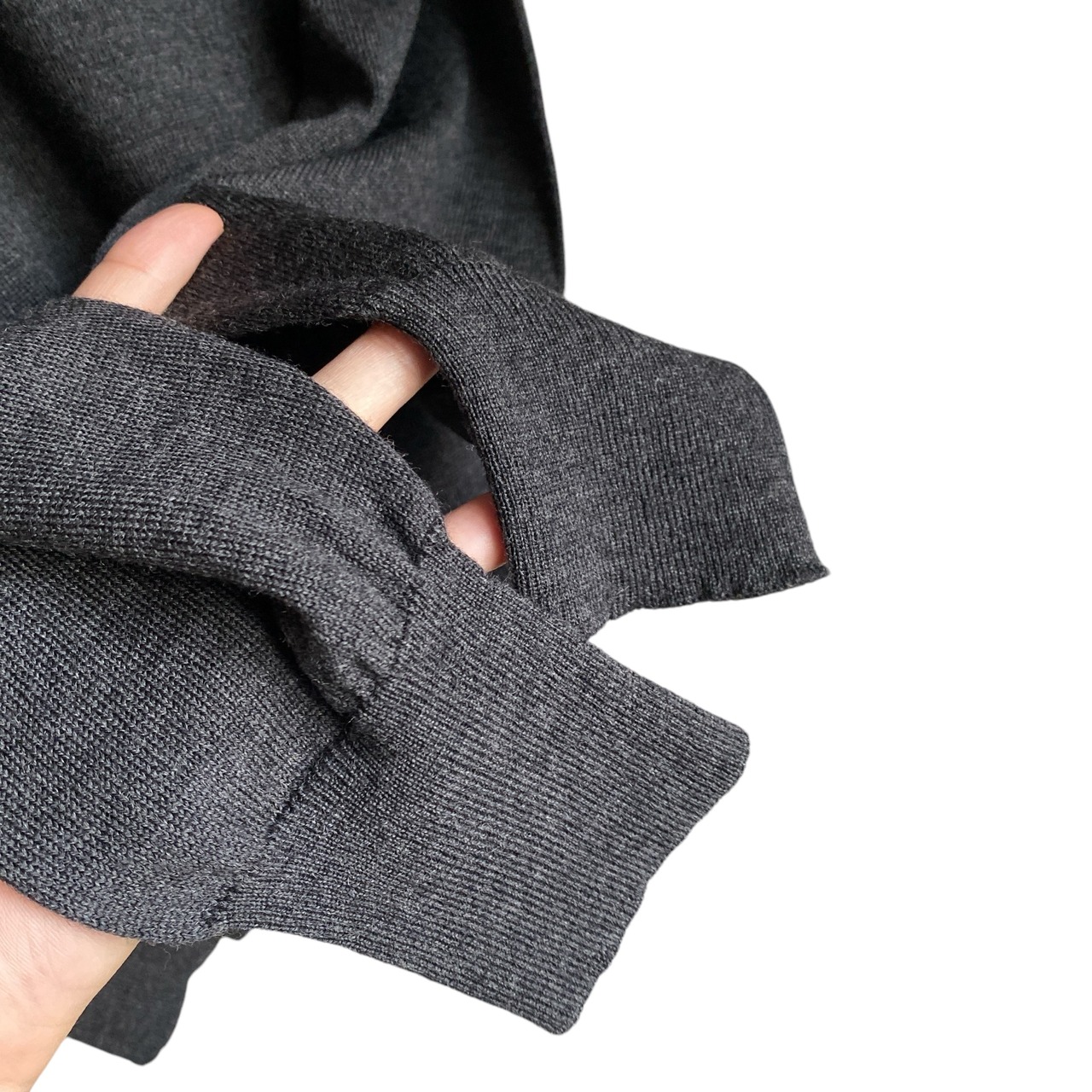 上質で滑らかなハイゲージのメリノウールニットに、上品なチャコールグレーカラー、程よくゆったりとしたベーシックなシルエットが素晴らしい一着。