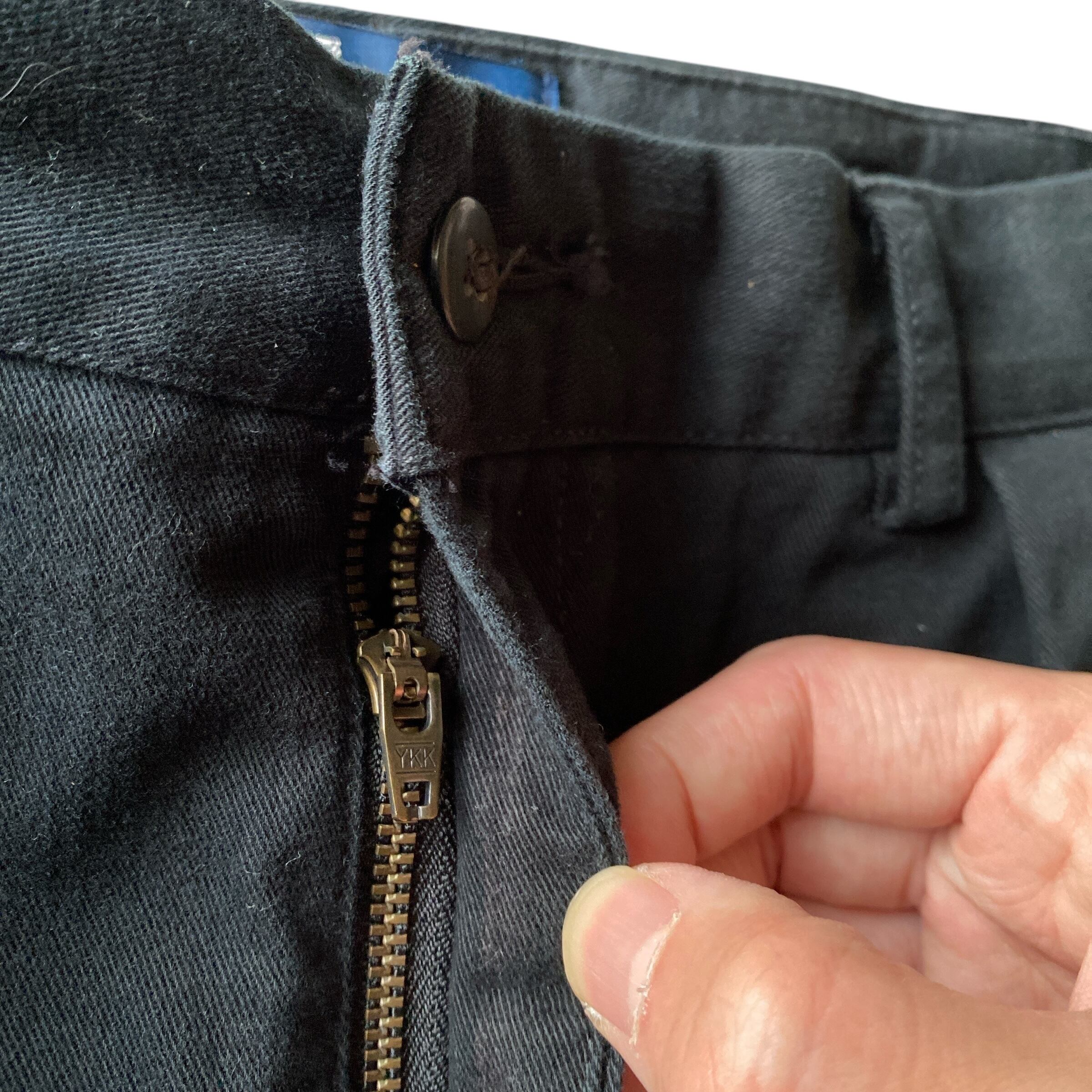 程よく肉厚なコットン100のツイル地に、やや股上深めでワイドテーパードの美しいシルエット、装飾のないミニマルなデザインが非常に格好良い一着。