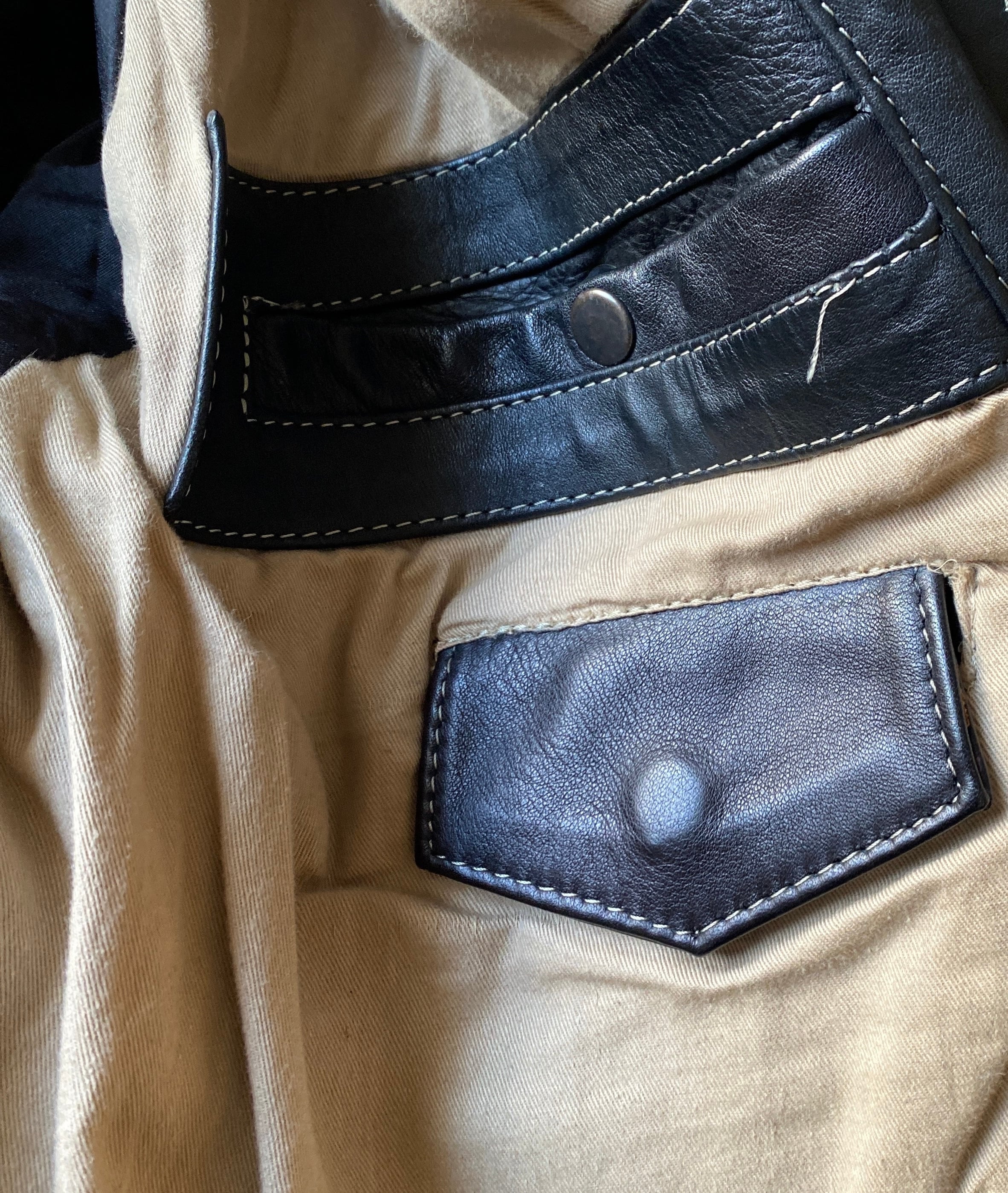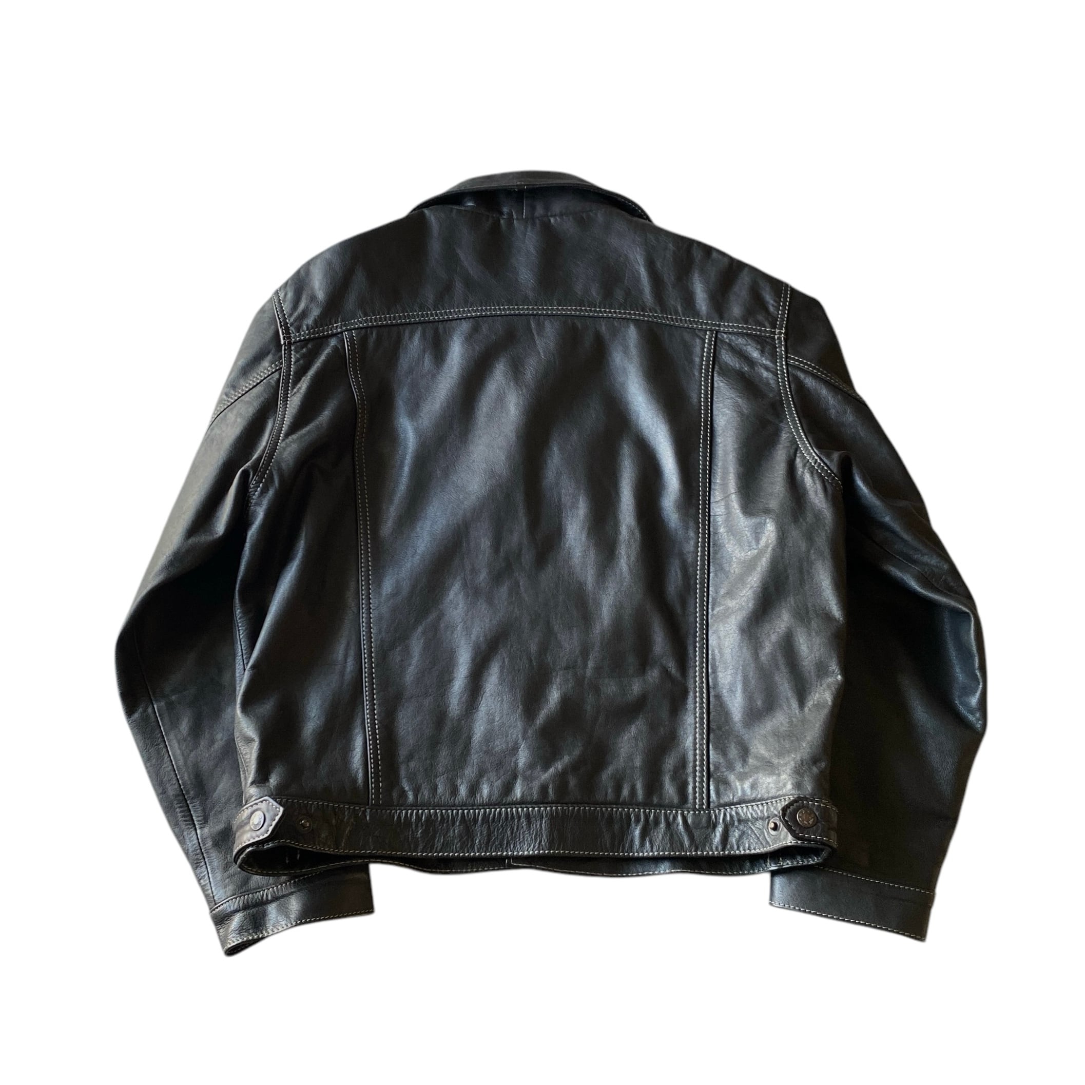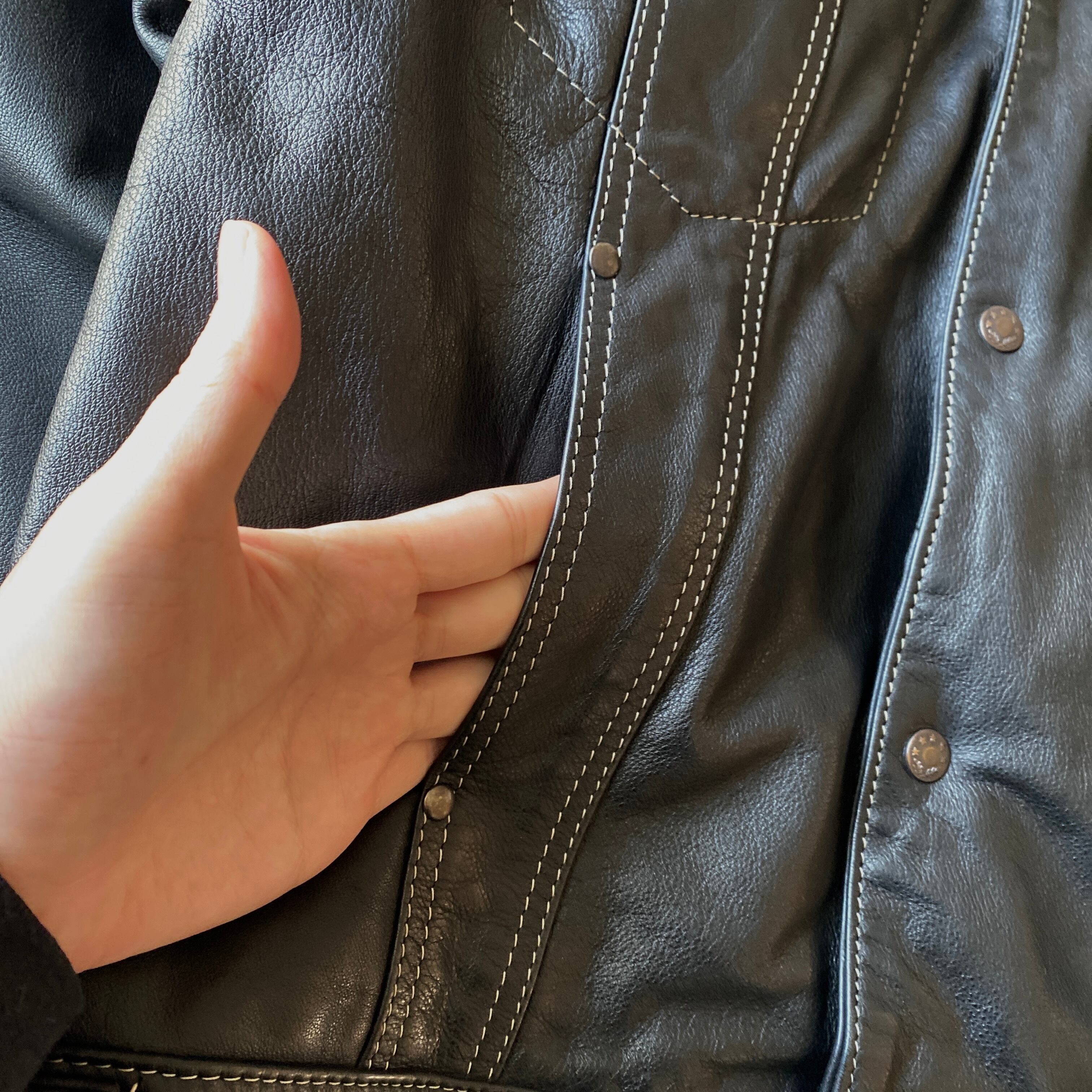 程よく肉厚でしなやかなカウレザー(おそらく)に、ブラックカラーにホワイトのステッチが入る洒落たデザイン、程よくゆとりのある短丈ボックスシルエットが非常に格好良い一着。