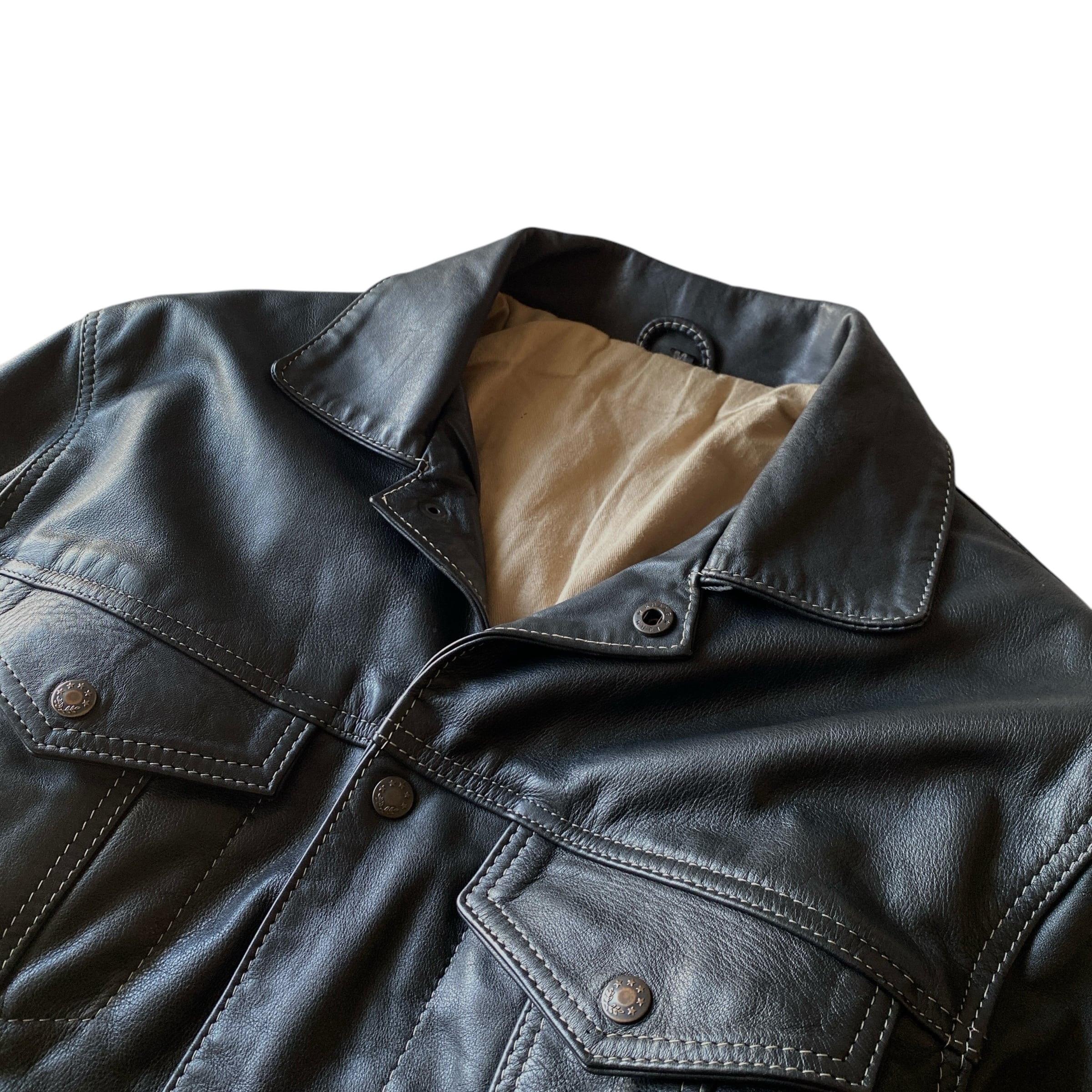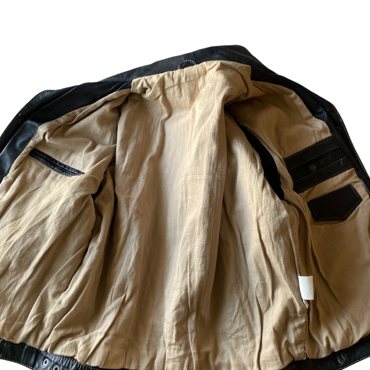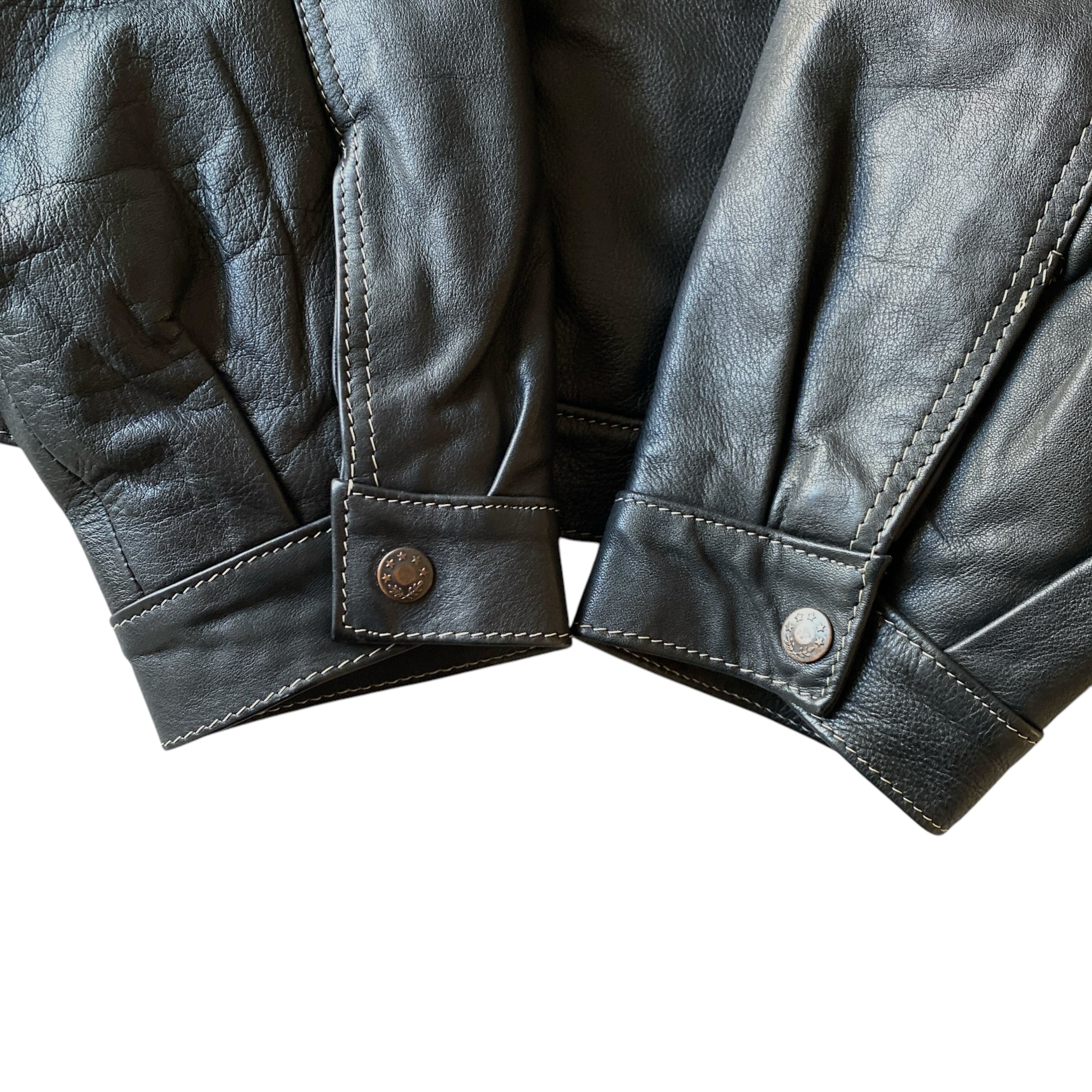 程よく肉厚でしなやかなカウレザー(おそらく)に、ブラックカラーにホワイトのステッチが入る洒落たデザイン、程よくゆとりのある短丈ボックスシルエットが非常に格好良い一着。