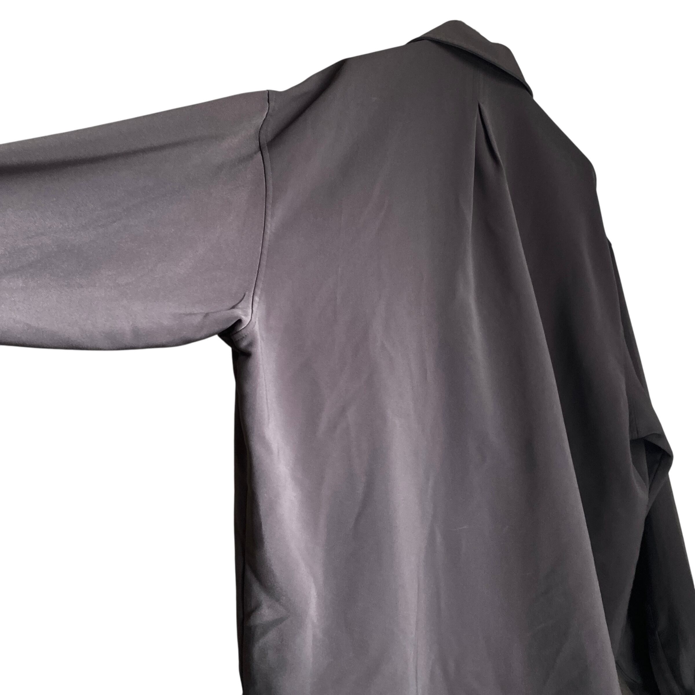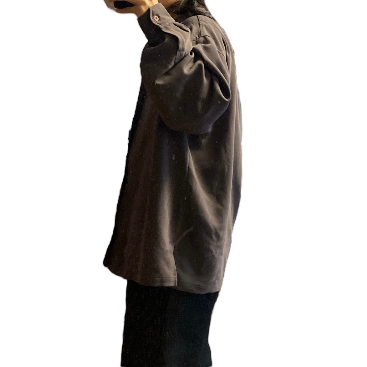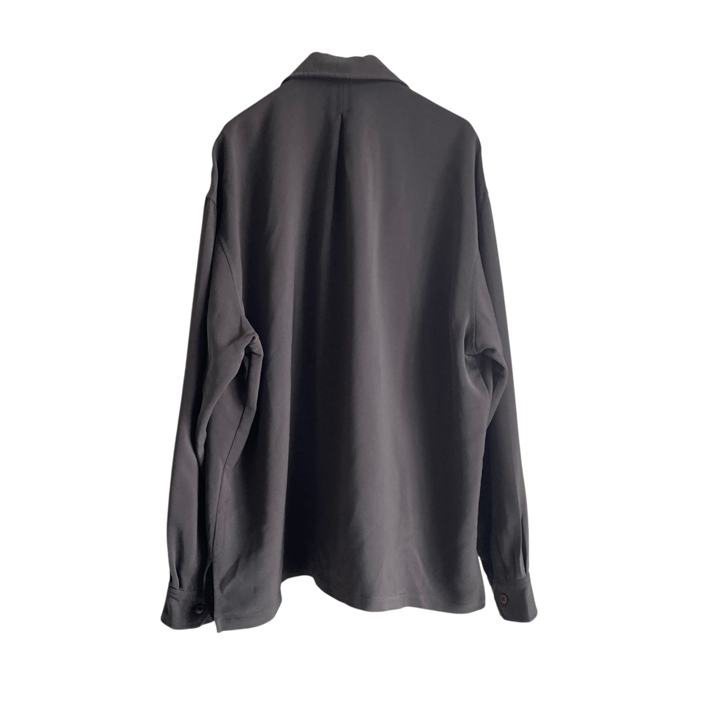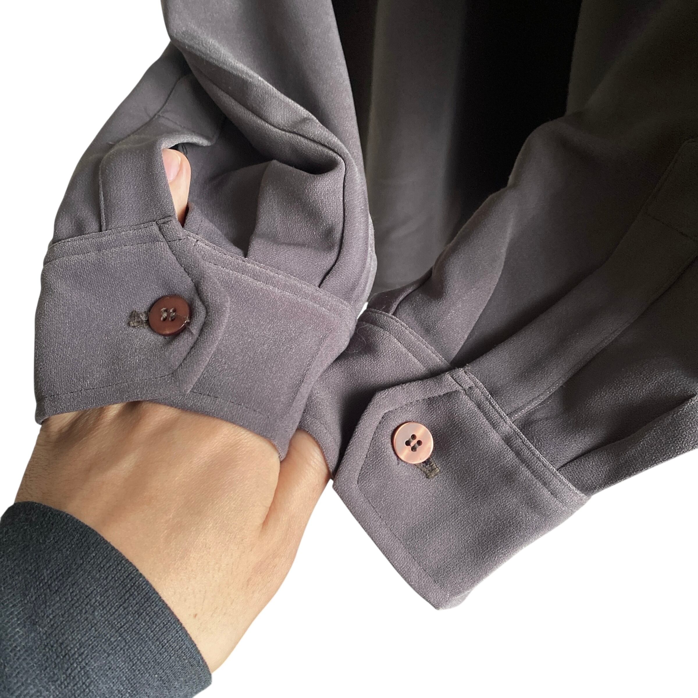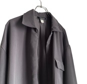 肉厚でとろみのある上質なアセテートレーヨン生地に(品質タグが飛んでいますが、おそらくレーヨンアセテートないしはレーヨンポリエステルだと思われます)、上品なチャコールグレーの色目、ガバッと大きめなボックスシルエットが非常に格好良い一着。