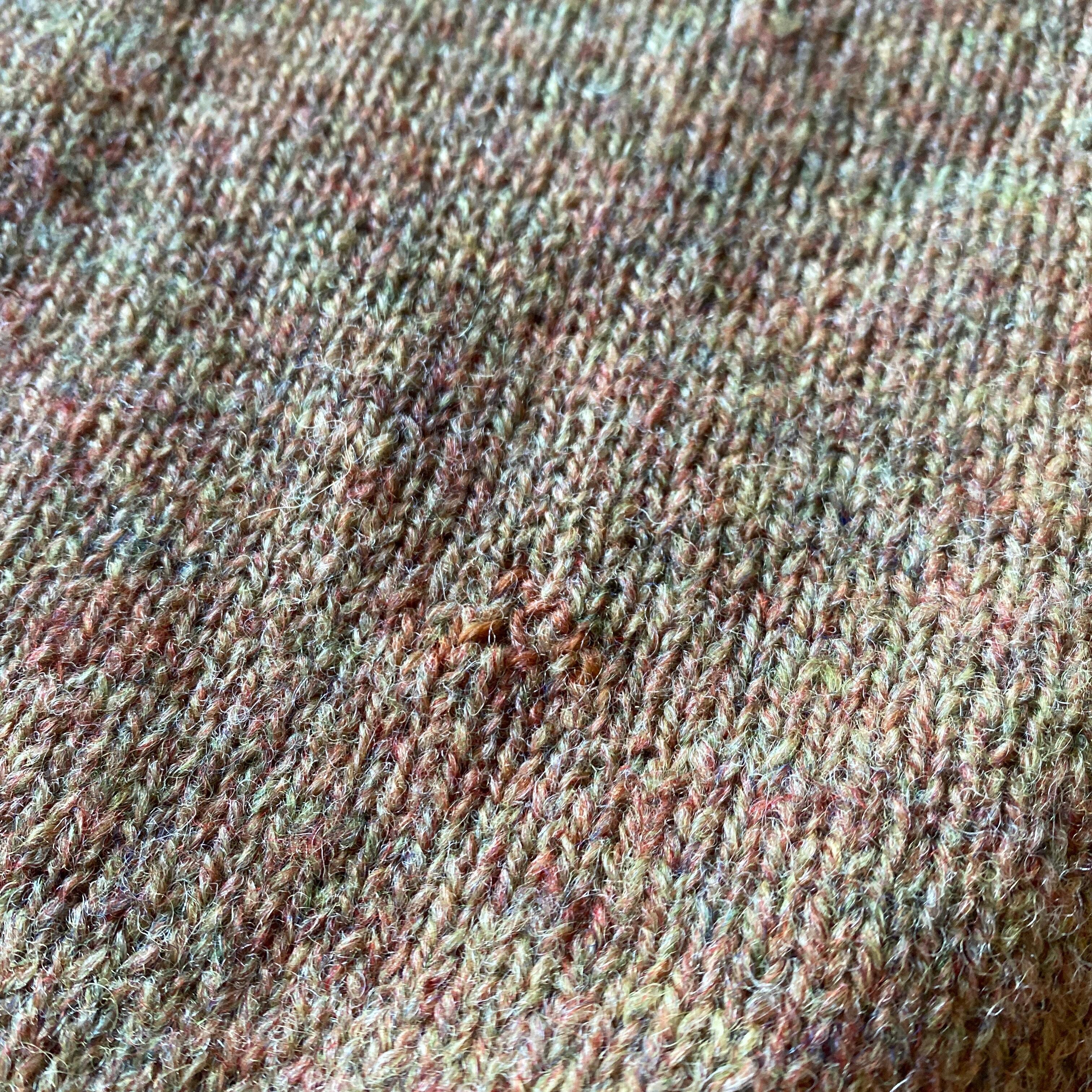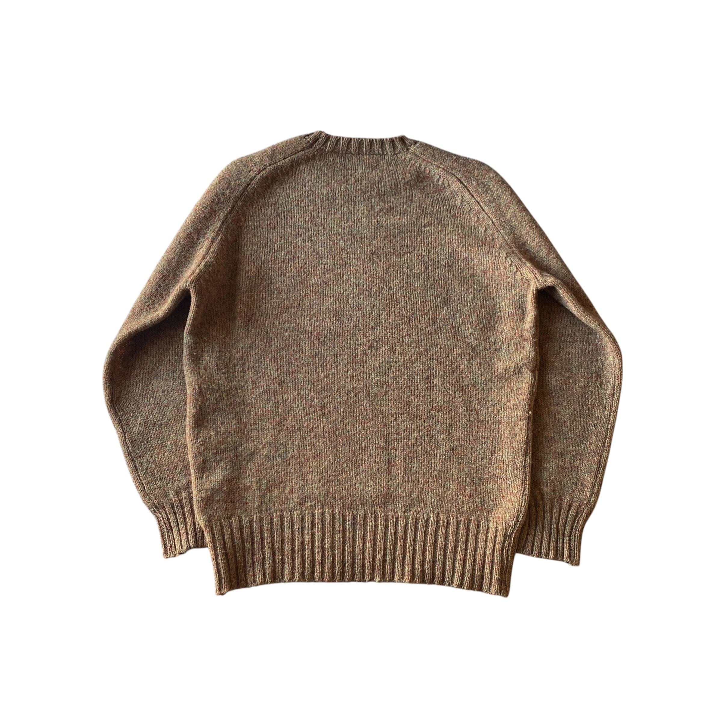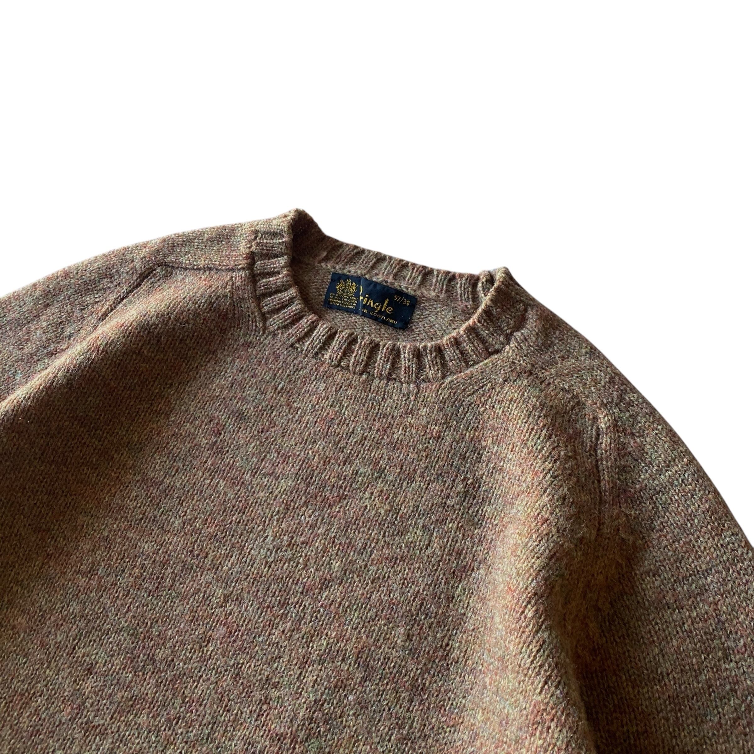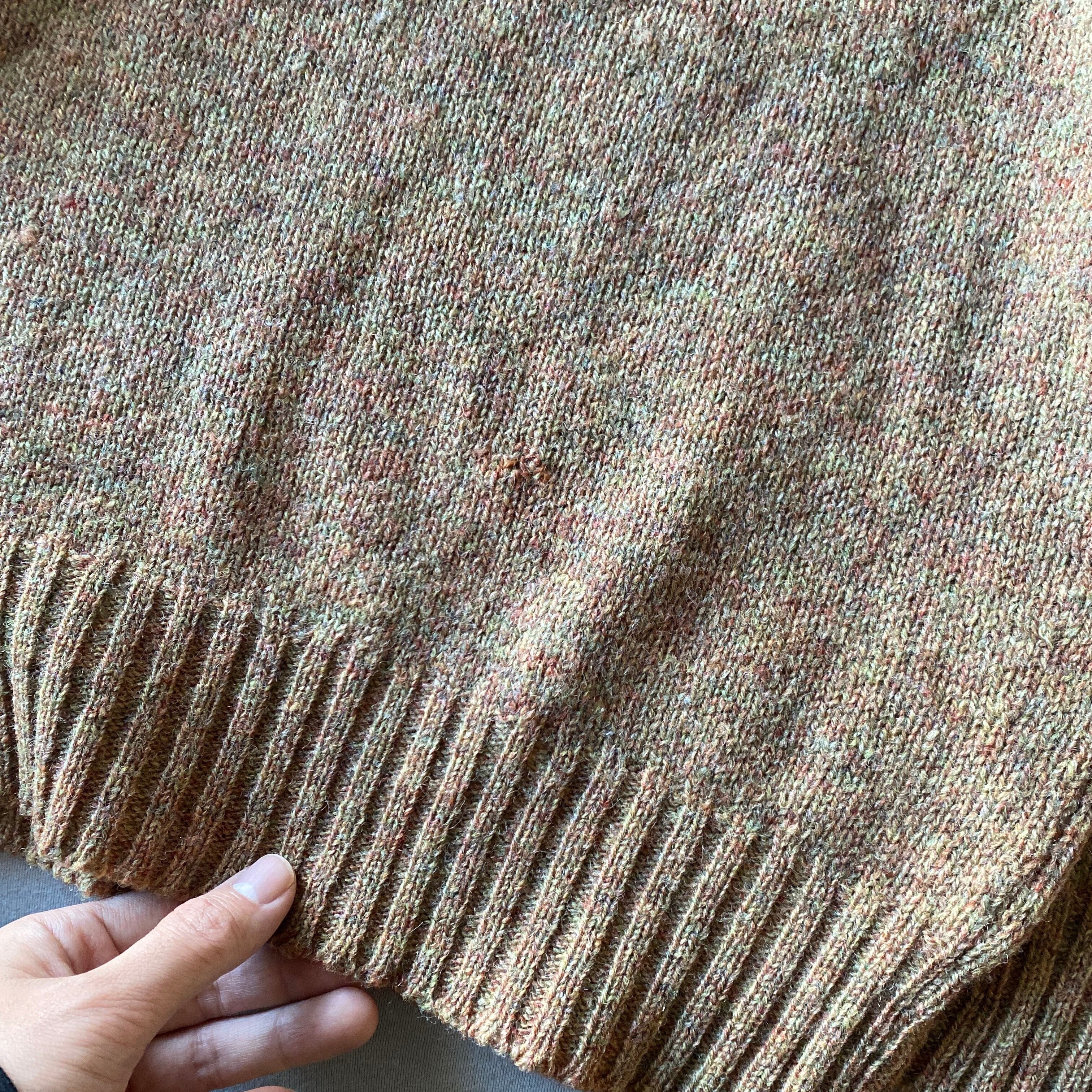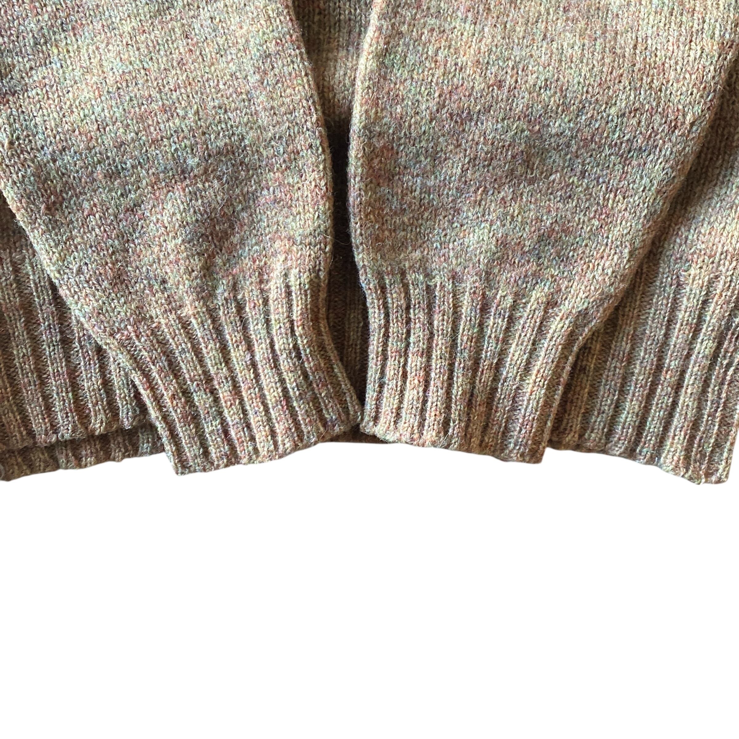 あたたかみのある暖色系のメランジカラーに、シェットランドウール特有の肉厚でフワッと空気を含んだような素材感が素晴らしい一着。
