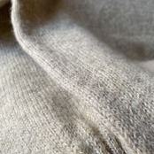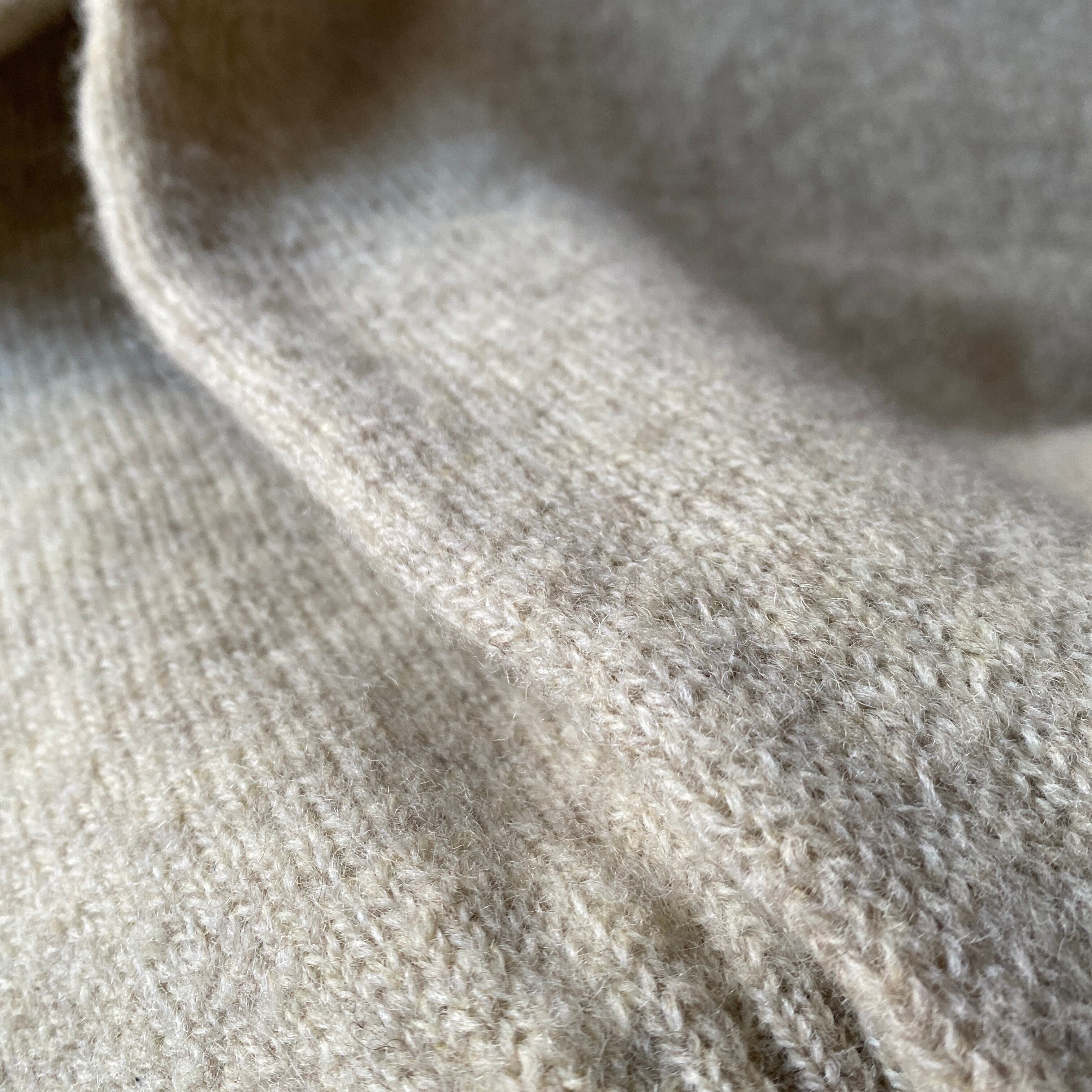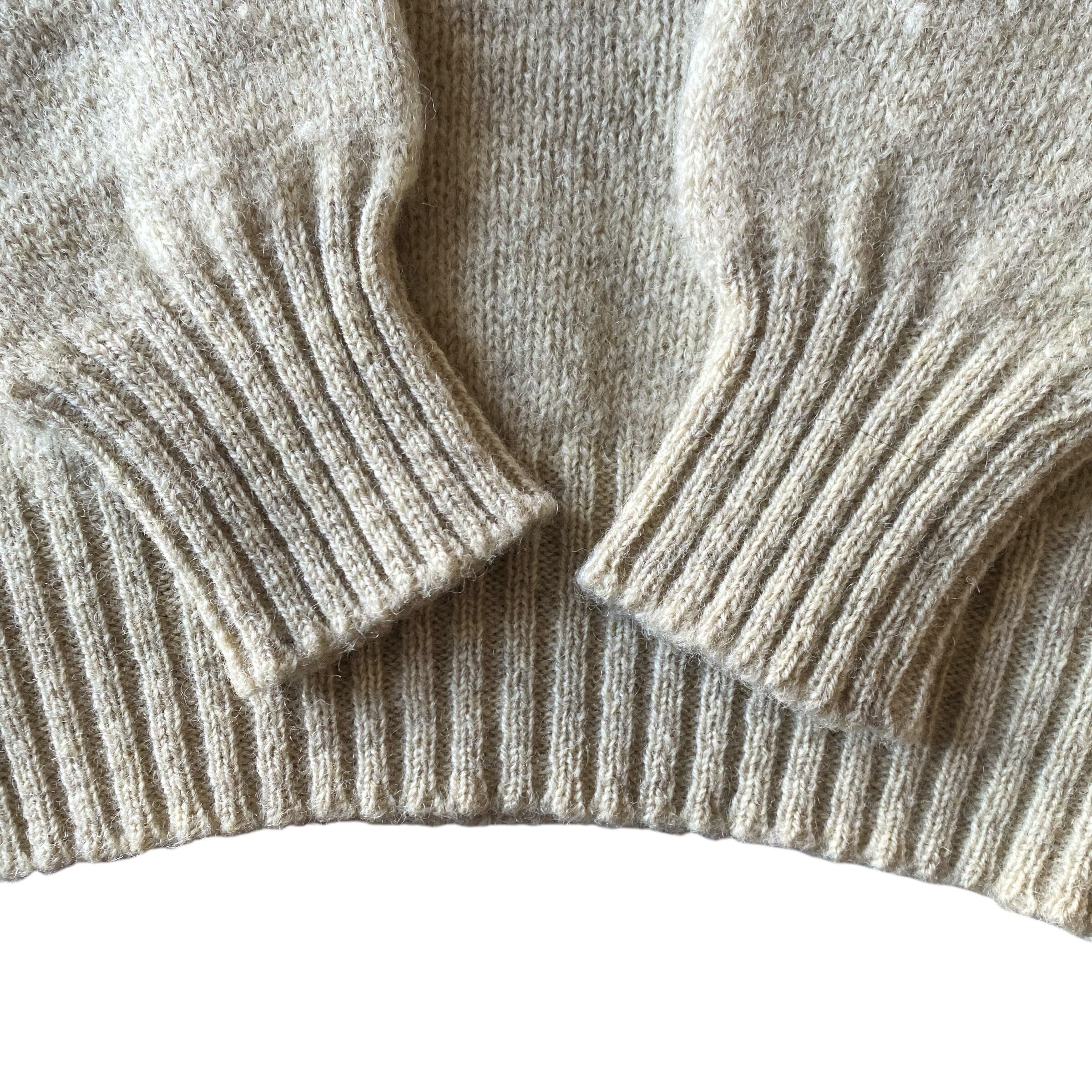 エクリュ系のメランジカラーに、シェットランドウール特有の肉厚でフワッと空気を含んだような素材感が素晴らしい一着。